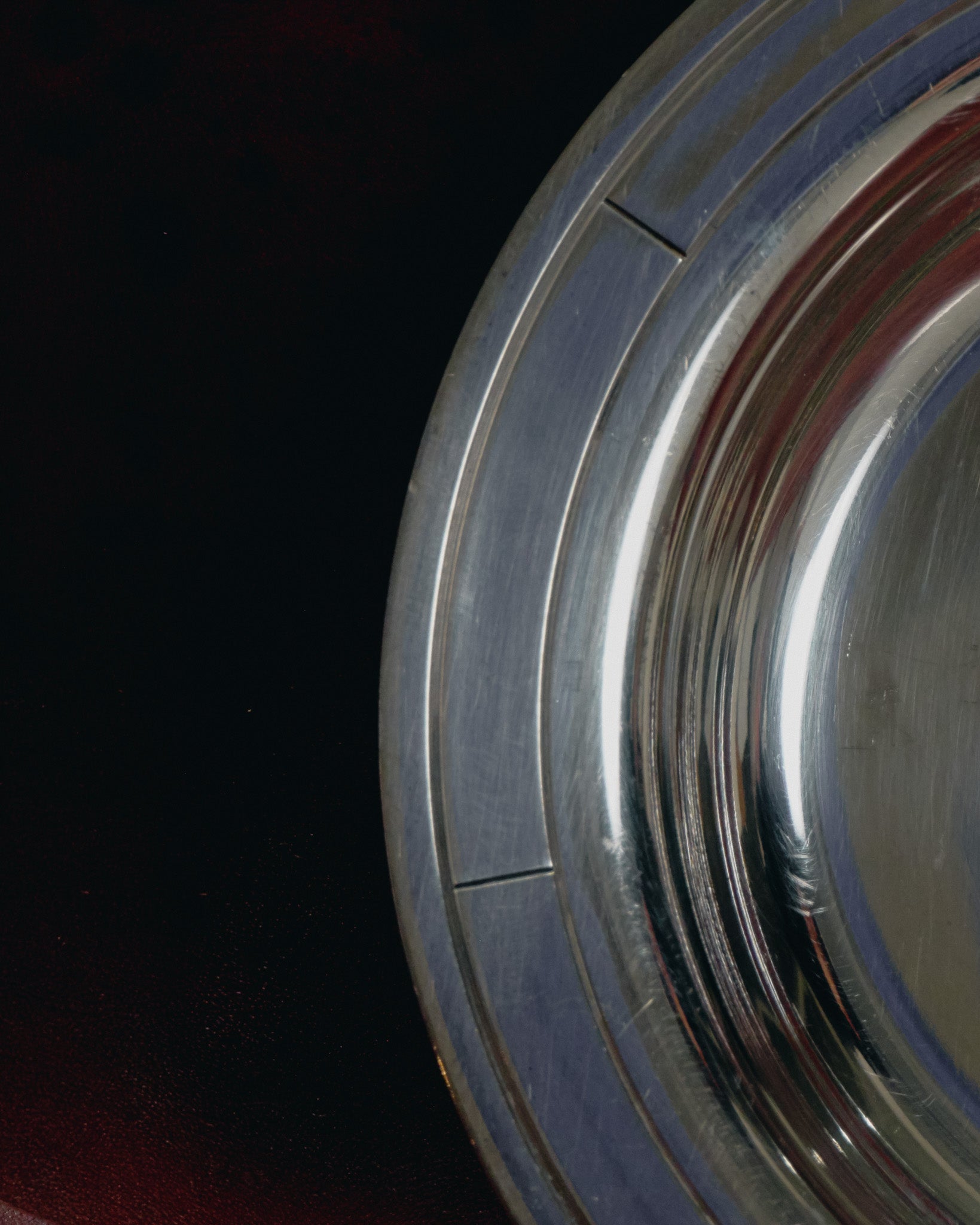 Assiette à pâtée pour petit chien ou chat, en métal argenté. Le bord est décoré d'un décor géométrique gravé, rythmé de traits fins et réguliers typiques des productions Ercuis. La pièce présente une silhouette plate avec un bassin légèrement creux, idéale pour la pâtée ou les repas humides.
