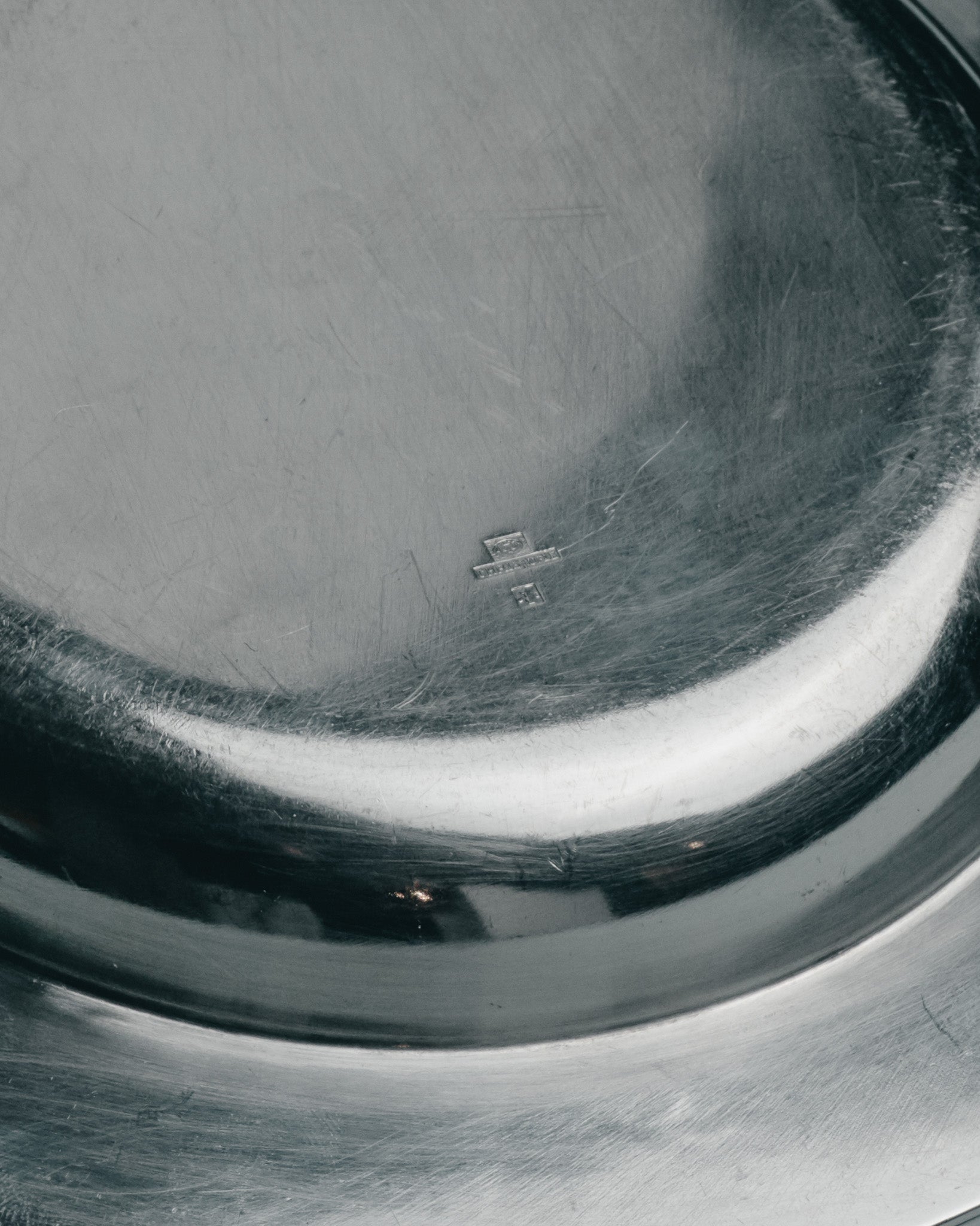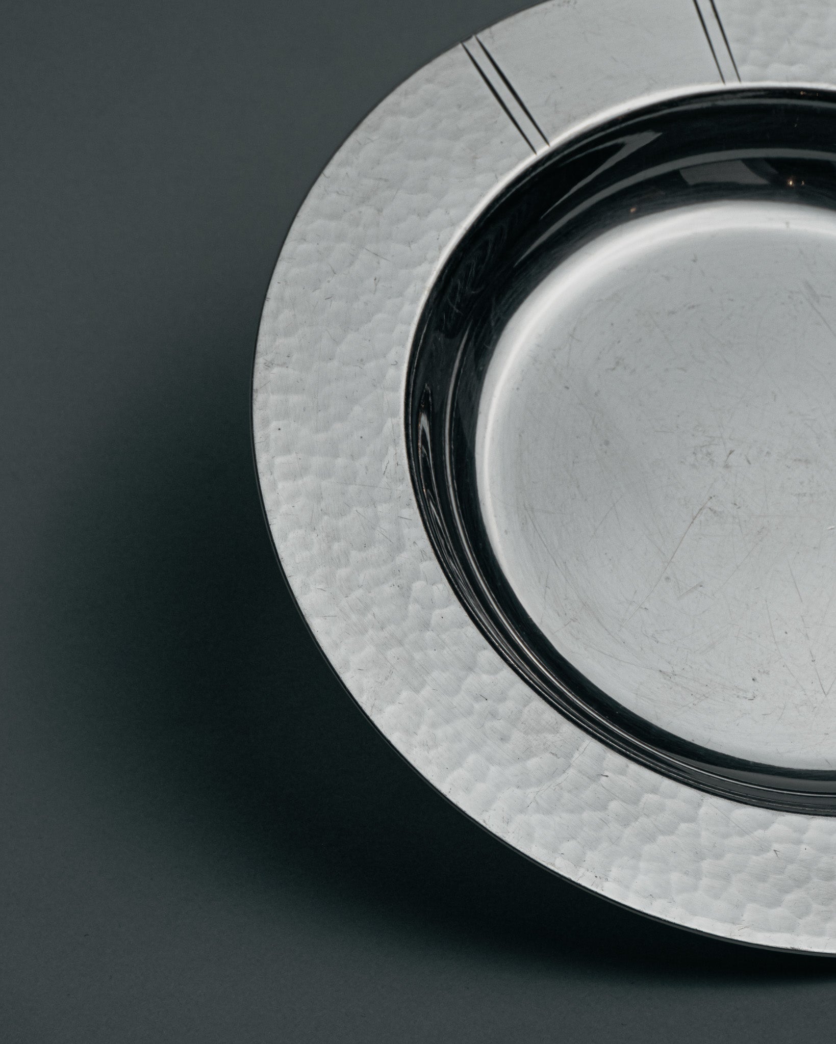 Assiette à pâtée en métal argenté pour petit/moyen chien ou chat. Le bord présente un décor martelé régulier, caractéristique du travail de l'orfèvrerie française des années 1960. Poinçonnée Christofle au revers. Bon état général, présentant de légères traces d'usage conformes à l'âge.