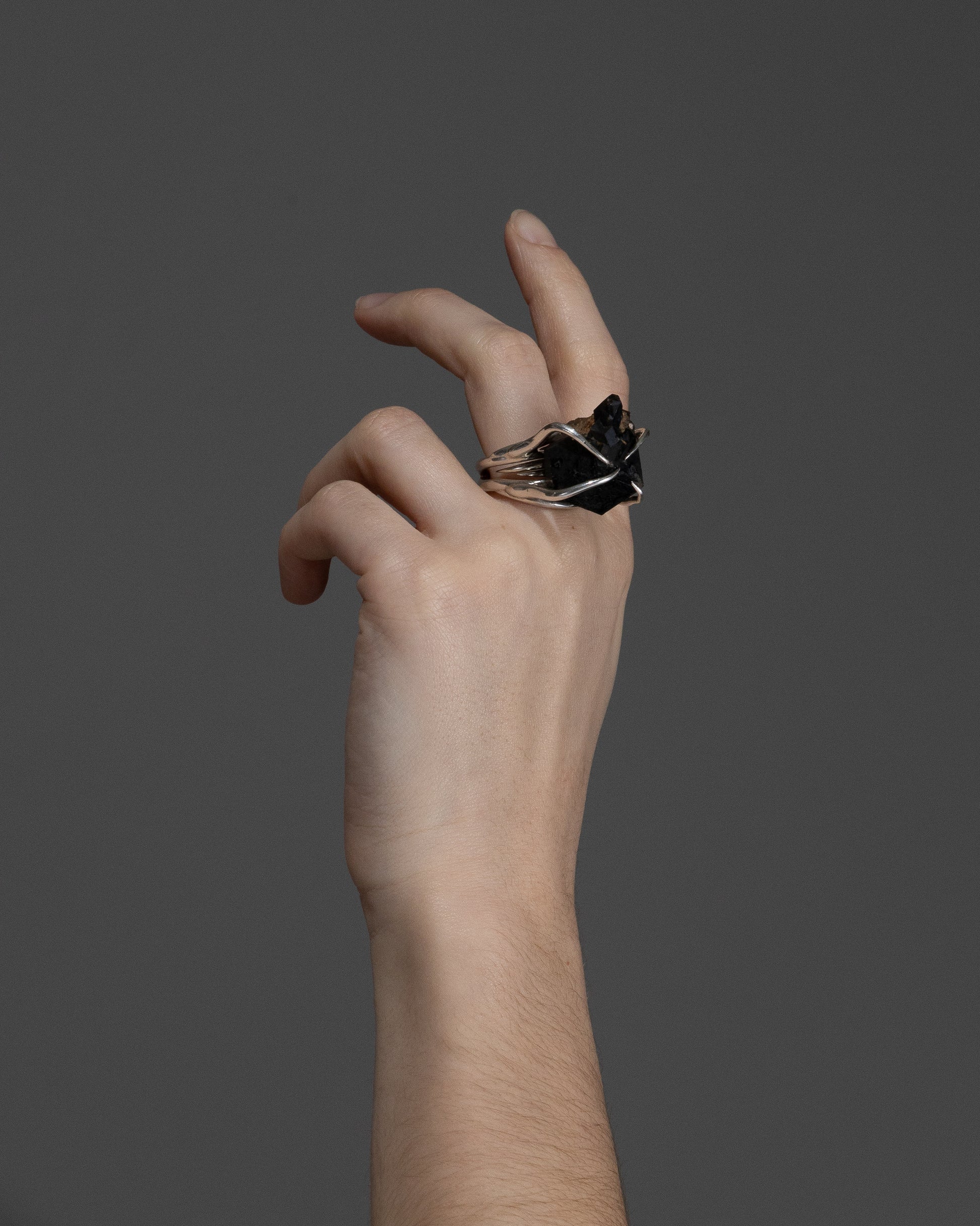 Grande bague en argent massif 950 et tourmaline, signée Jacques Moniquet. La bague est ornée d'une imposante pierre naturelle de Tourmaline, maintenue par de fines griffes d'argent qui mettent en valeur le relief naturel et inégal de la pierre. Taille 61.