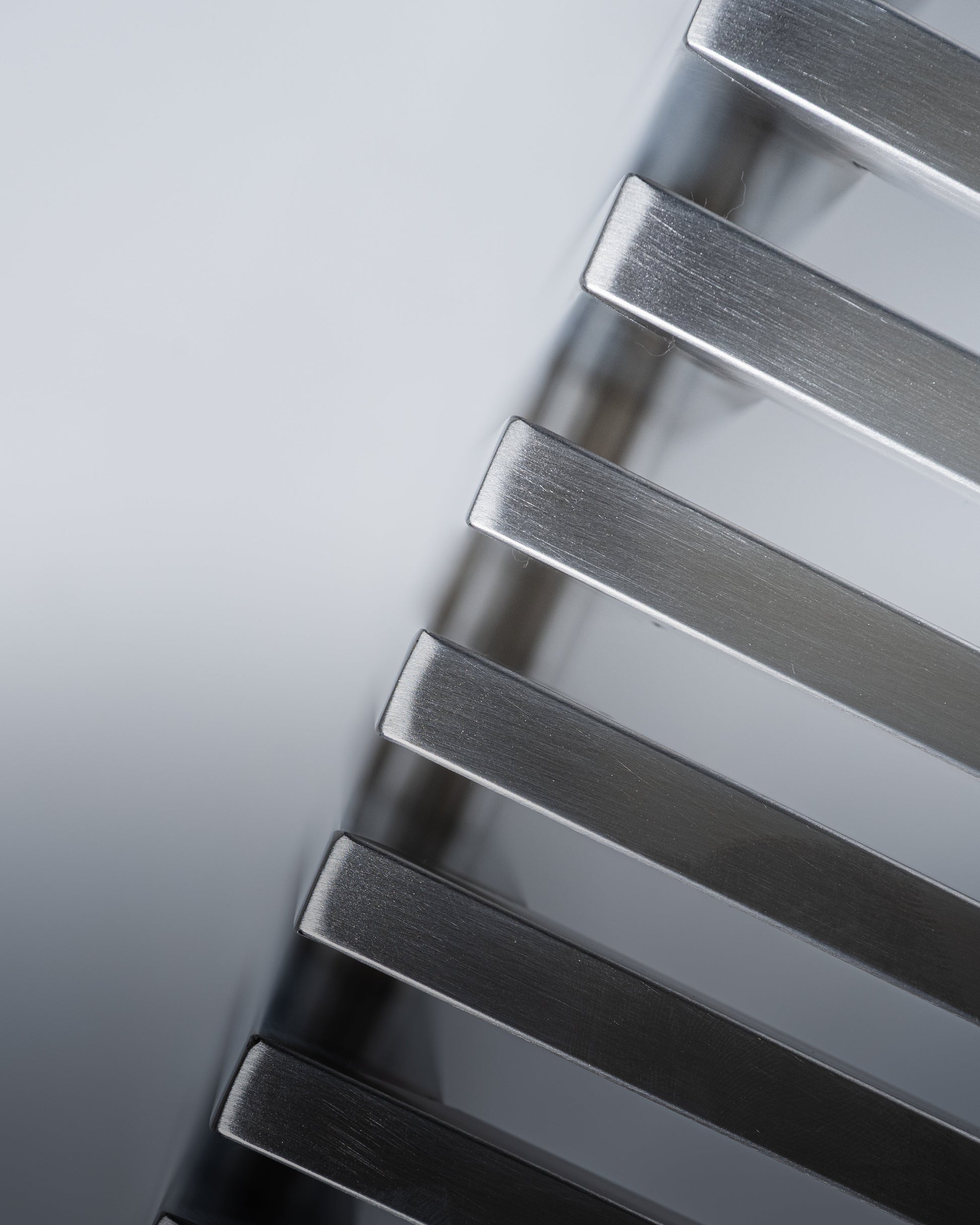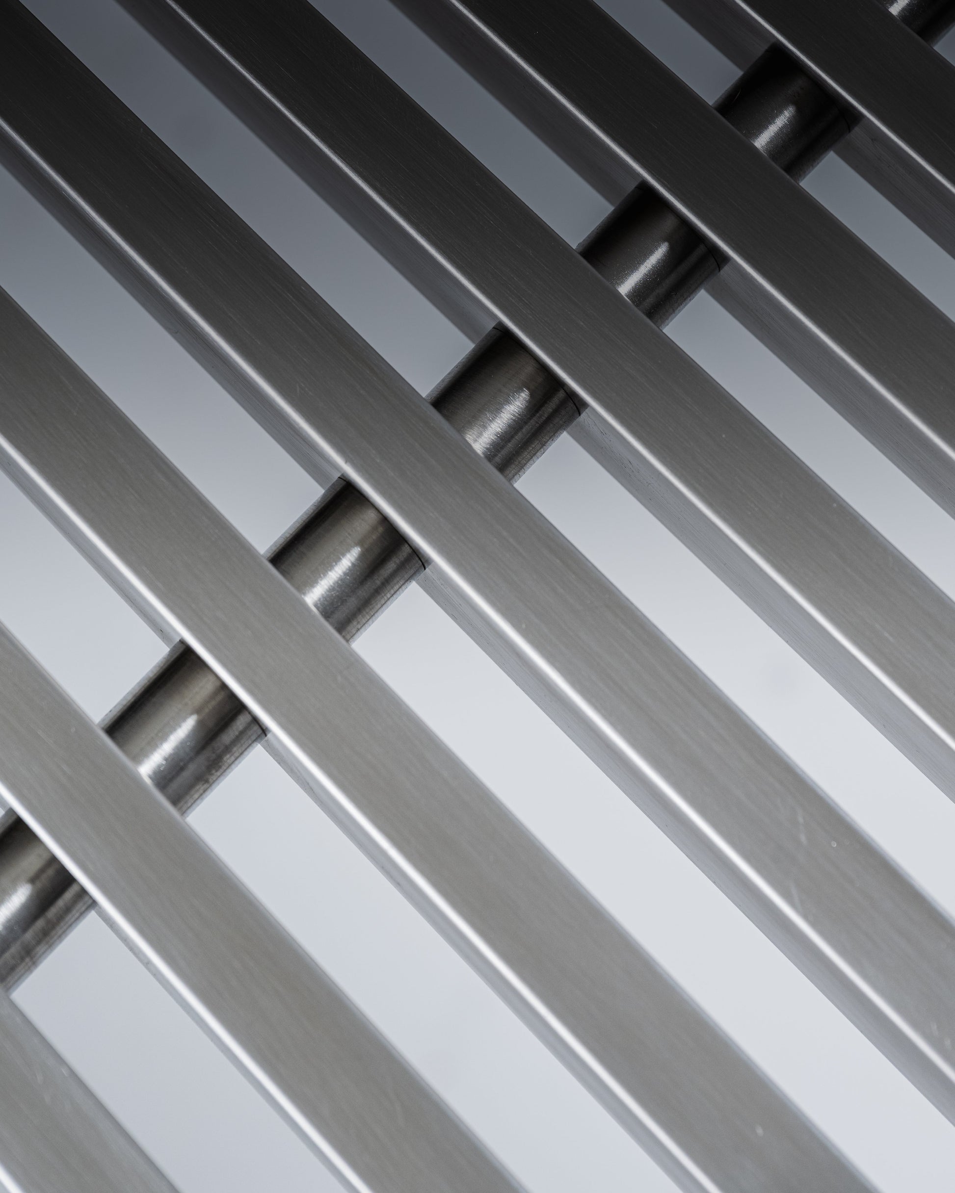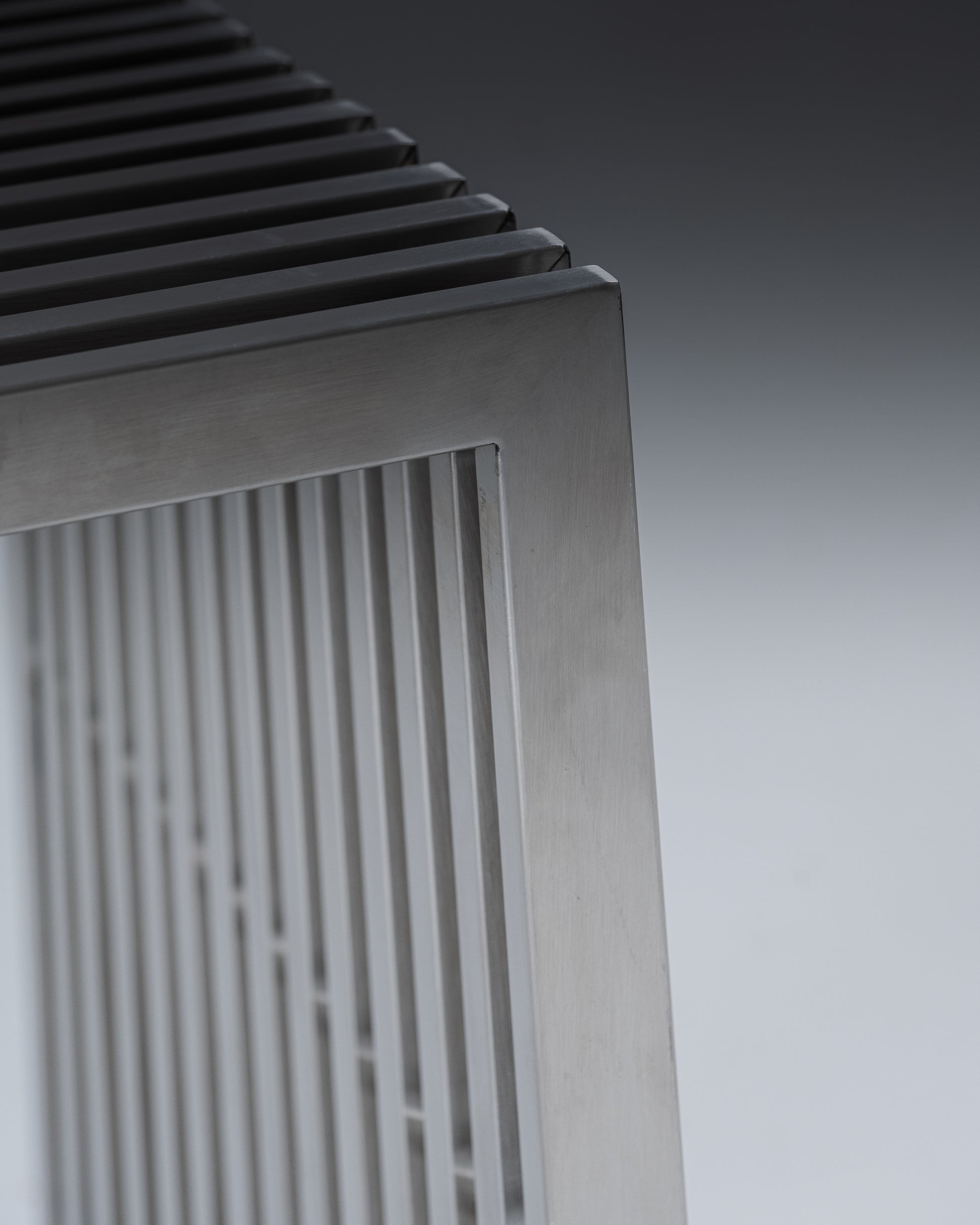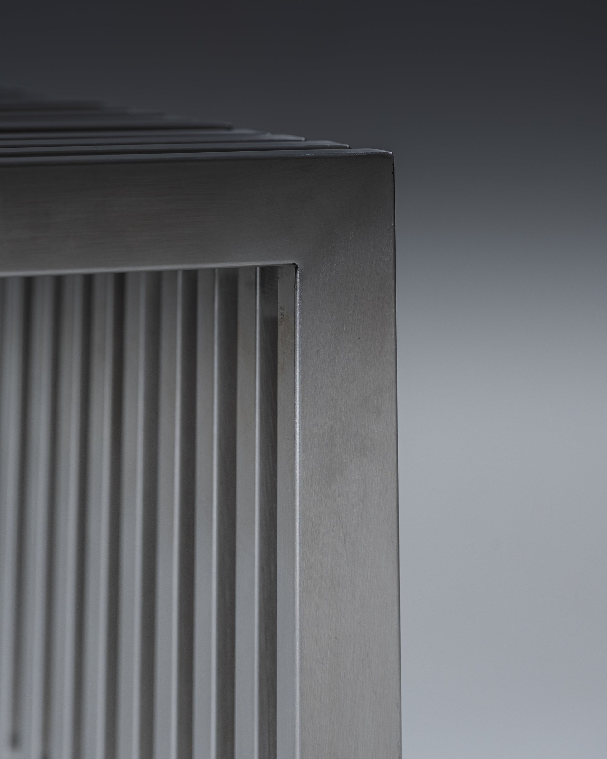Banc moderniste en acier inoxydable, dans le goût de Milo Baughman. Chaque banc présente des irrégularités liées au processus de fabrication qui lui confère re une identité unique.