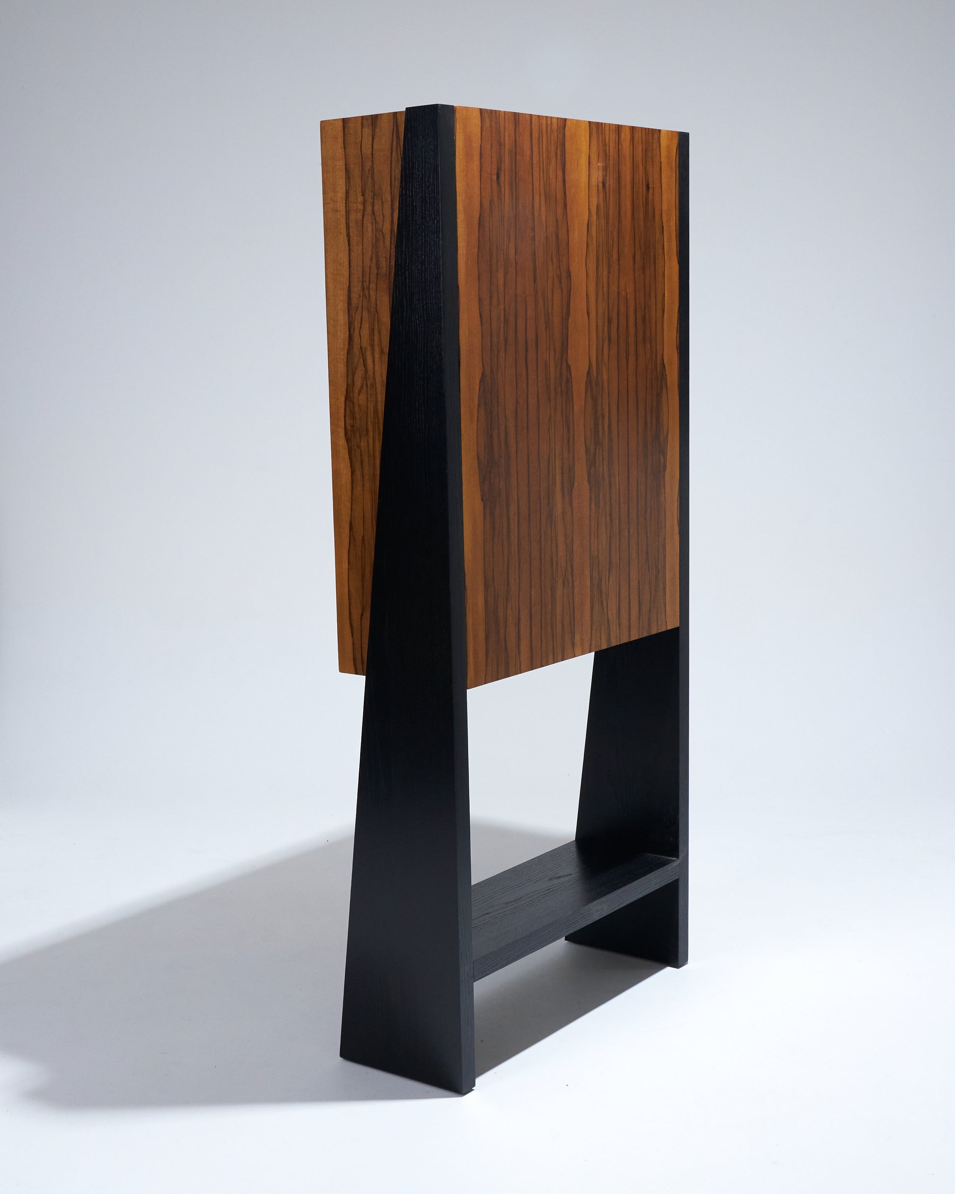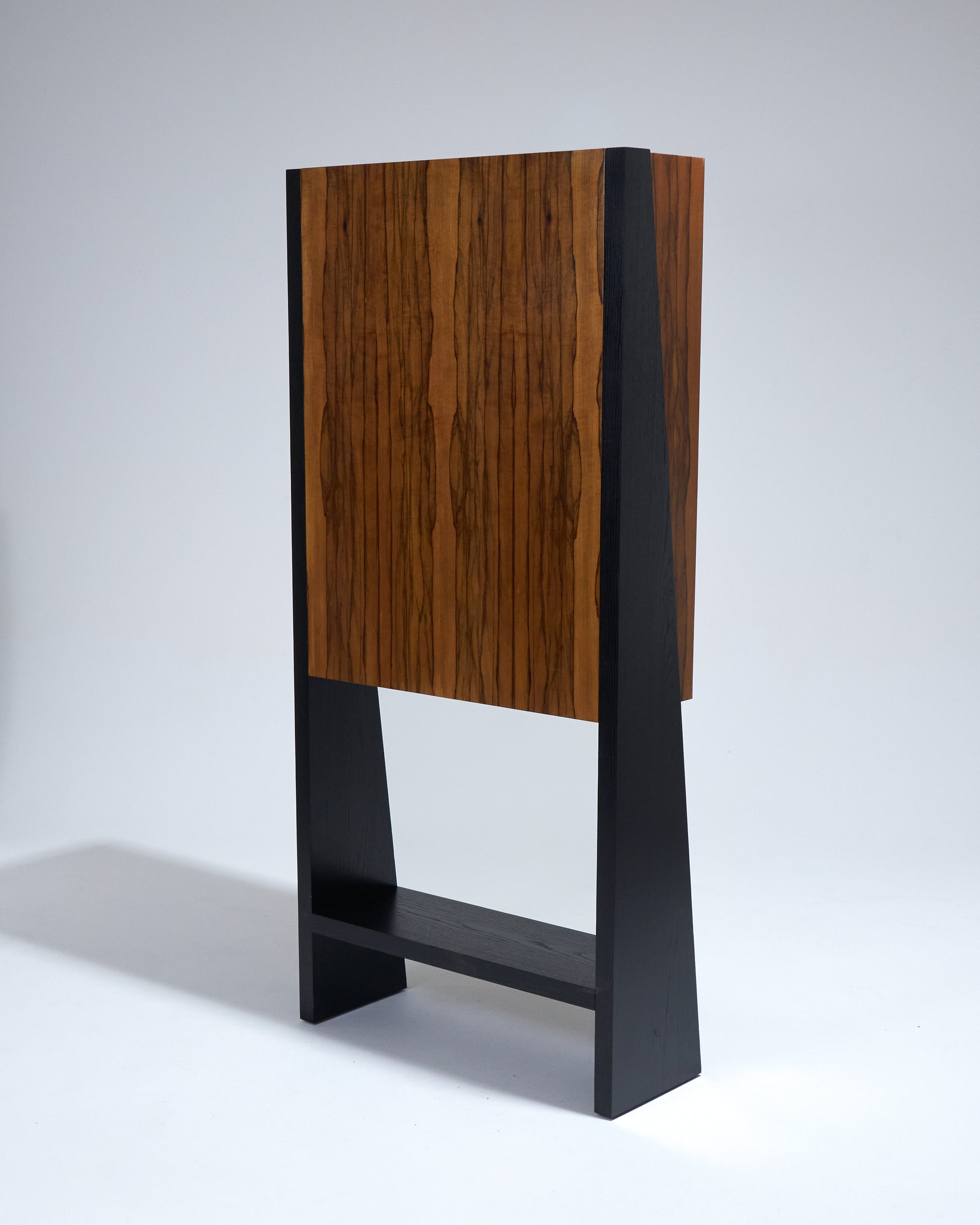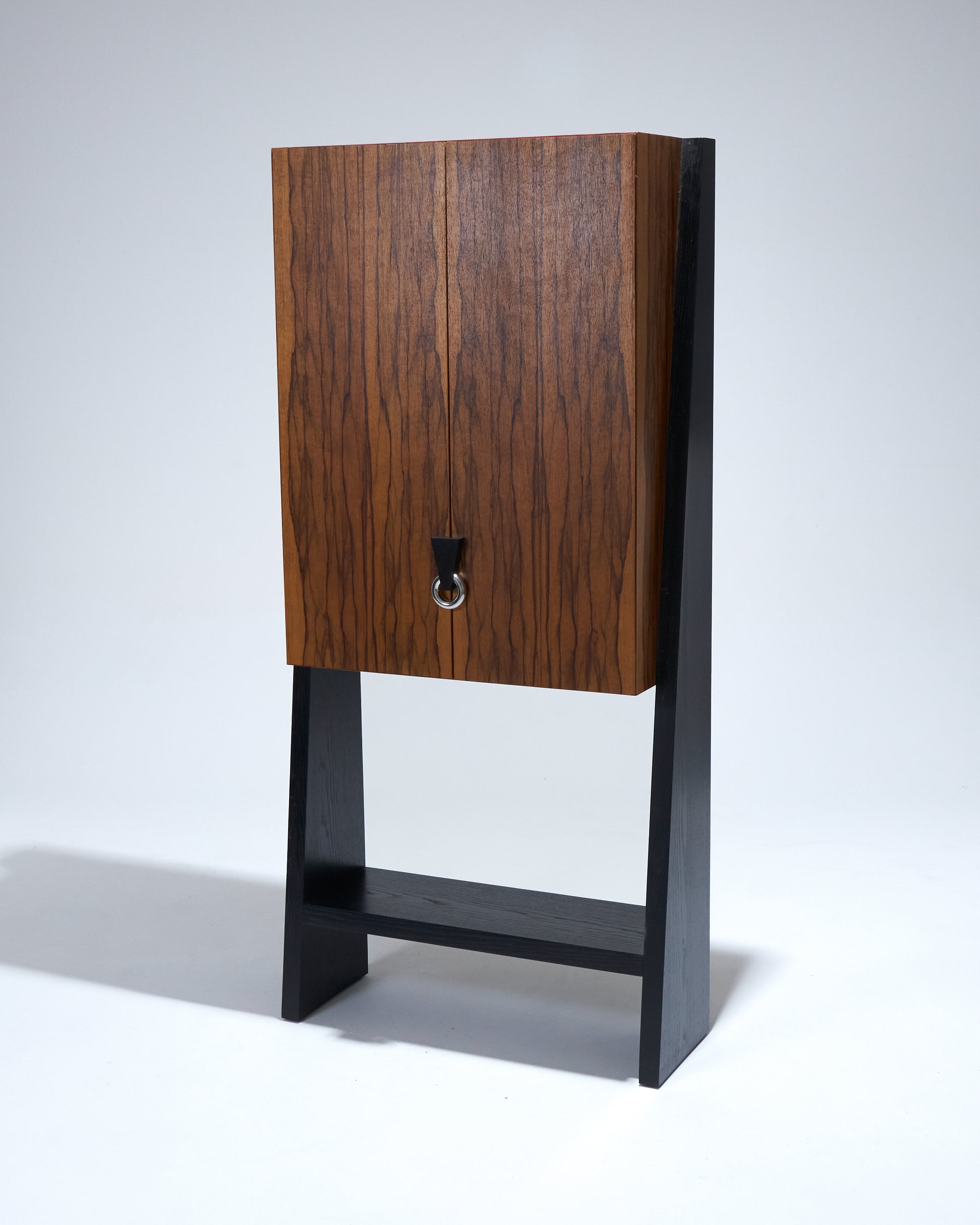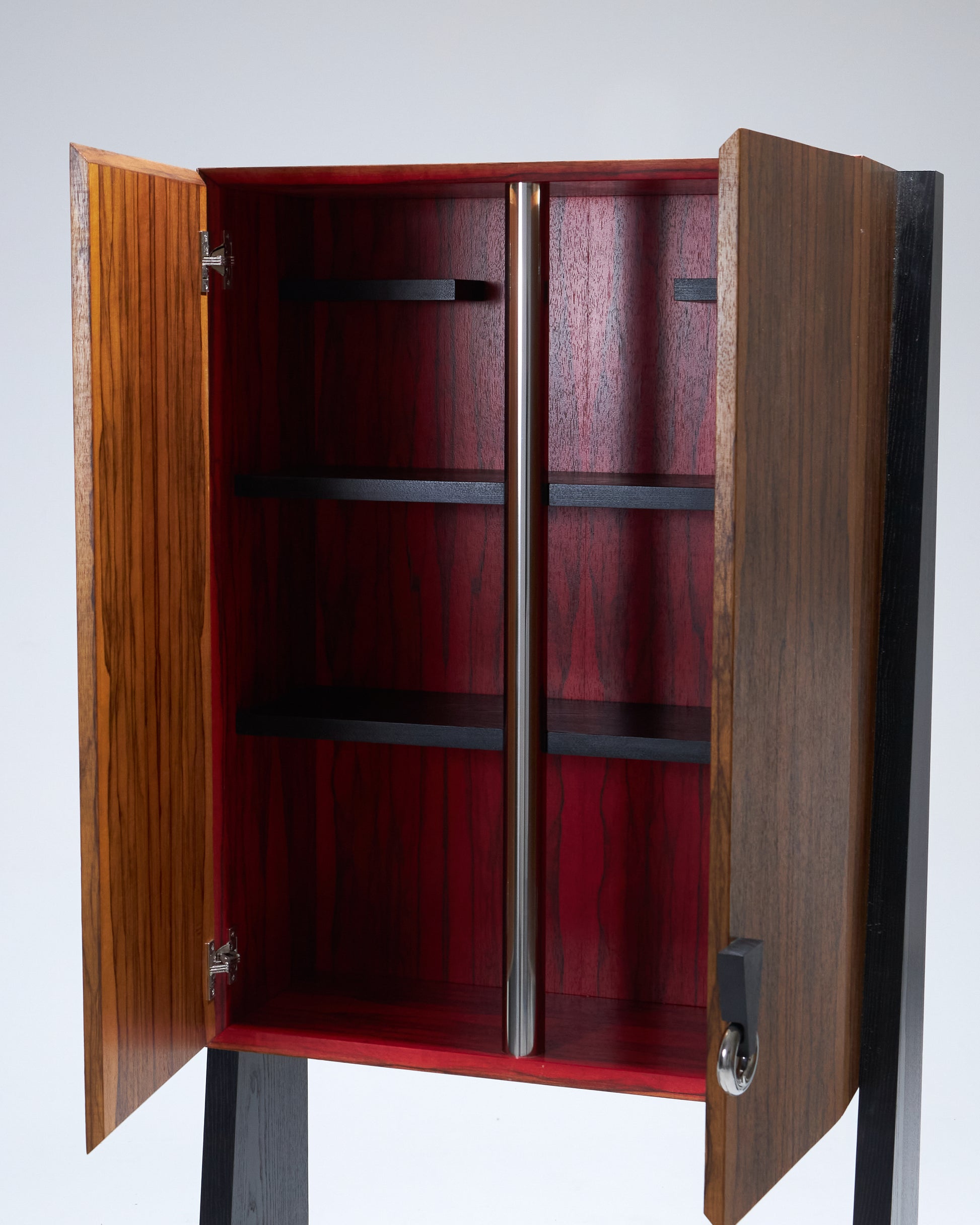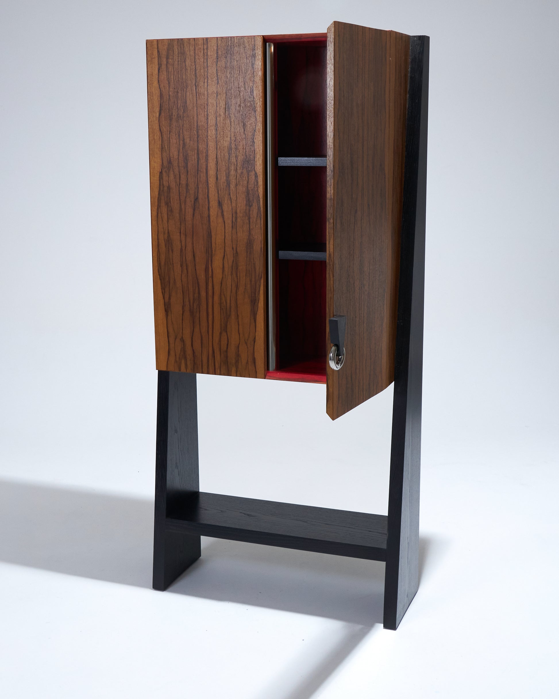 Meuble bar Homme Debout "BHD01", en frêne massif teinté noir et caisson en placage de fraké teinté noisette et rouge. Finition satinée. Montant intérieur et poignée en acier inoxydable chromé.