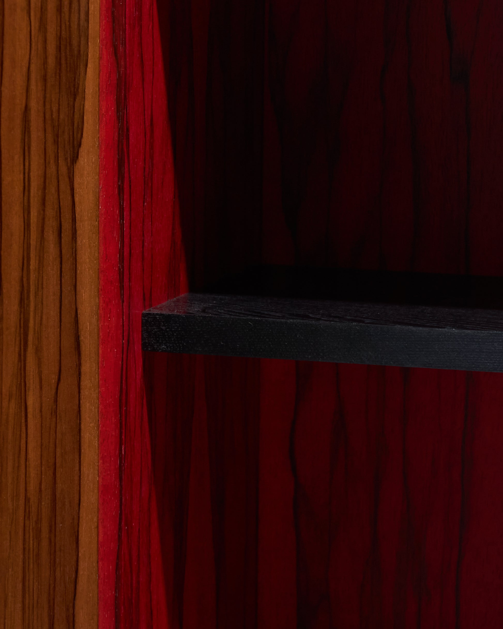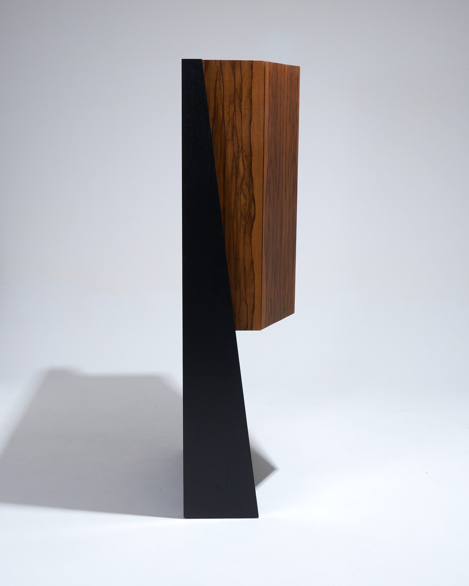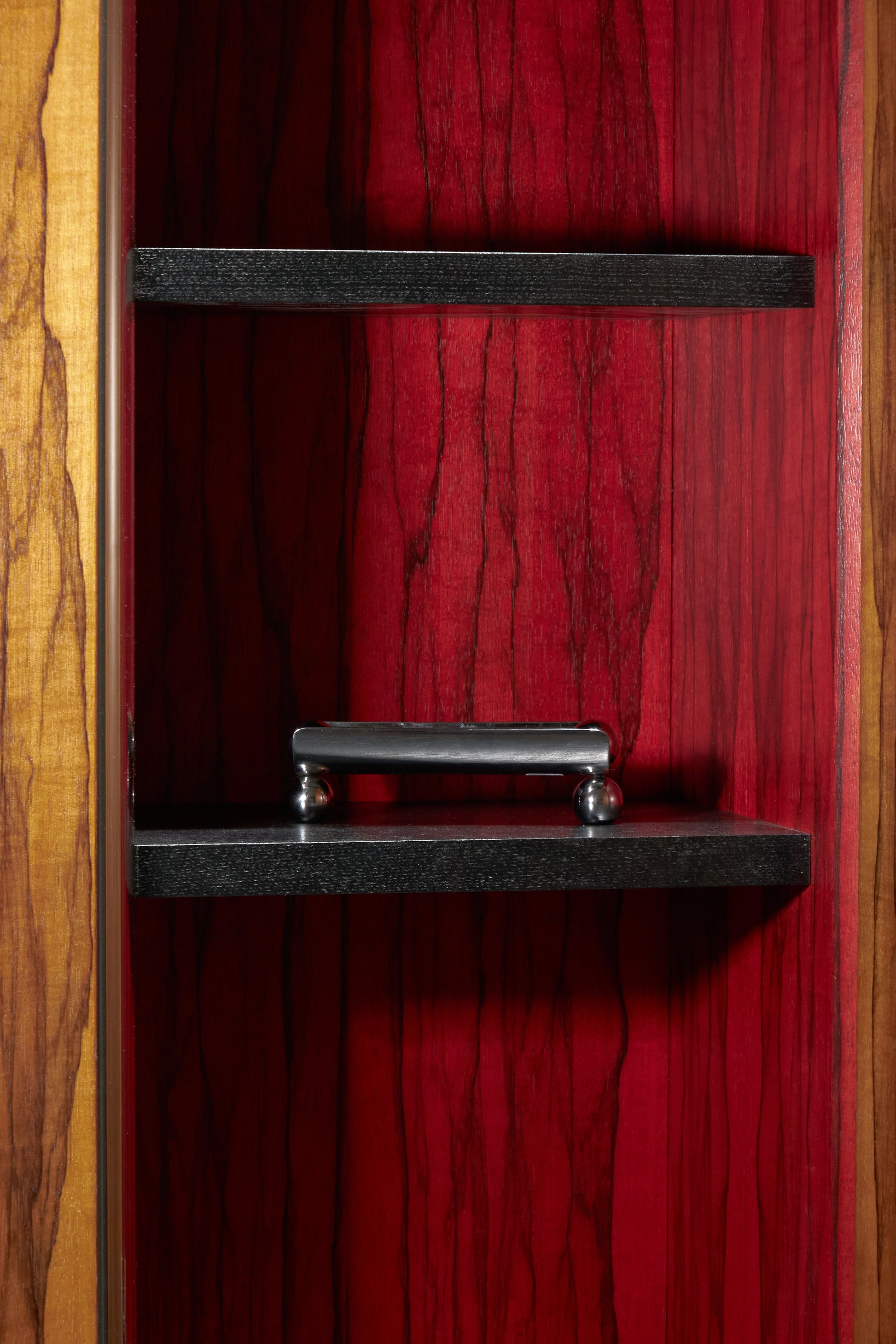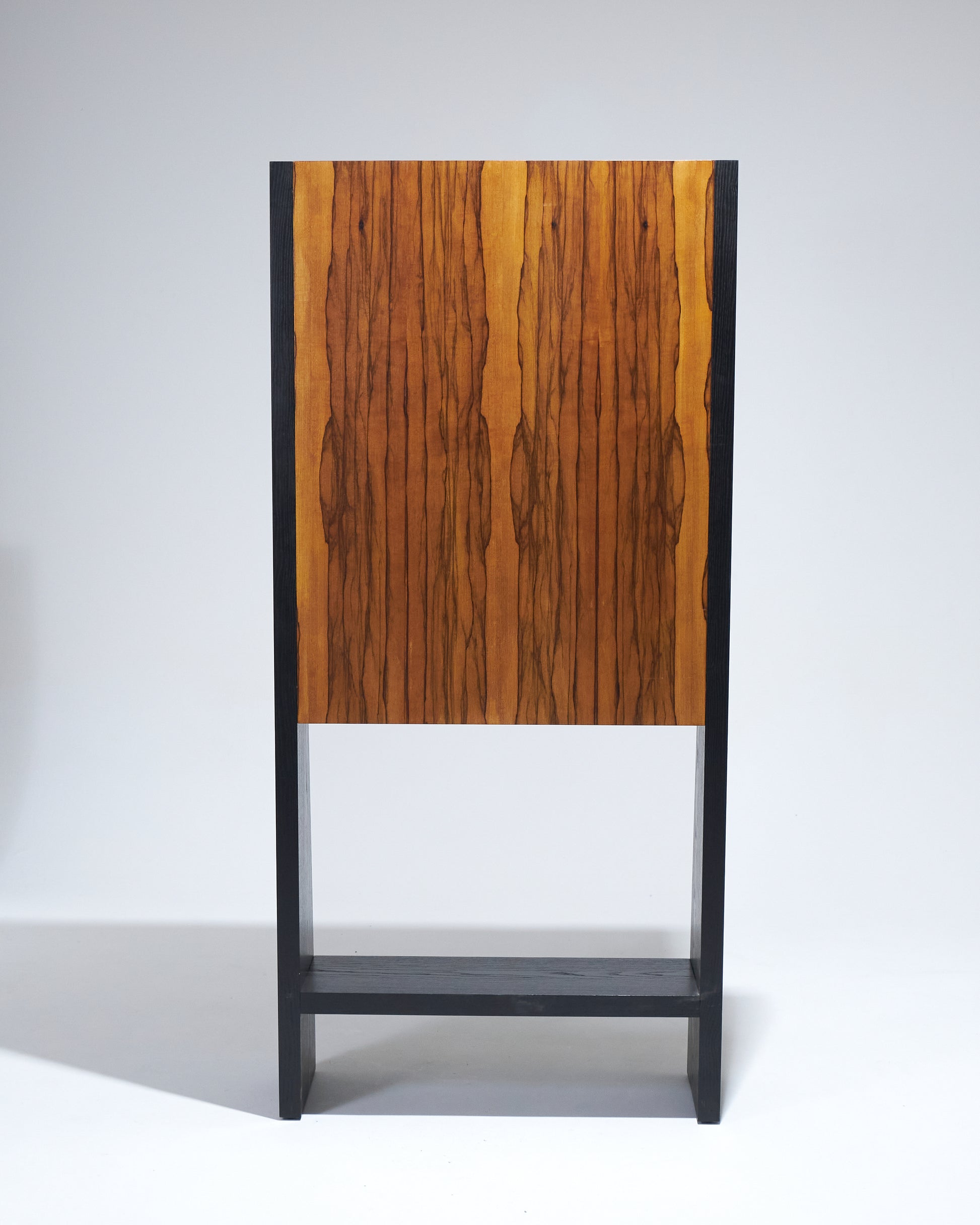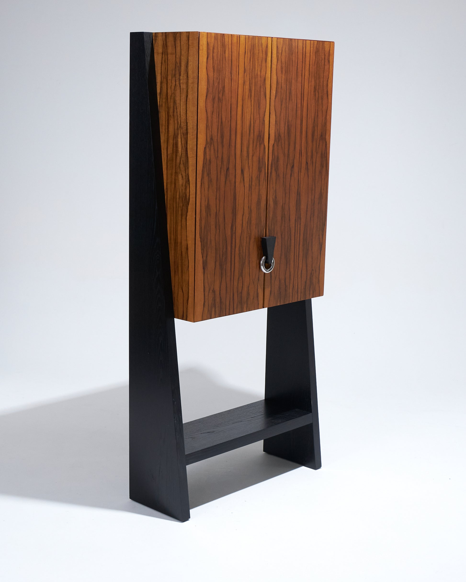 Meuble bar Homme Debout "BHD01", en frêne massif teinté noir et caisson en placage de fraké teinté noisette et rouge. Finition satinée. Montant intérieur et poignée en acier inoxydable chromé.