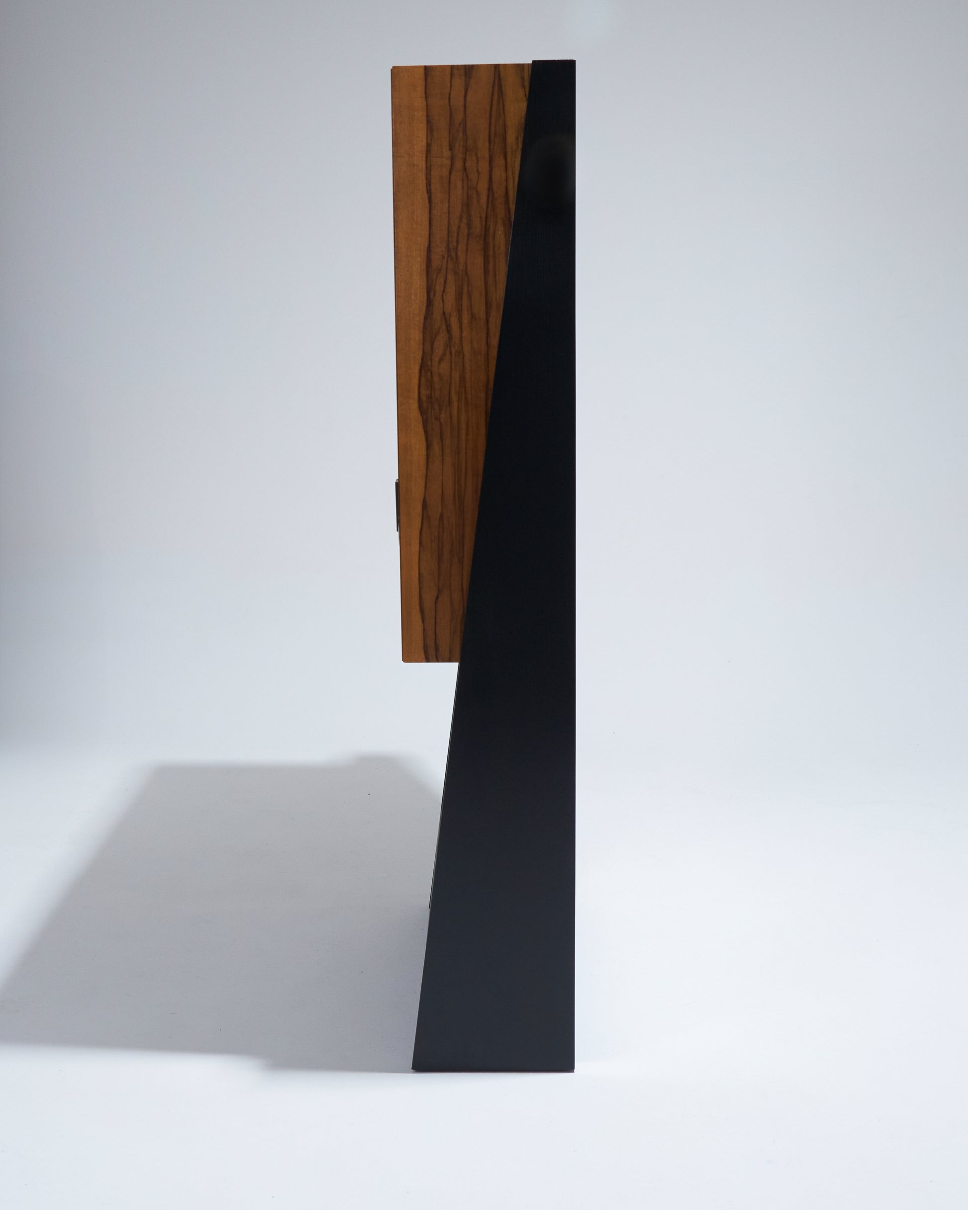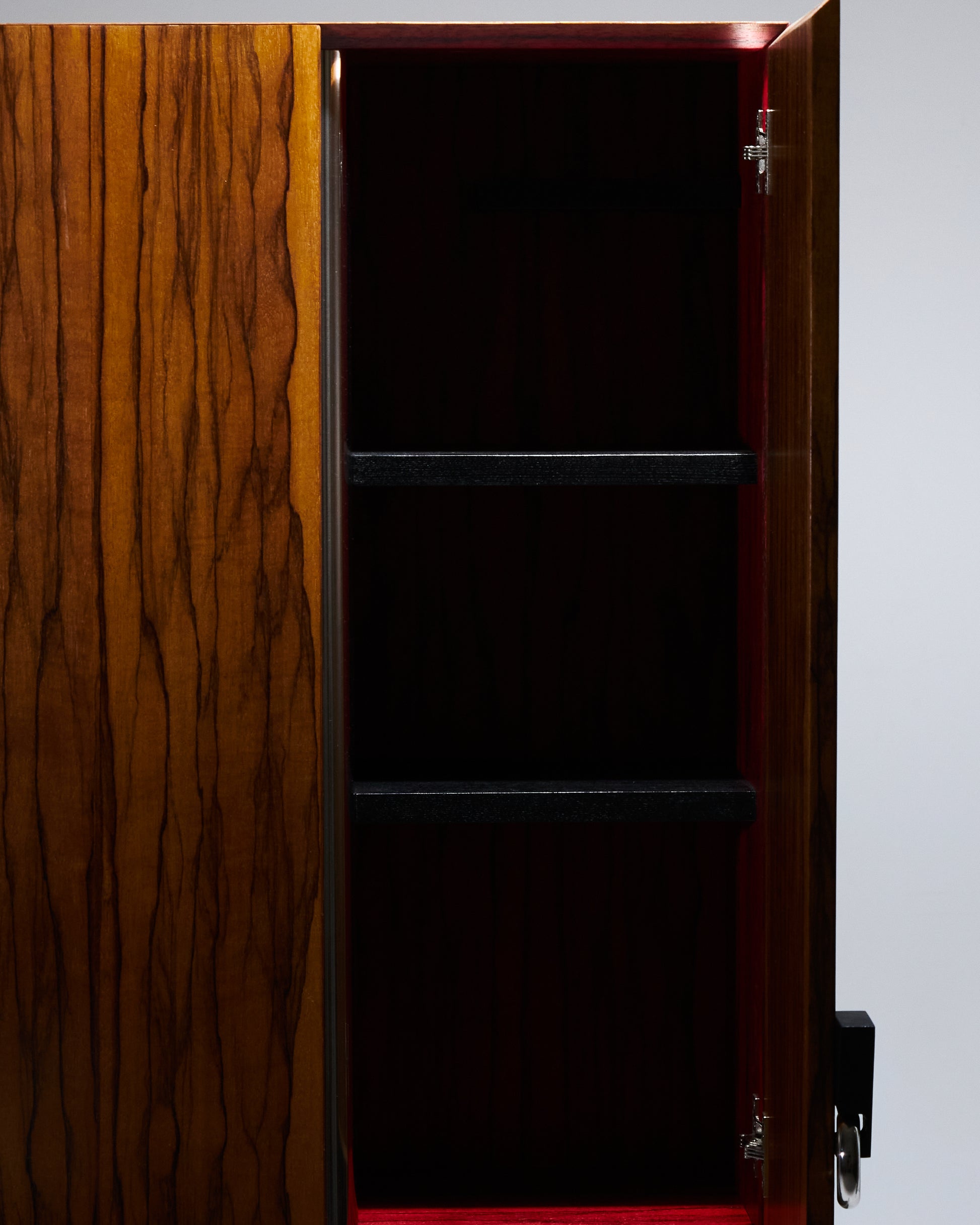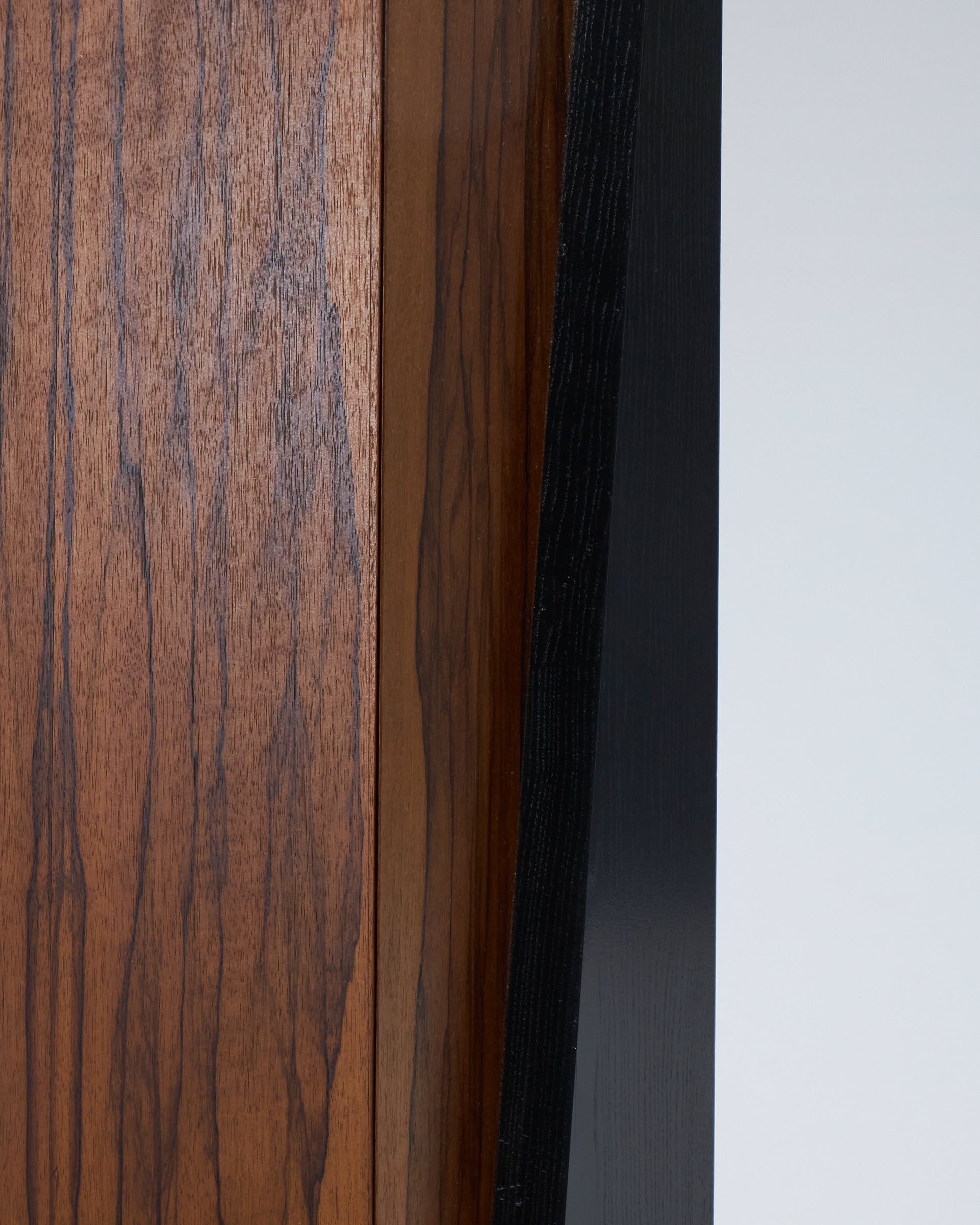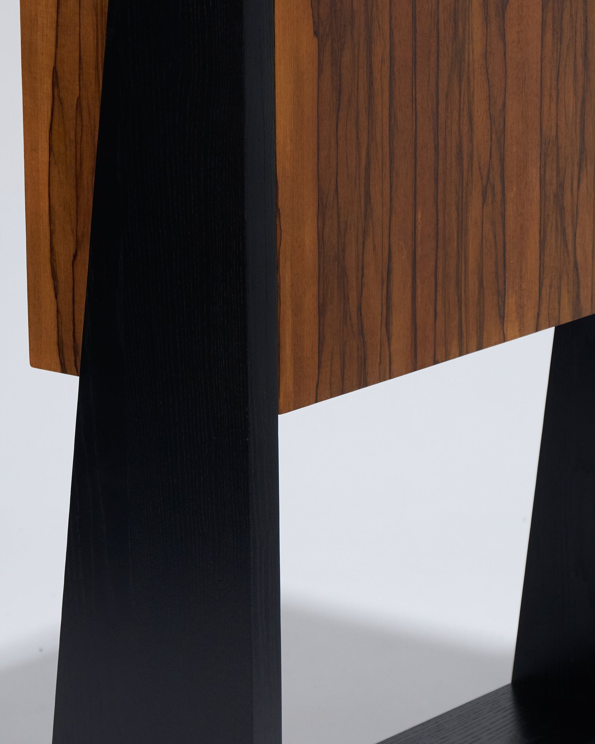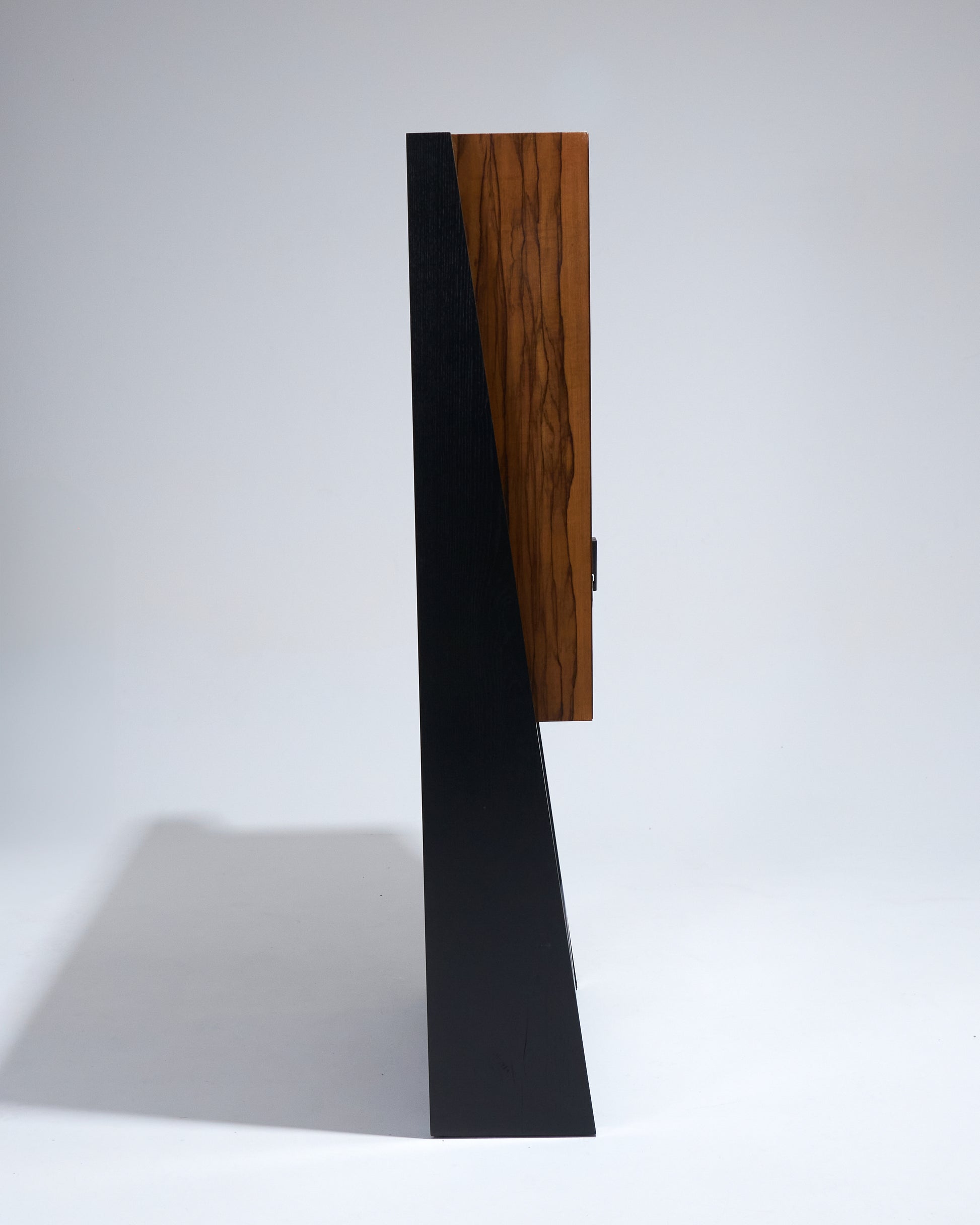 Meuble bar Homme Debout "BHD01", en frêne massif teinté noir et caisson en placage de fraké teinté noisette et rouge. Finition satinée. Montant intérieur et poignée en acier inoxydable chromé.