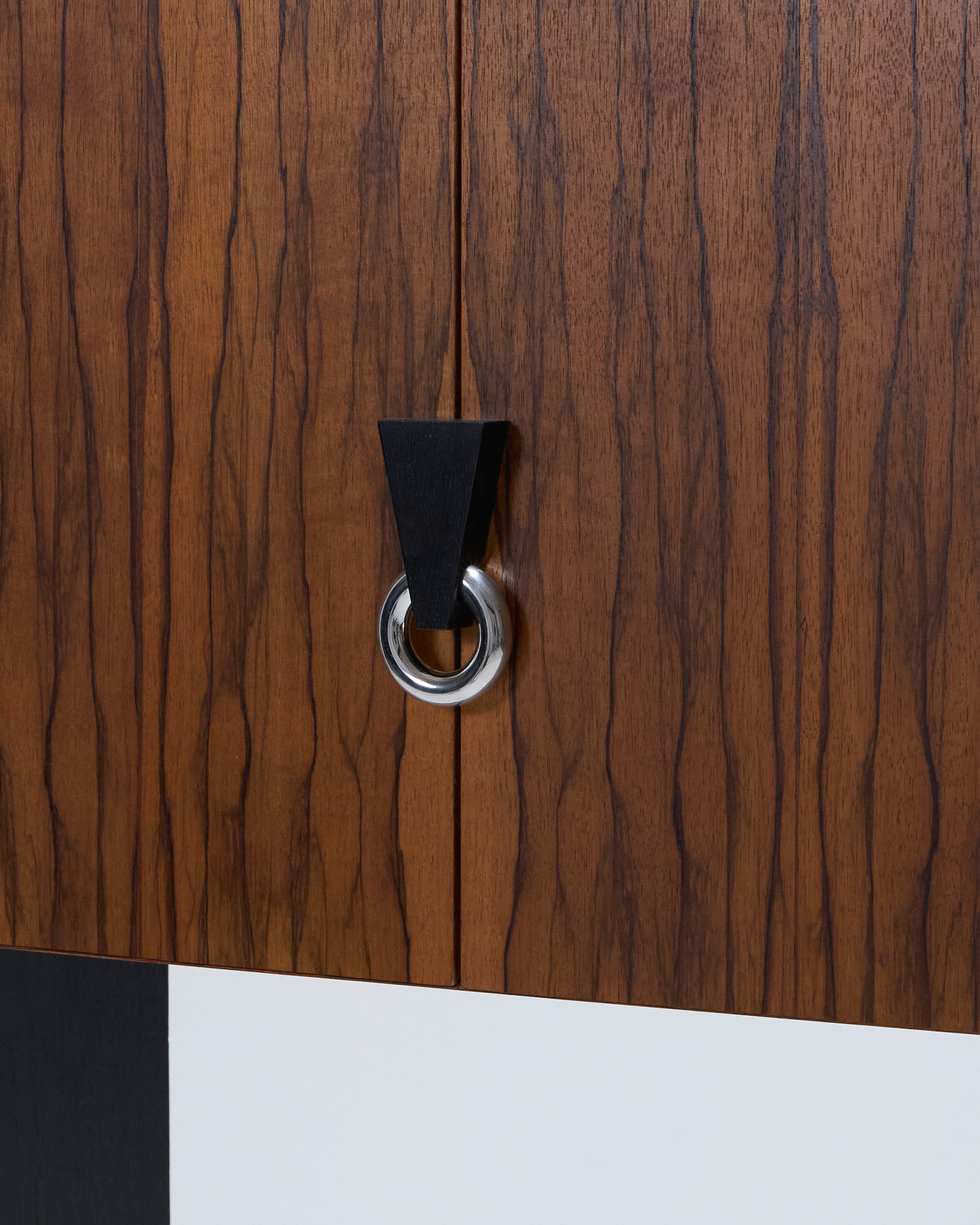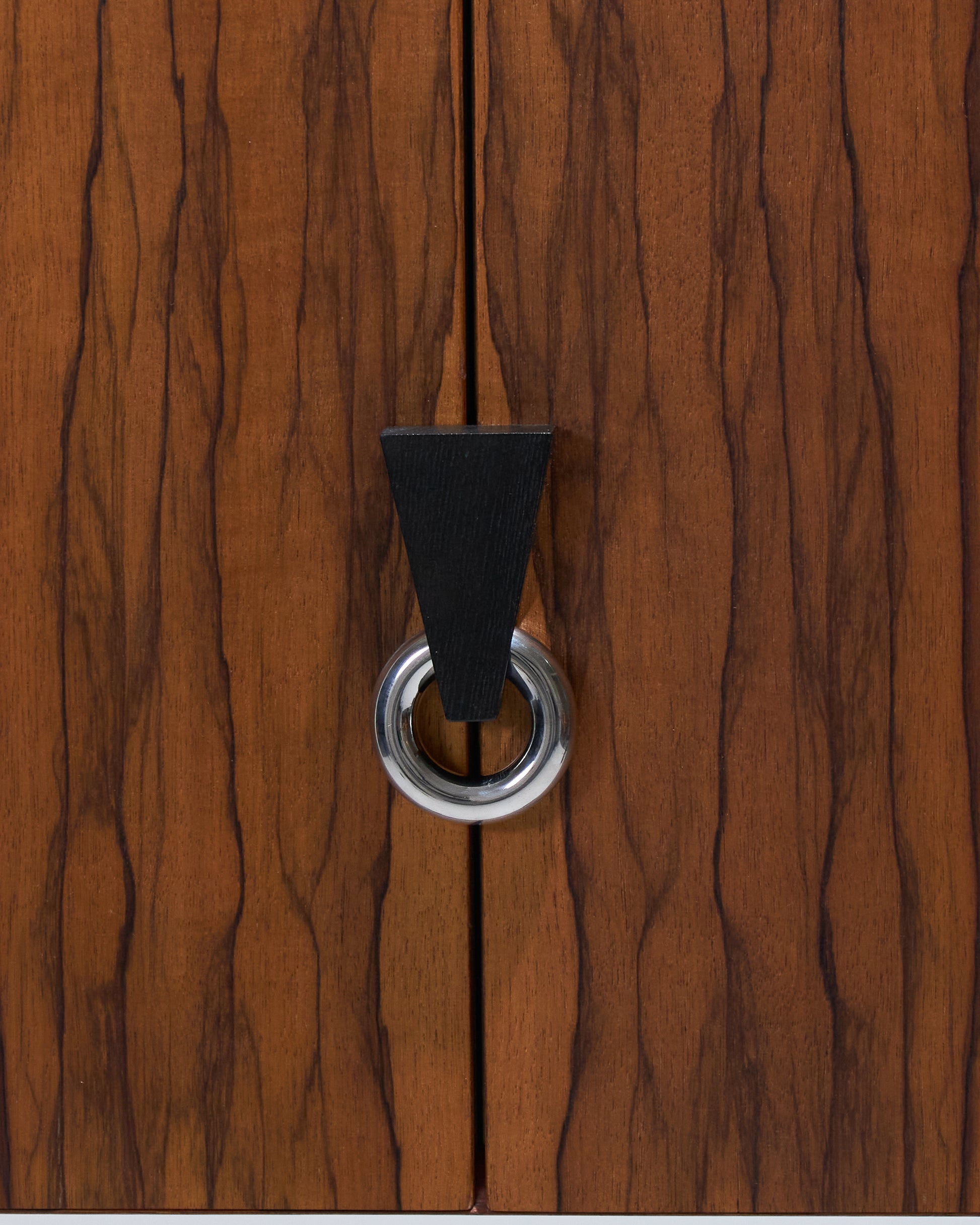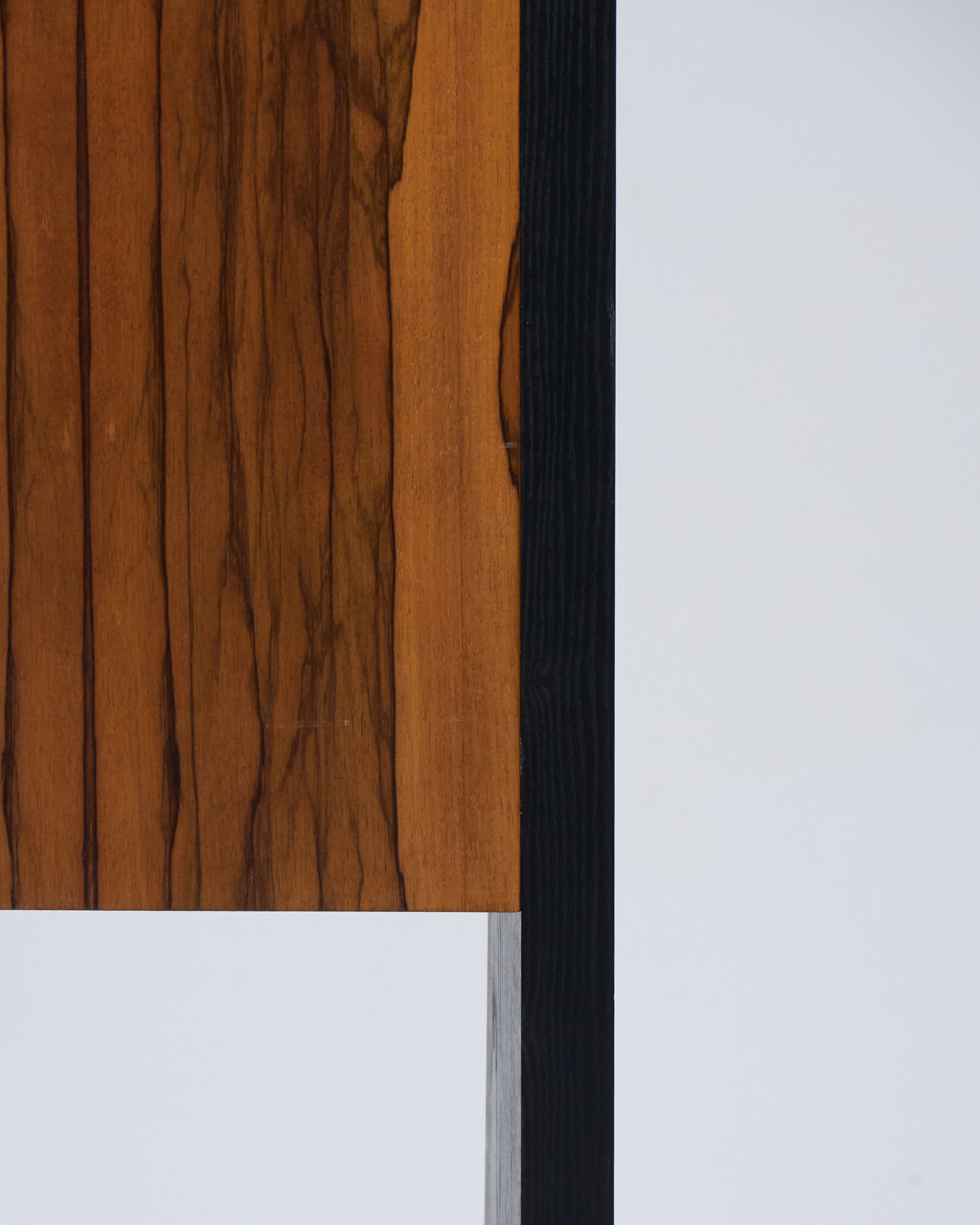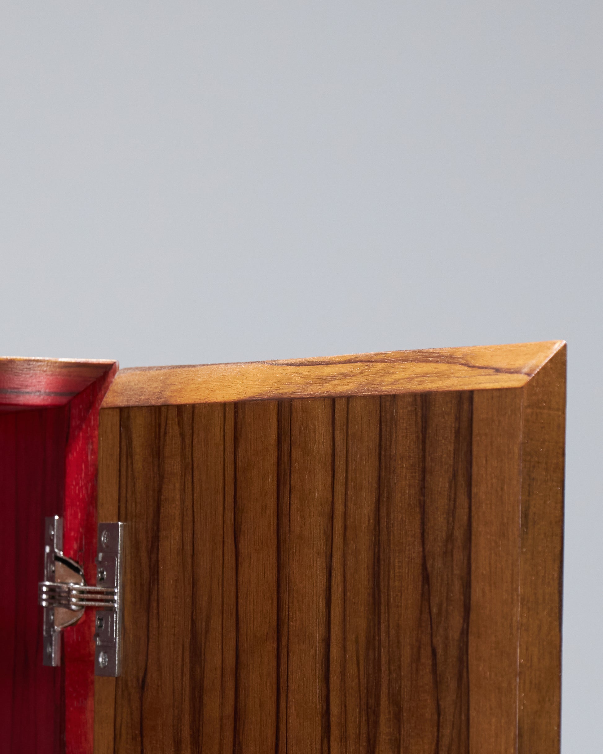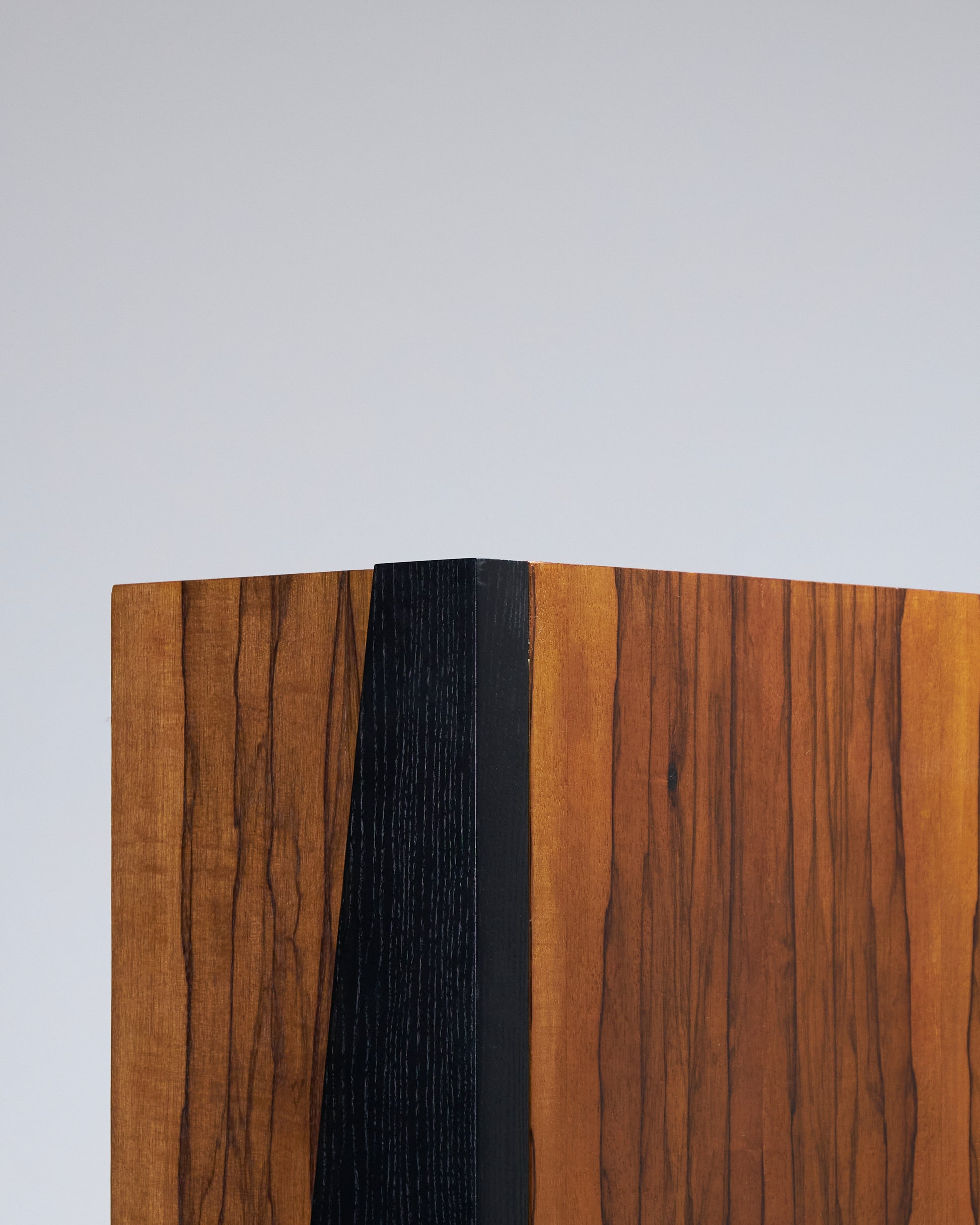 Meuble bar Homme Debout "BHD01", en frêne massif teinté noir et caisson en placage de fraké teinté noisette et rouge. Finition satinée. Montant intérieur et poignée en acier inoxydable chromé.