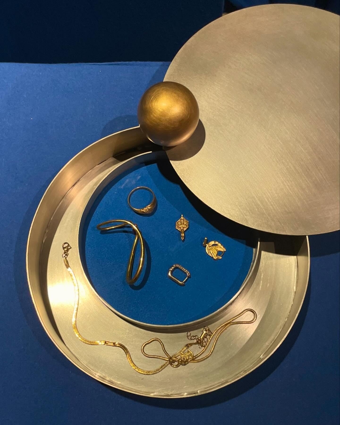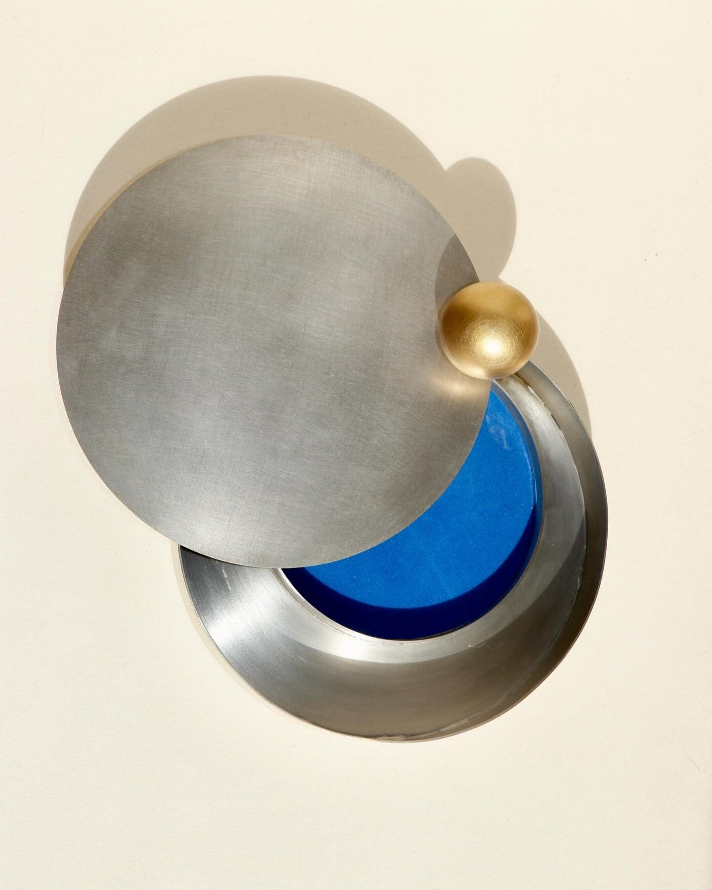 Boîte à bijoux au couvercle rotatif, composée de deux compartiments. Un cylindre, coiffé d’un couvercle mis en mouvement par la rotation d’une sphère, forme l’architecture de l’objet. Réalisée en laiton brossé, brasé et patiné à l’argent, elle présente une plaque fine, légèrement surélevée par quatre cylindres encastrés en appui, qui souligne la justesse de ses proportions et la qualité du travail du métal.