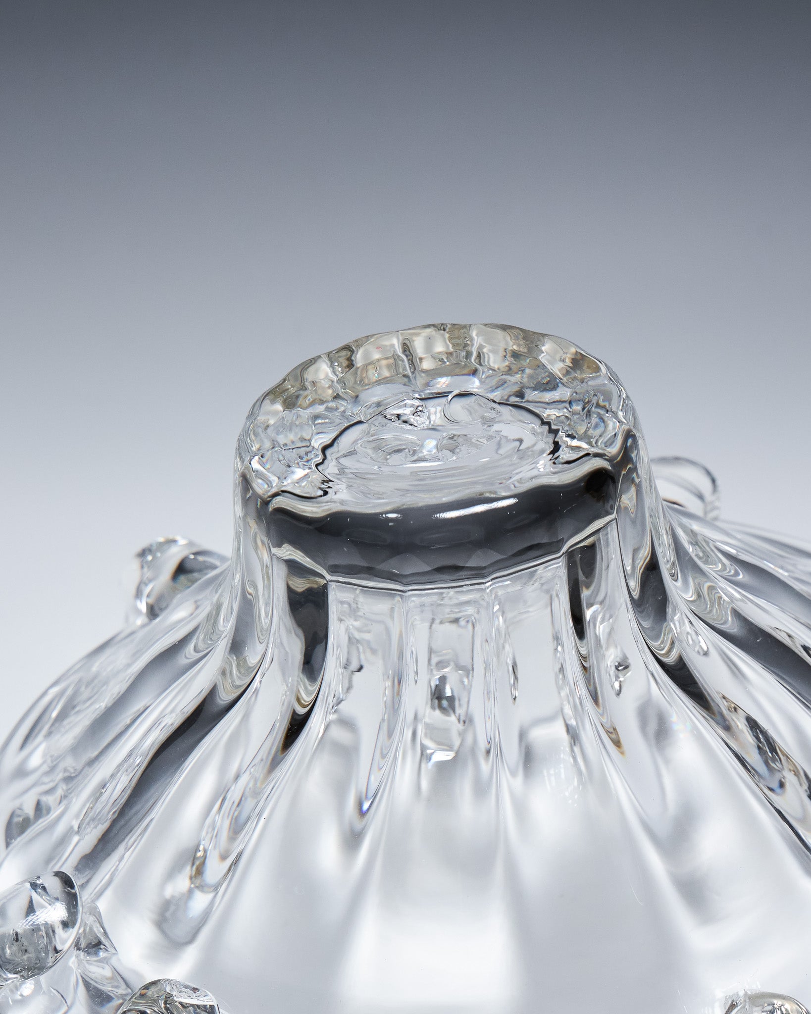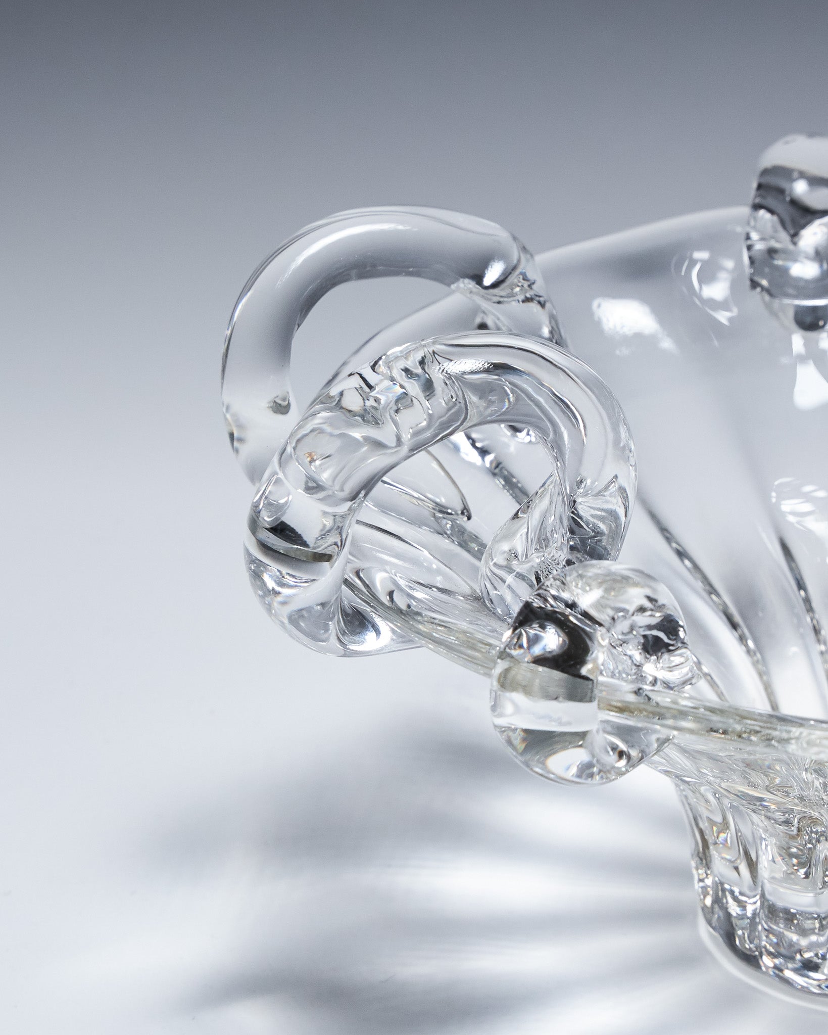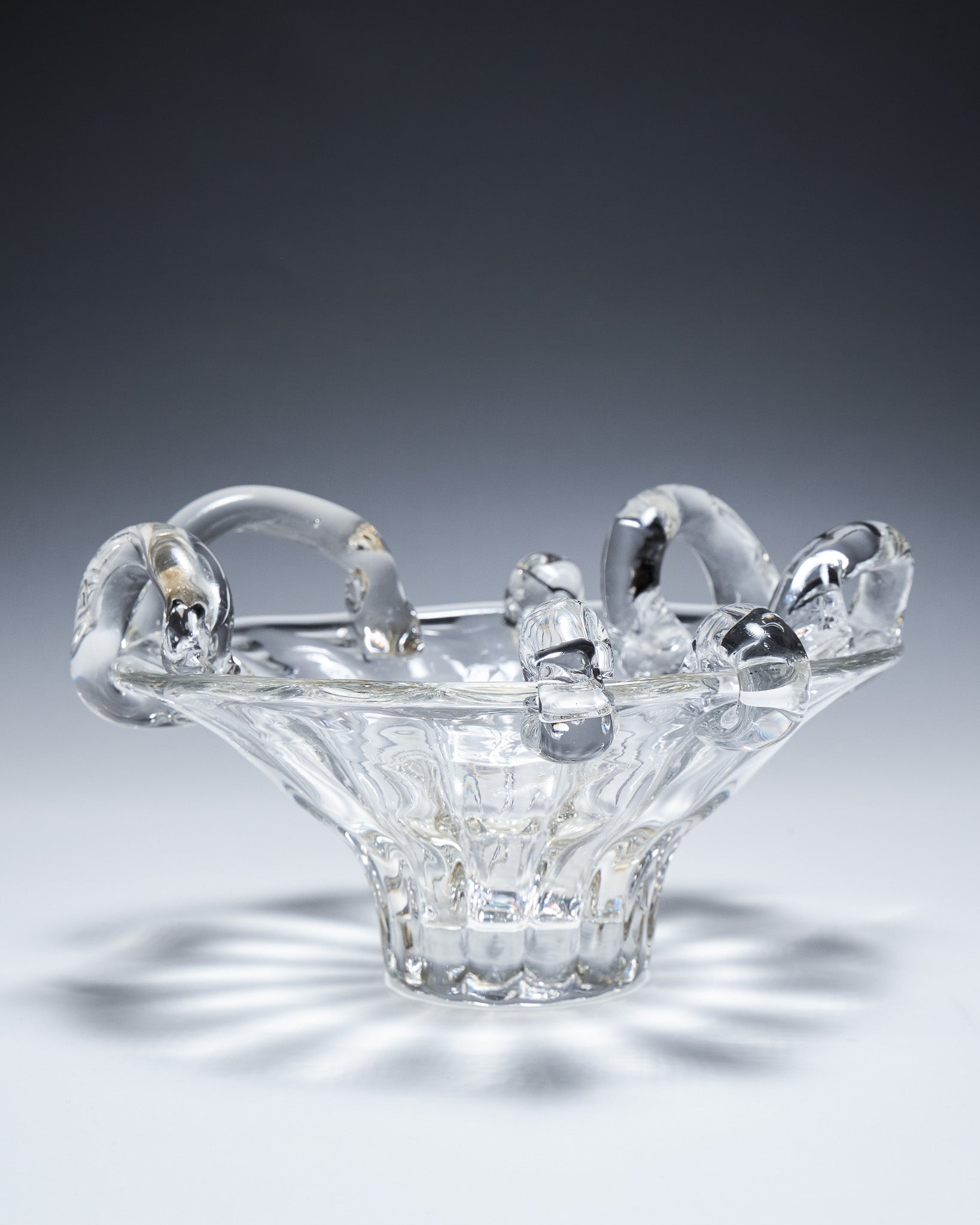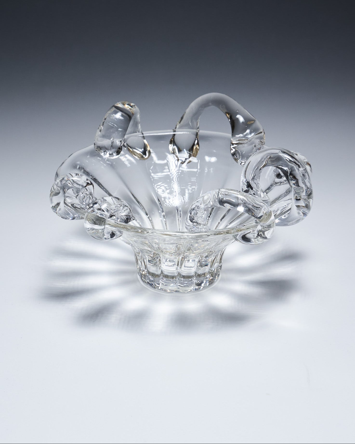 Ce saladier fait partie d’une série de pièces expérimentales en verre soufflé, comprenant des carafes et des vases. La série présente des anses et ornements sculpturaux rappelant les vrilles tortueuses et vivantes des plantes. Chaque pièce embrasse la nature imprévisible du soufflage du verre, donnant naissance à des formes organiques et irrégulières.