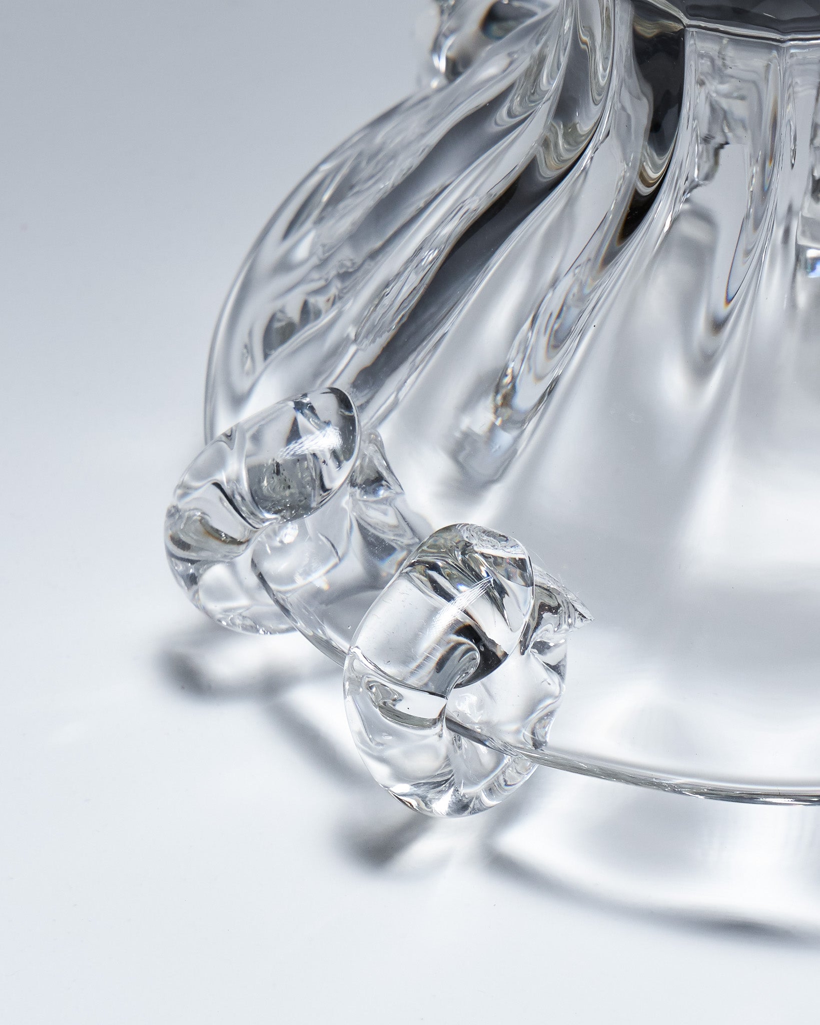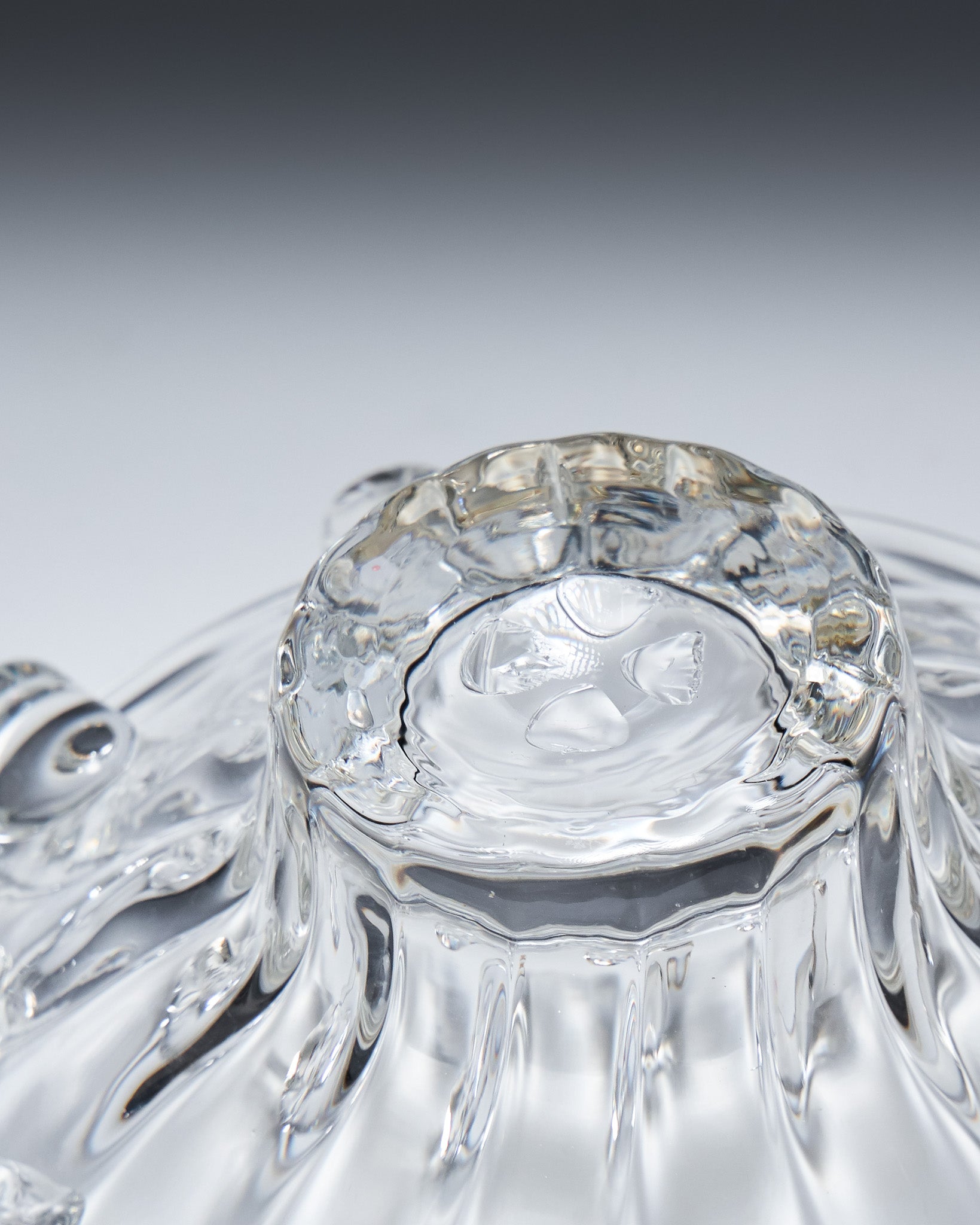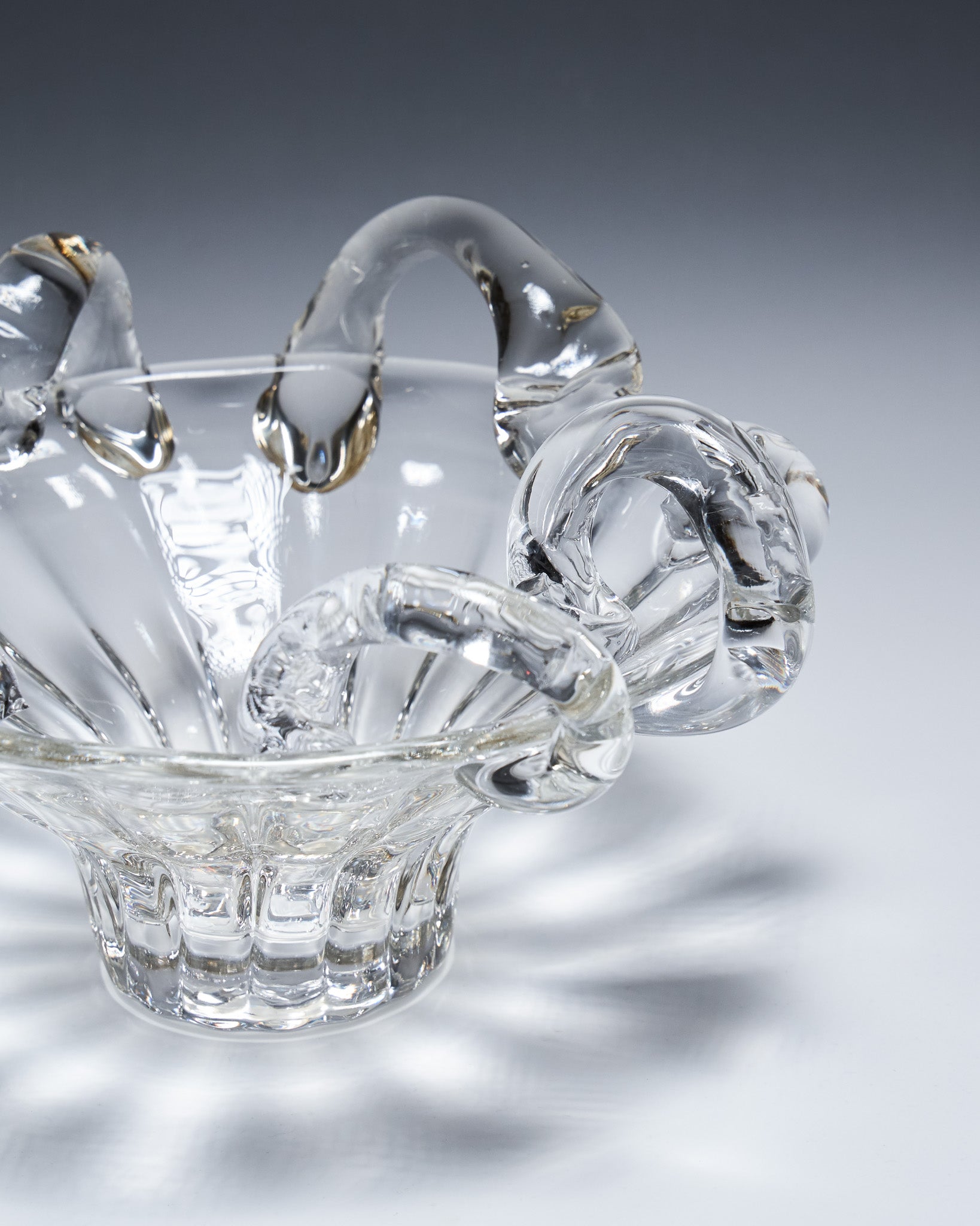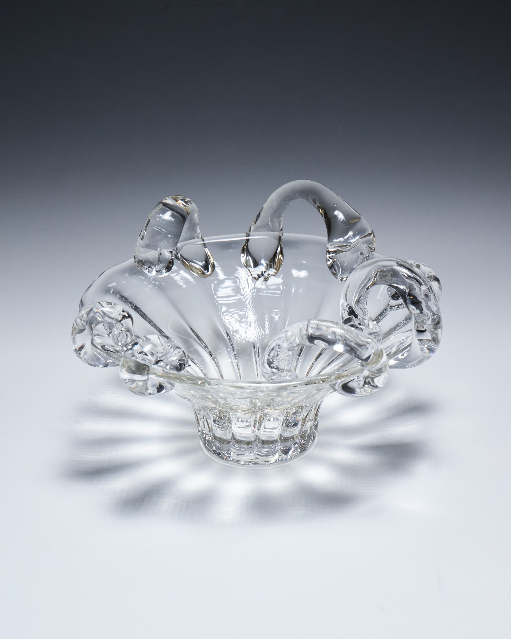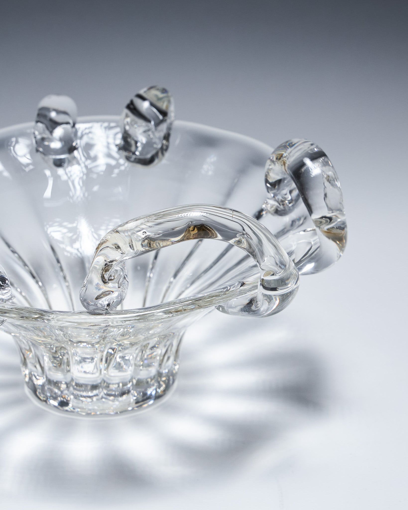 Ce saladier fait partie d’une série de pièces expérimentales en verre soufflé, comprenant des carafes et des vases. La série présente des anses et ornements sculpturaux rappelant les vrilles tortueuses et vivantes des plantes. Chaque pièce embrasse la nature imprévisible du soufflage du verre, donnant naissance à des formes organiques et irrégulières.