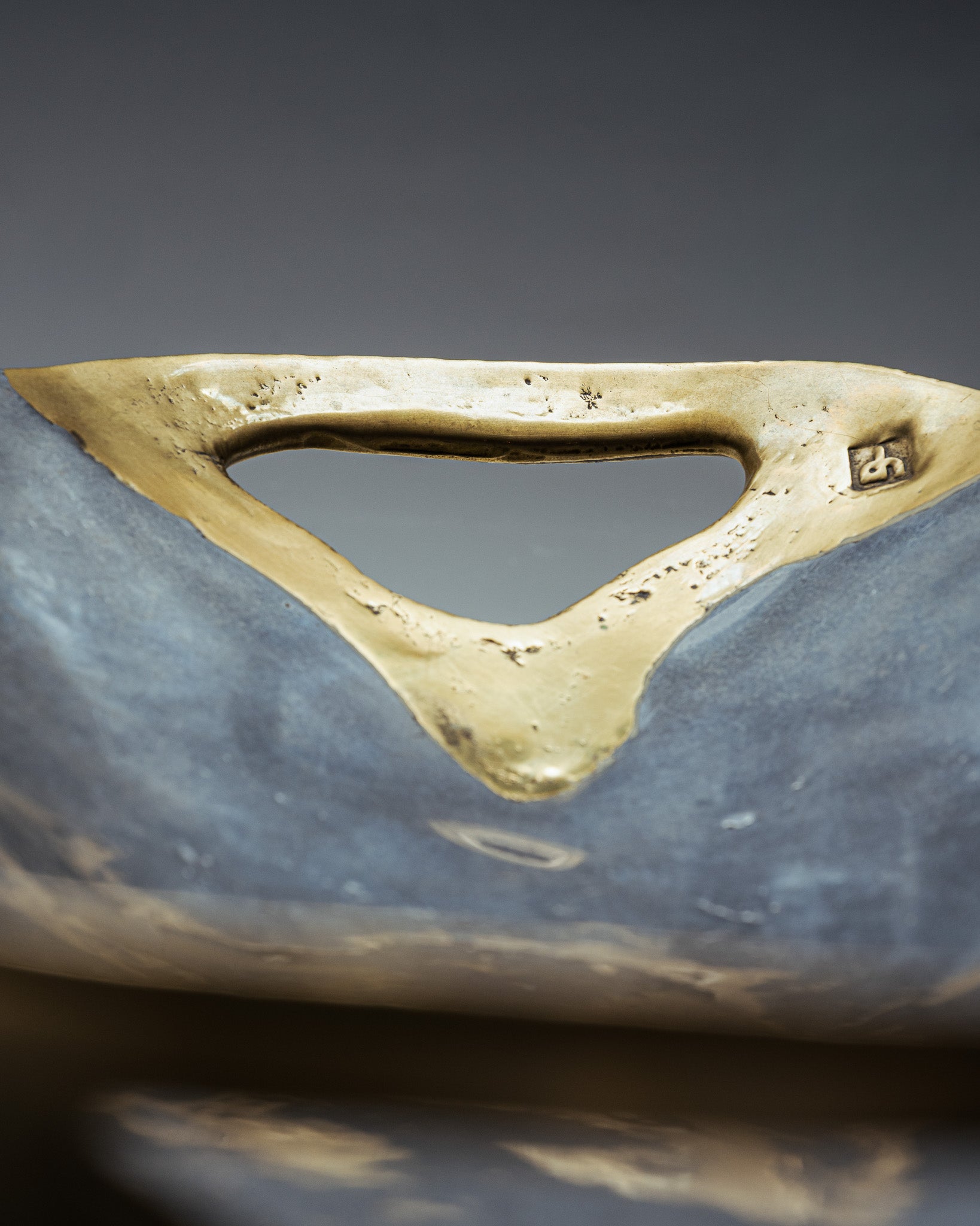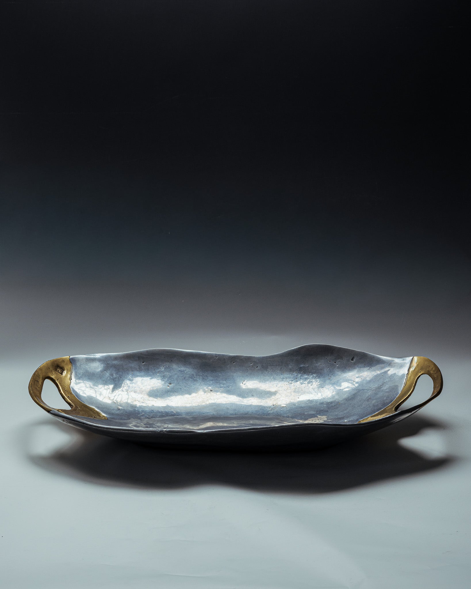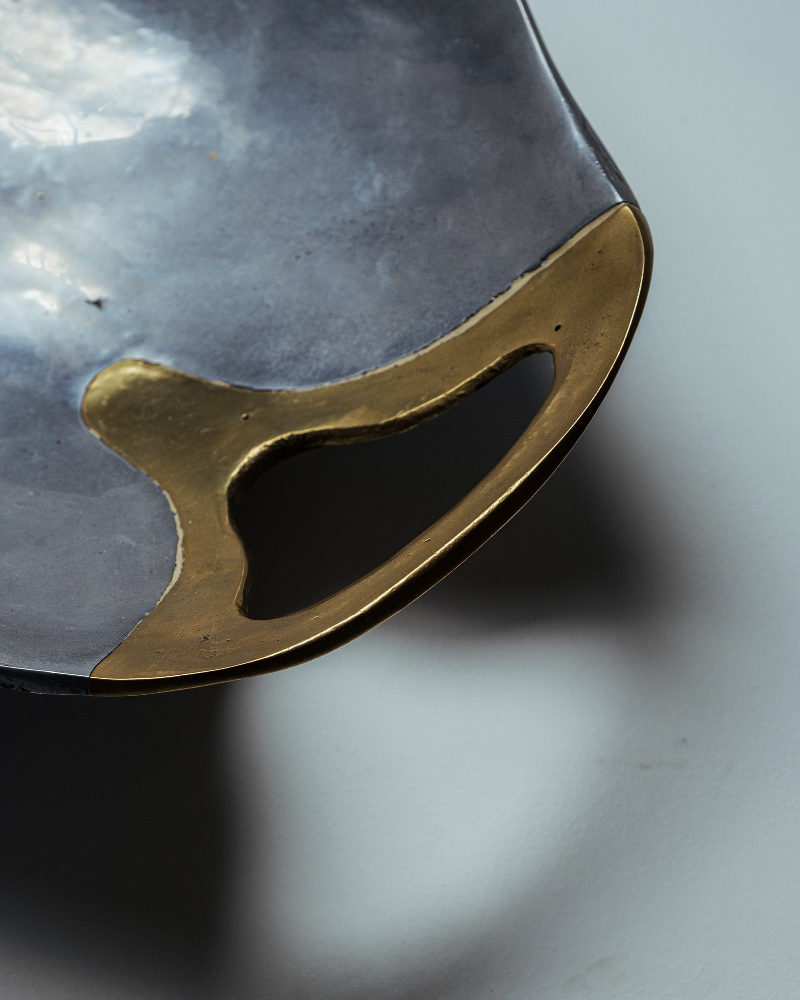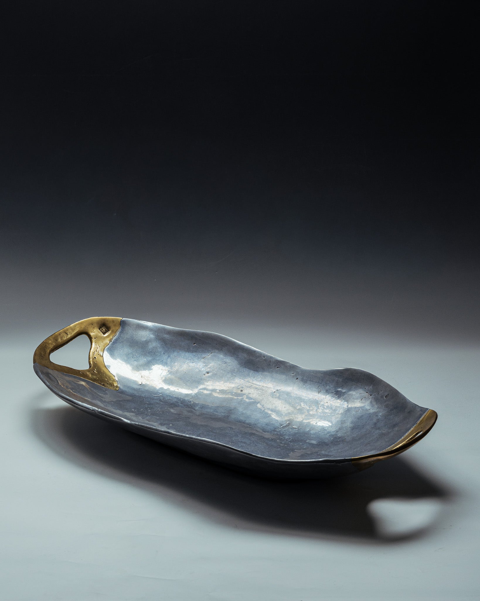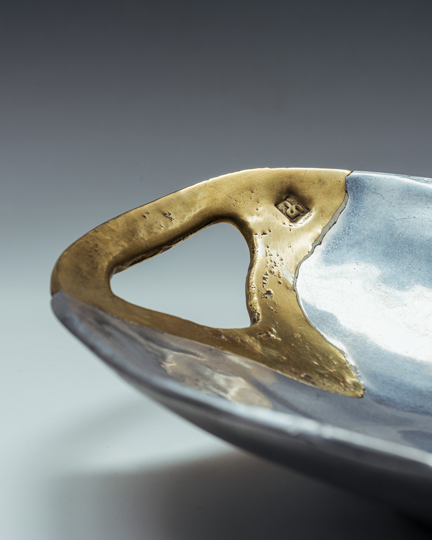 Coupe brutaliste signé David Marshall, années 1980. Plat de forme organique en aluminium poli, à surface martelée. Anse intégrée en laiton coulé, contrastant par sa teinte teinte dorée et sa texture brute.