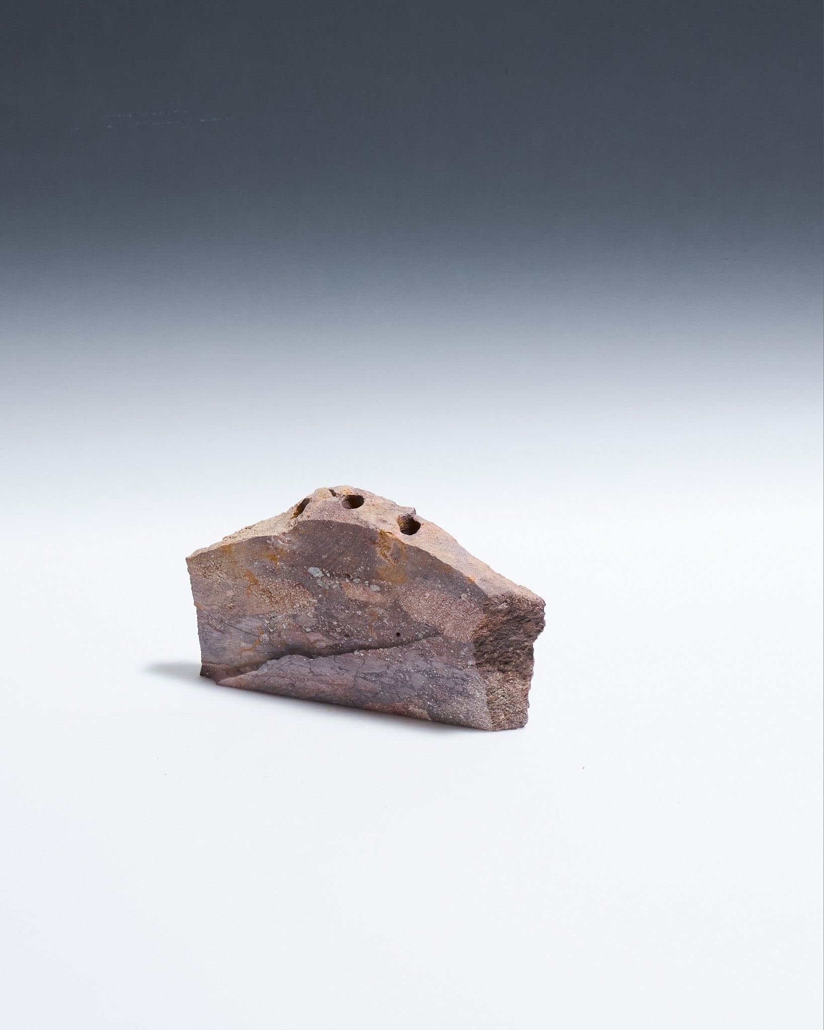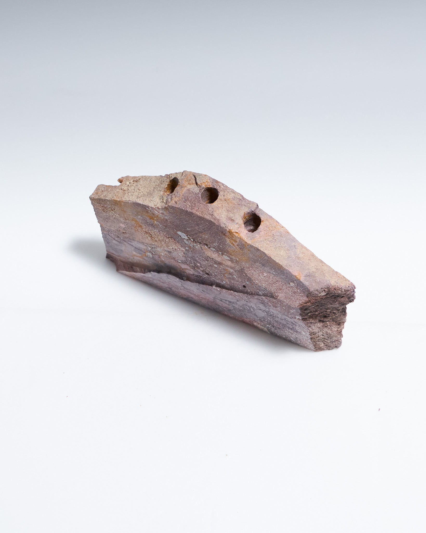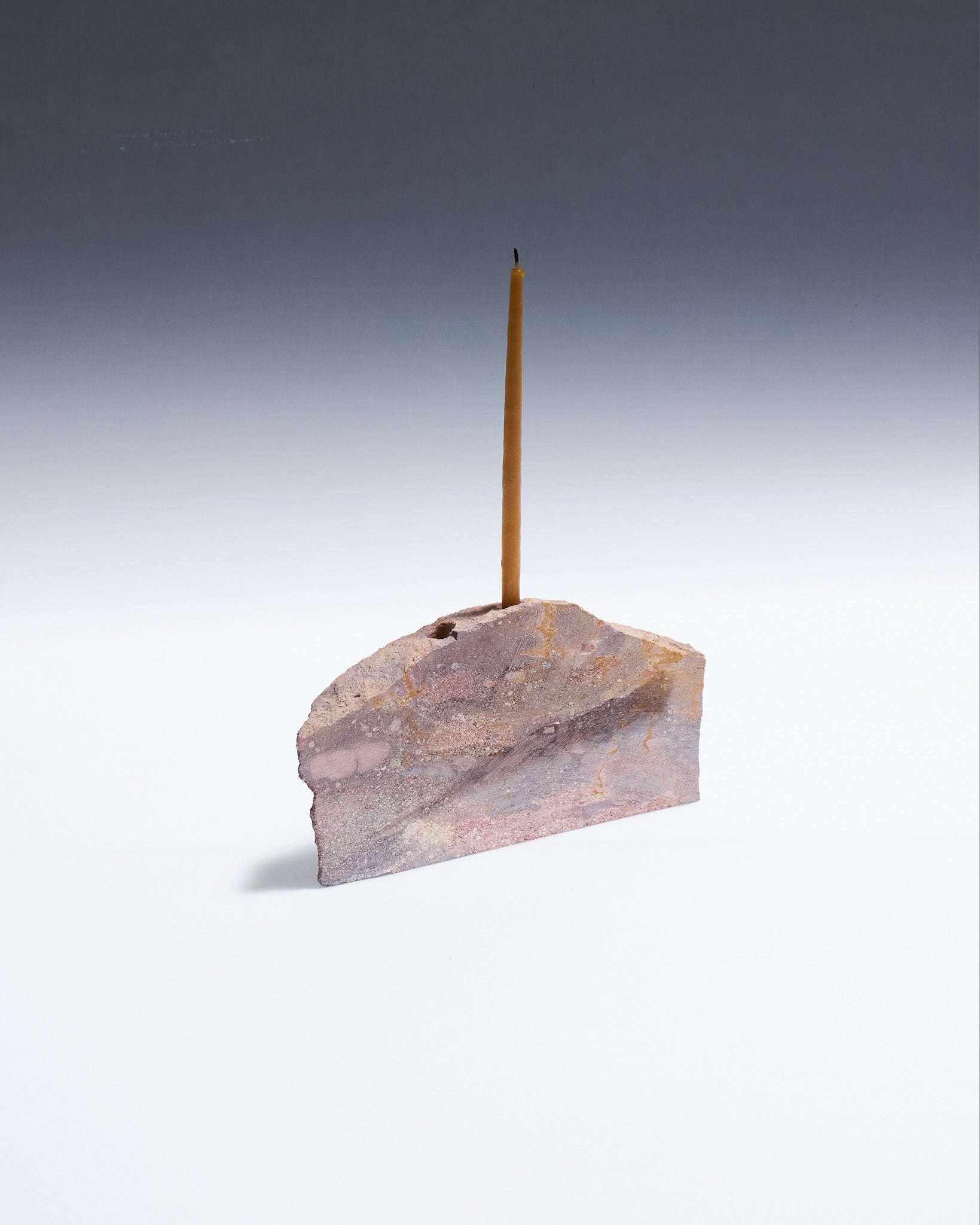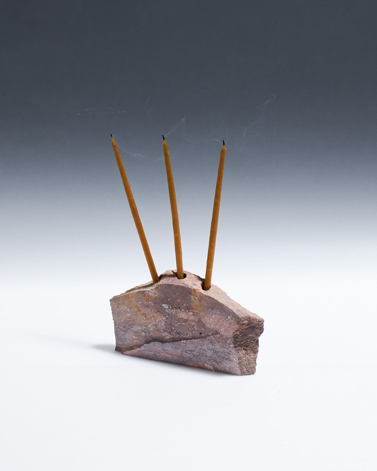 Bougeoir 3 feux Object 102 en grès rosé naturel. Pièce sculptée avec trois emplacements cylindriques pour bougies fines.