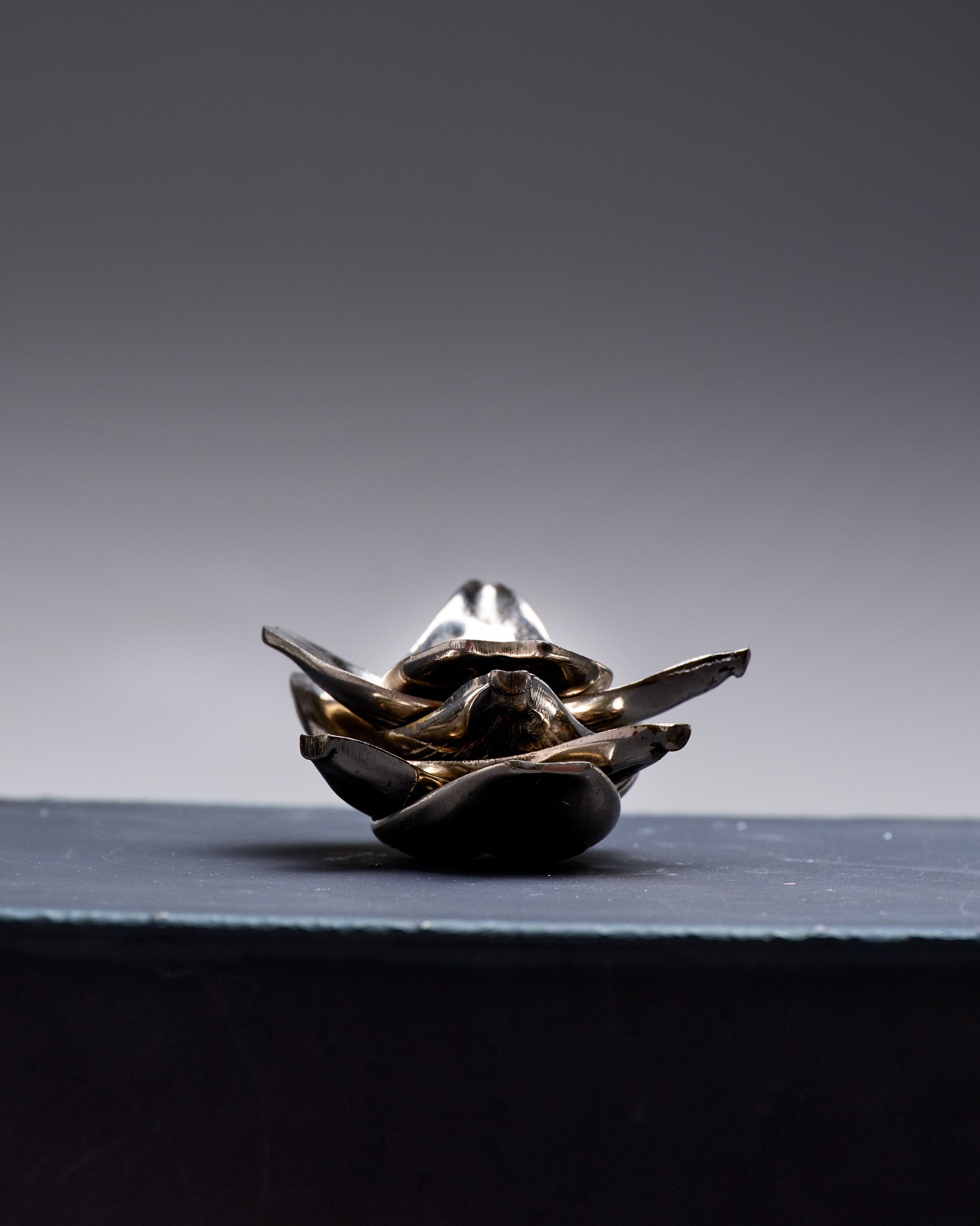 Bougeoir-cendrier en métal argenté adoptant une composition florale stylisée, caractéristique du goût organiques et décoratif des années 1970. La pièce se compose d'une fleur centrale faisant office de bougeoir, entourée de six pétales amovibles, chacun pouvant être utilisé comme cendrier individuel.