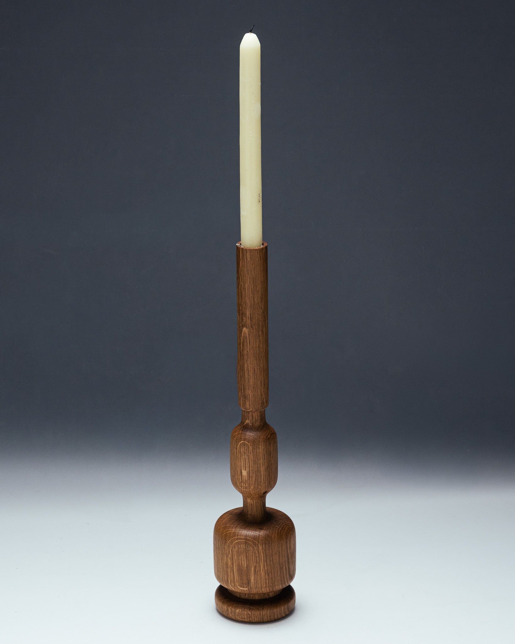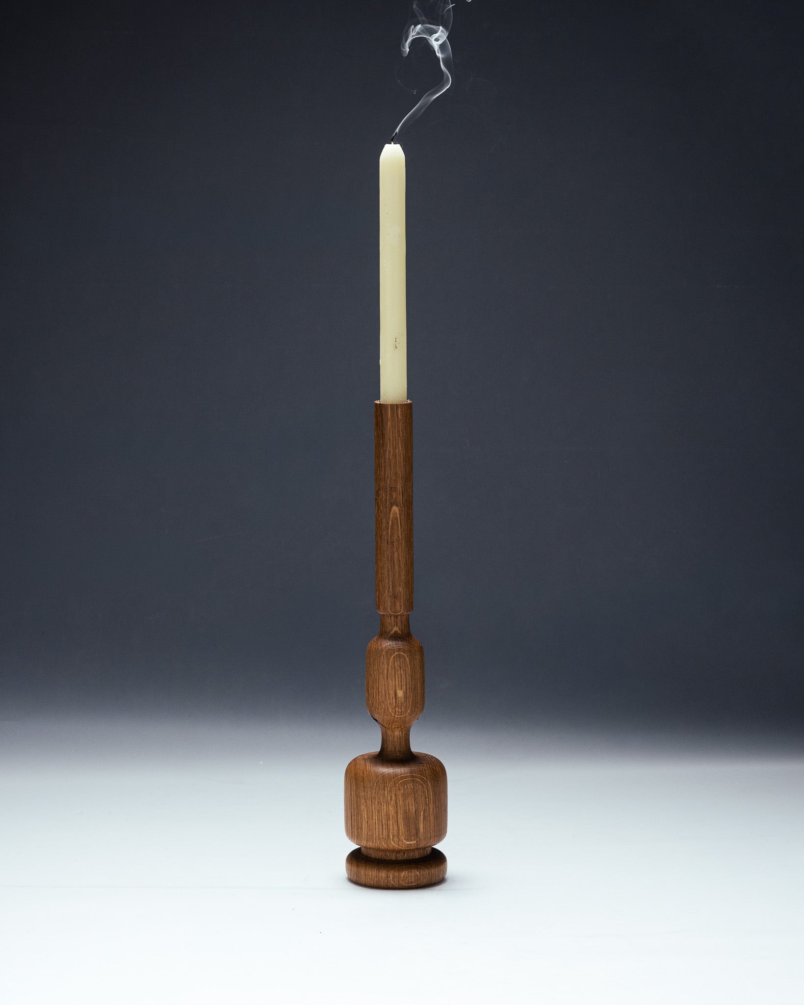 Bougeoir en chêne sculpté par le designer Hugo Periesse. Entièrement réalisé à la main avec du bois de récupération. À noter que le veinage du bois peut varier d’une pièce à l’autre.