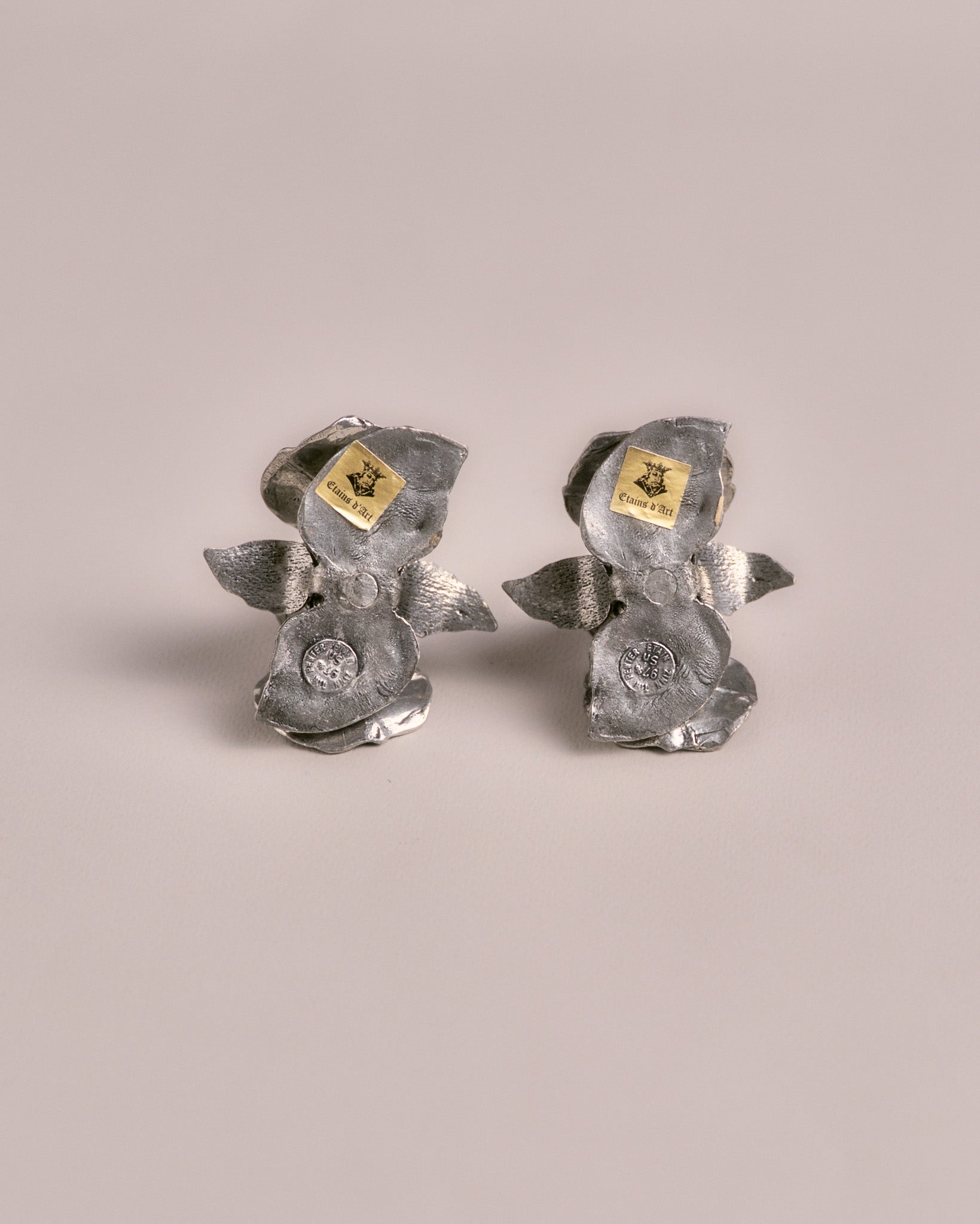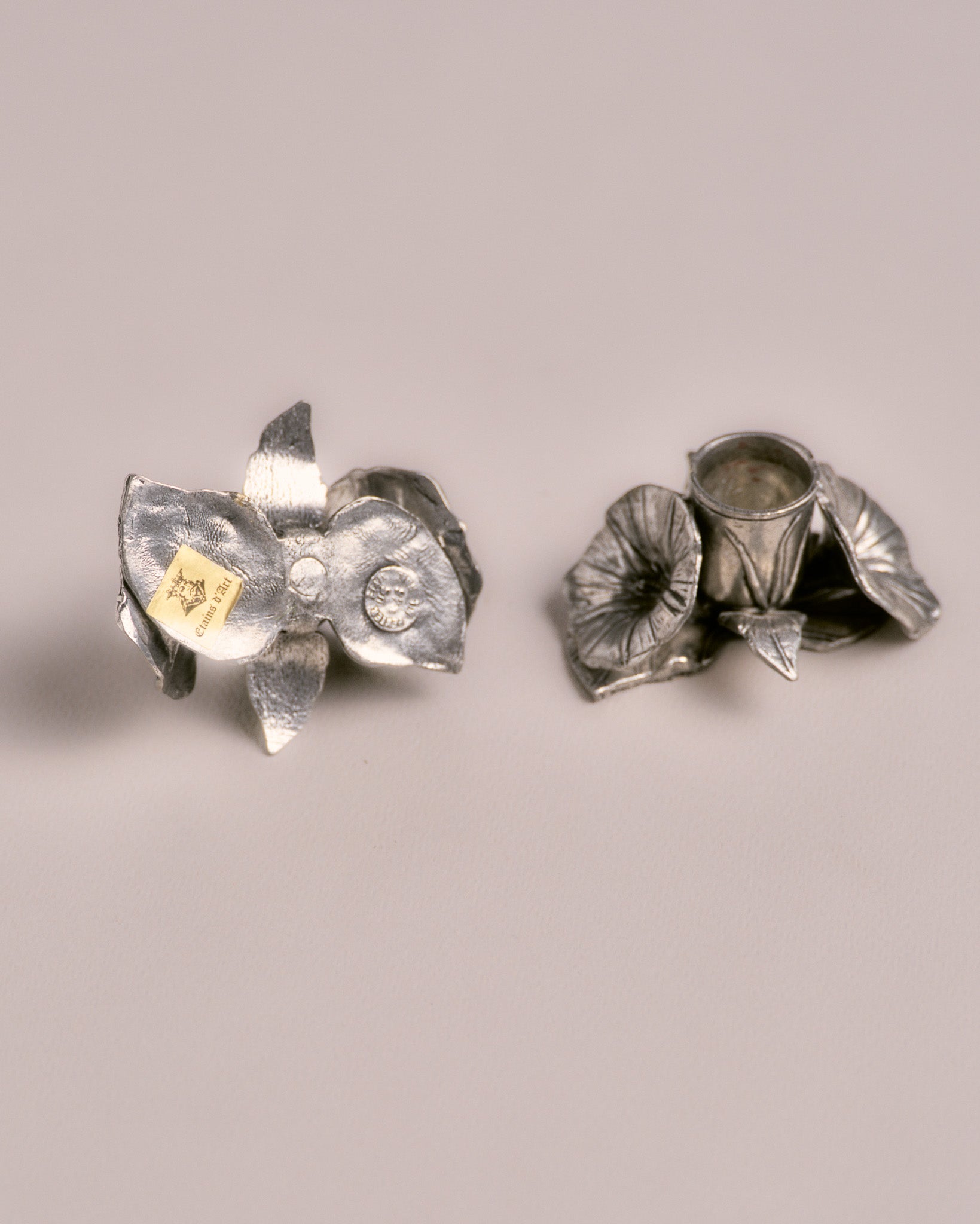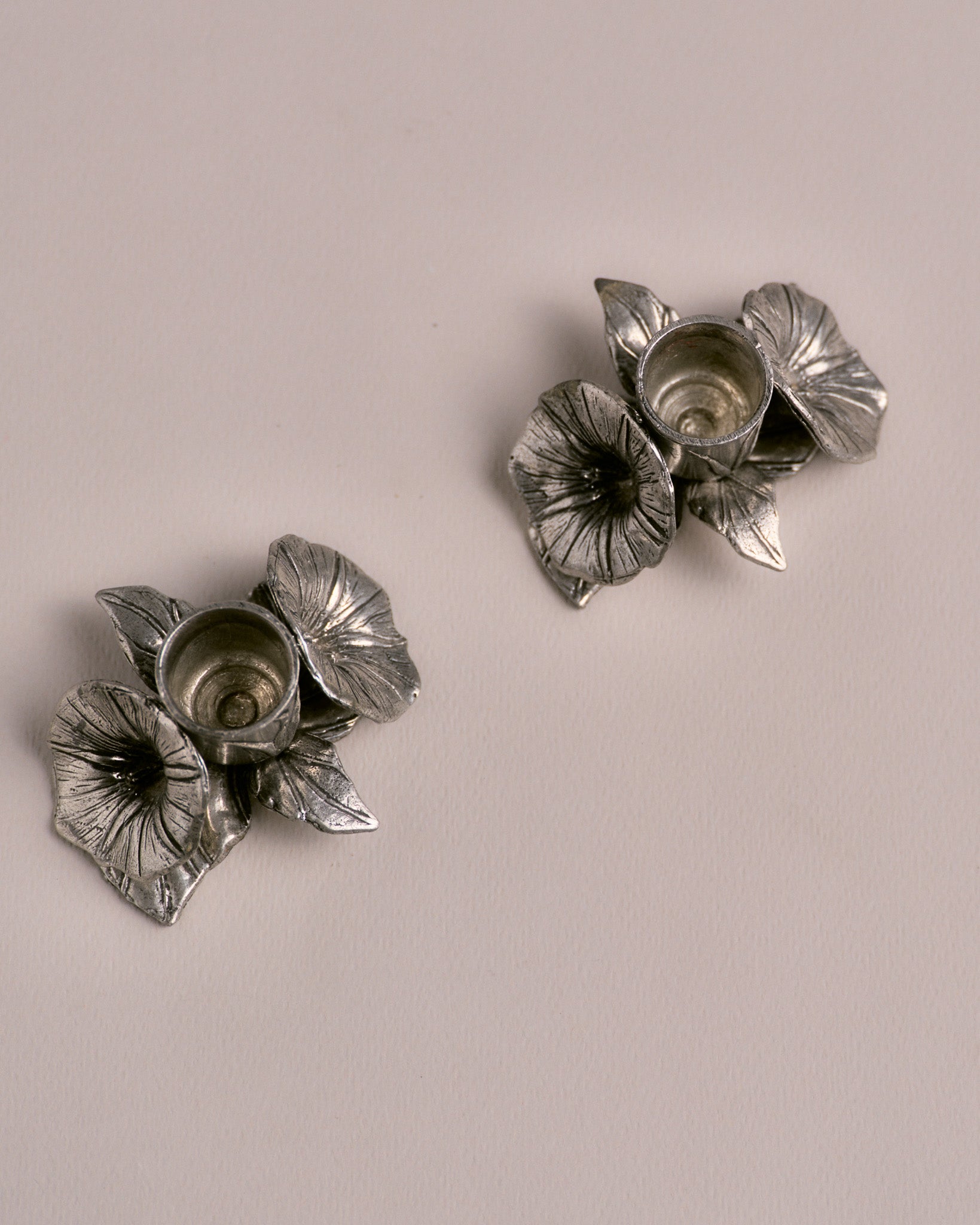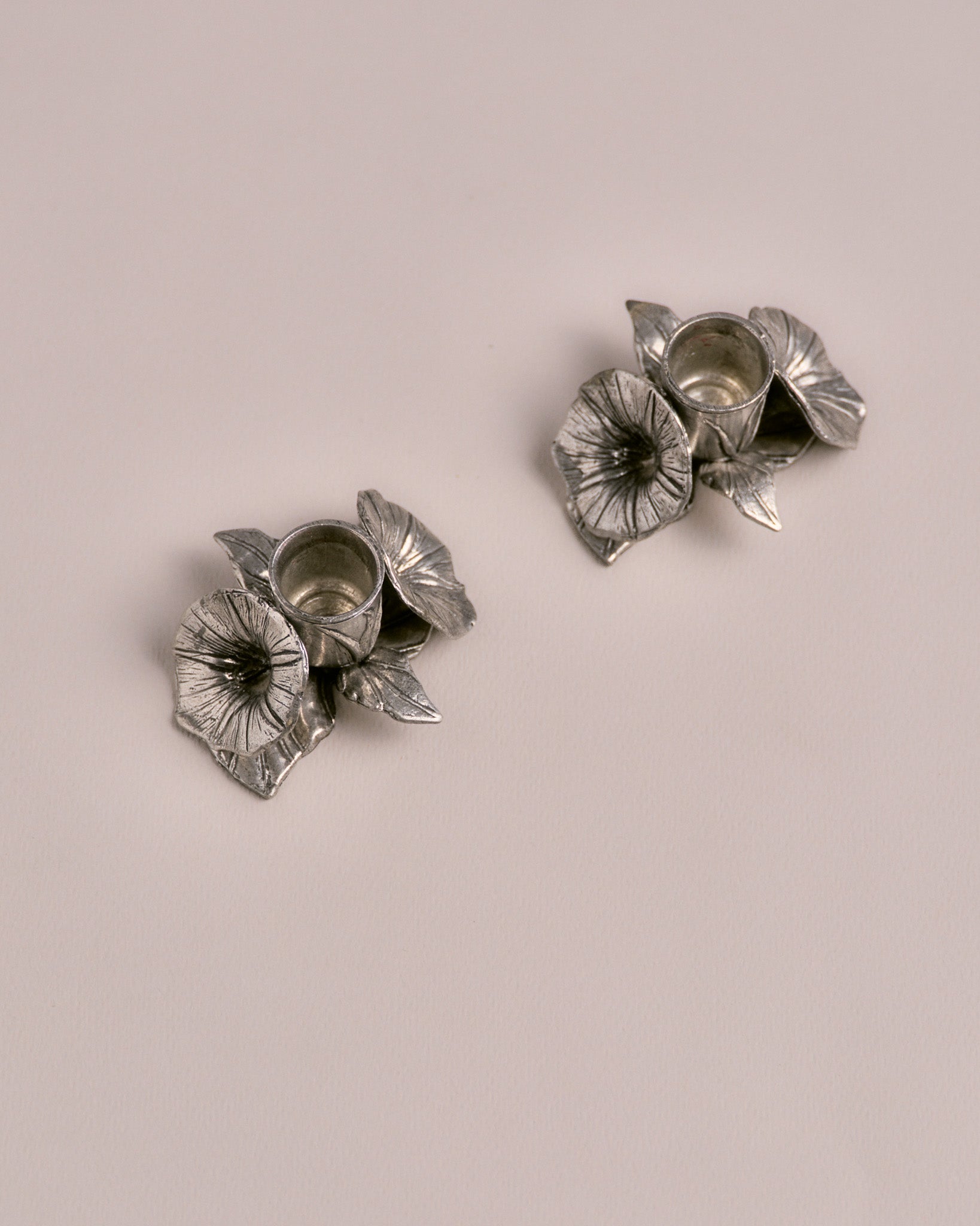 Paire de bougeoirs un feu en étain. Décor naturaliste de fleurs et de feuillage entourant le socle. Très bel état, présente une légère patine conforme à l'âge et à l'usage.