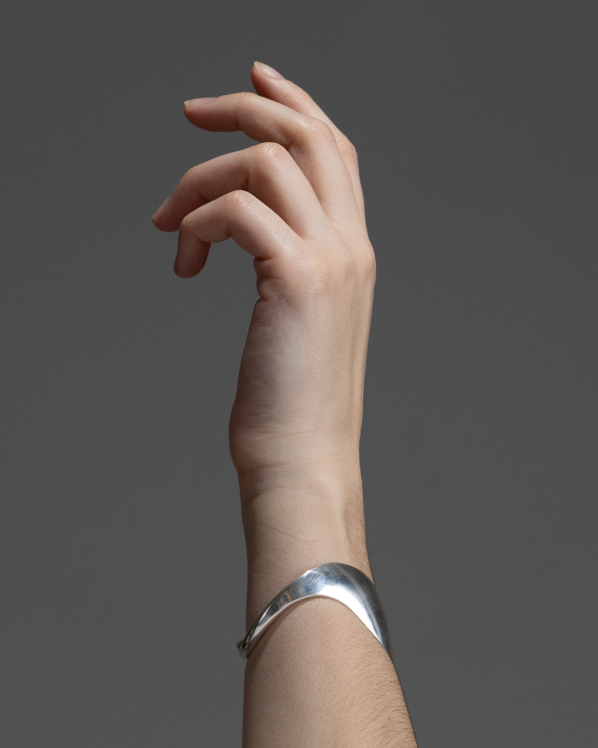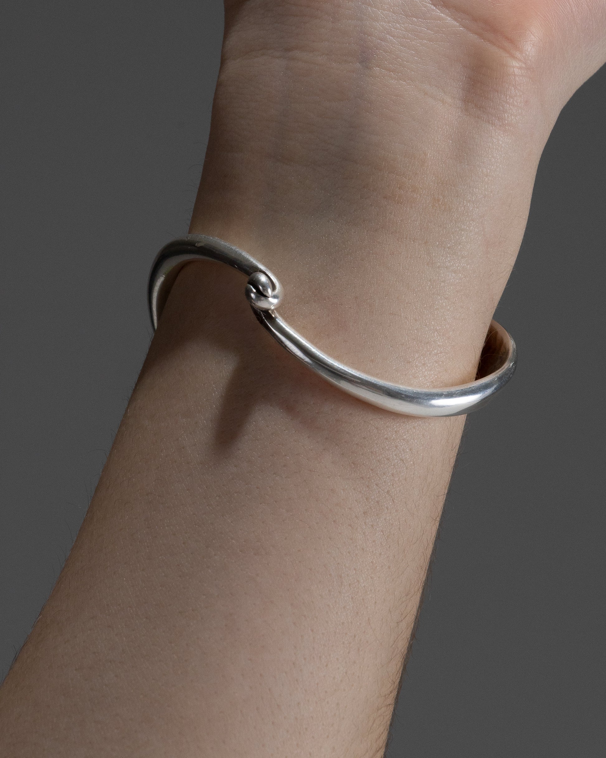 Bracelet en argent massif 950 par l’artiste Jacques Moniquet. Entièrement façonné à la main, il présente une forme ondulante et irrégulière, révélant la singularité du geste artisanal.
