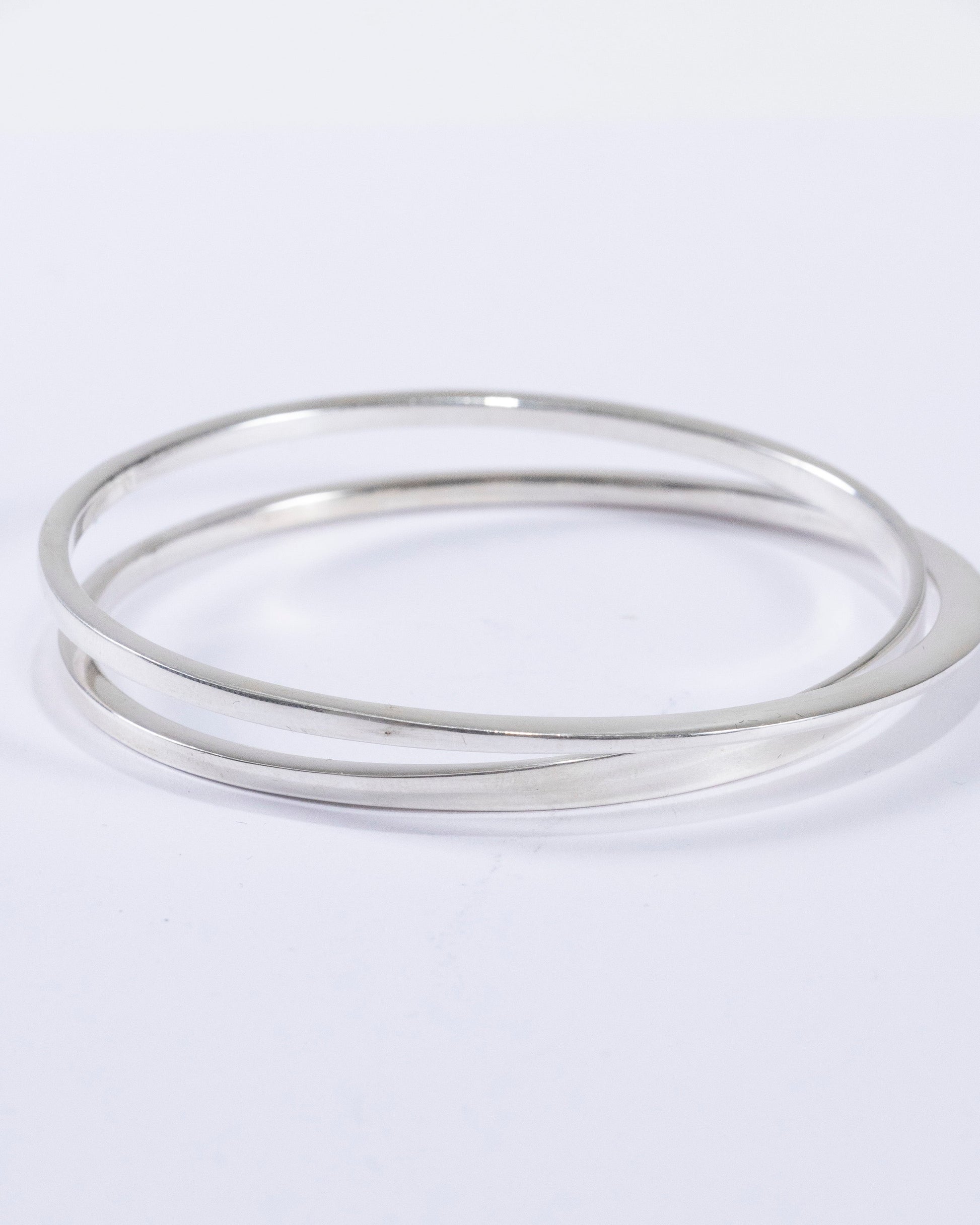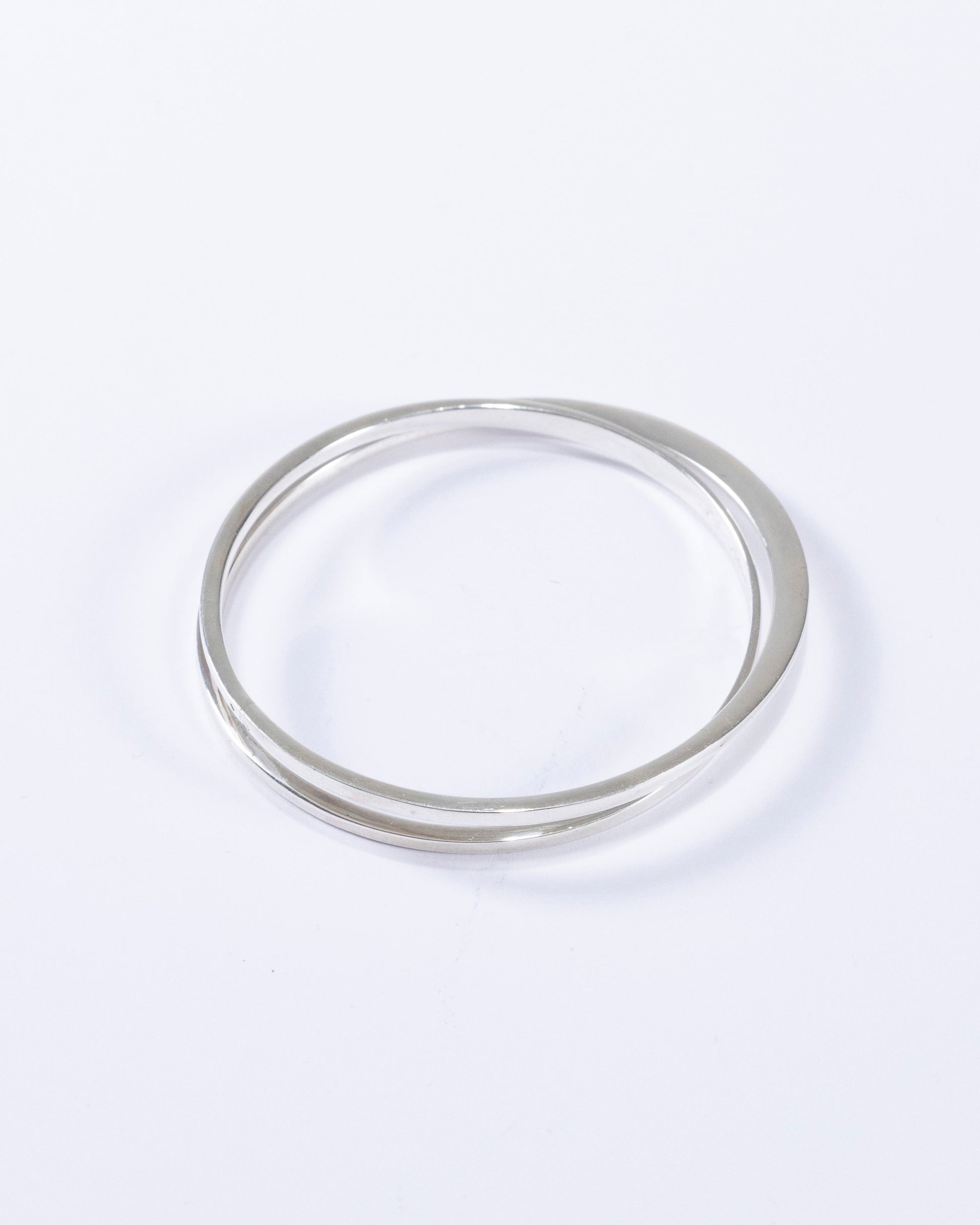 Bracelet double croisé en argent massif 950 par l'artiste Jacques Moniquet. Son design entrelacé et minimal est sublimé par une finition polie qui capte la lumière. L’intérieur est signé "Moniquet 65".