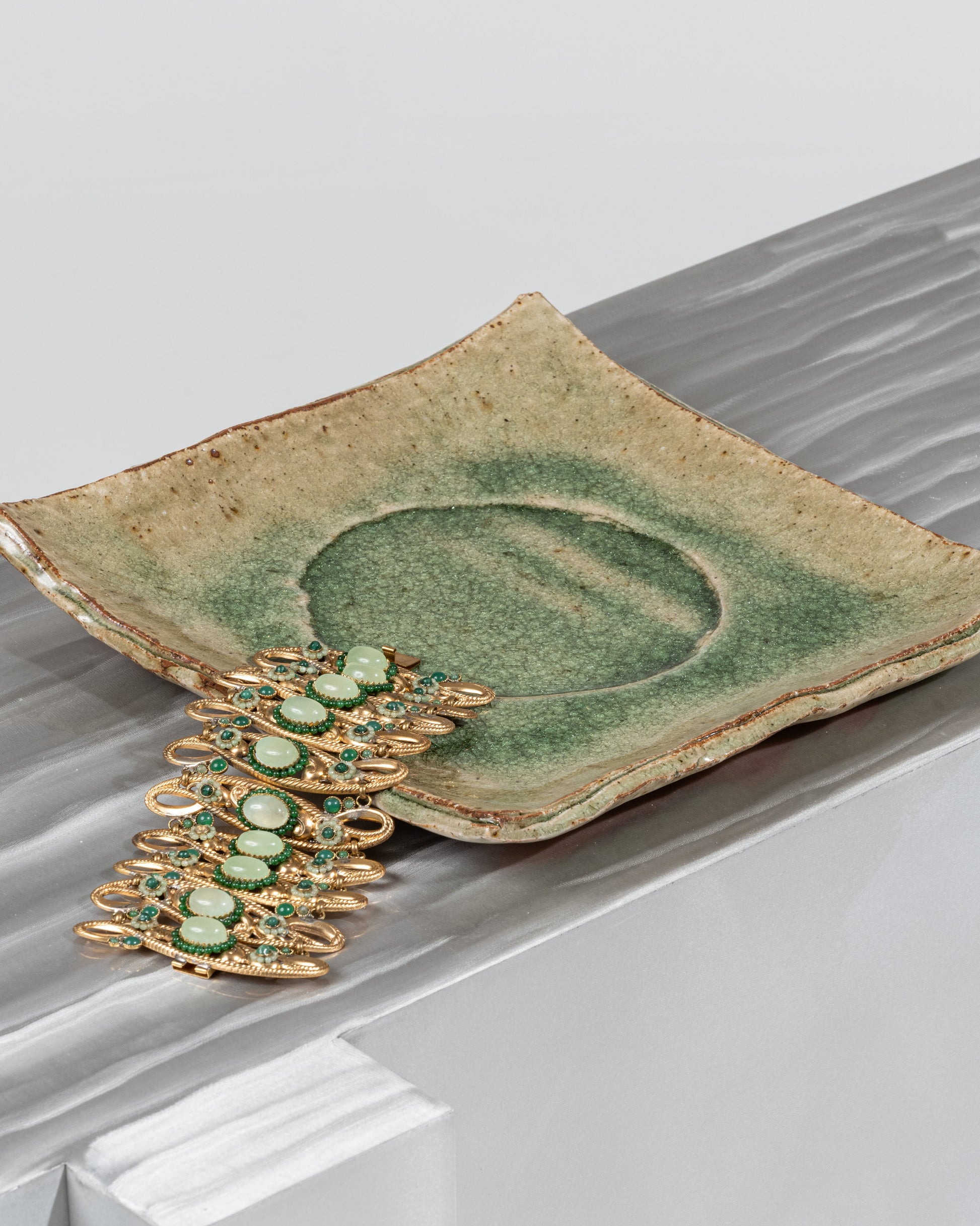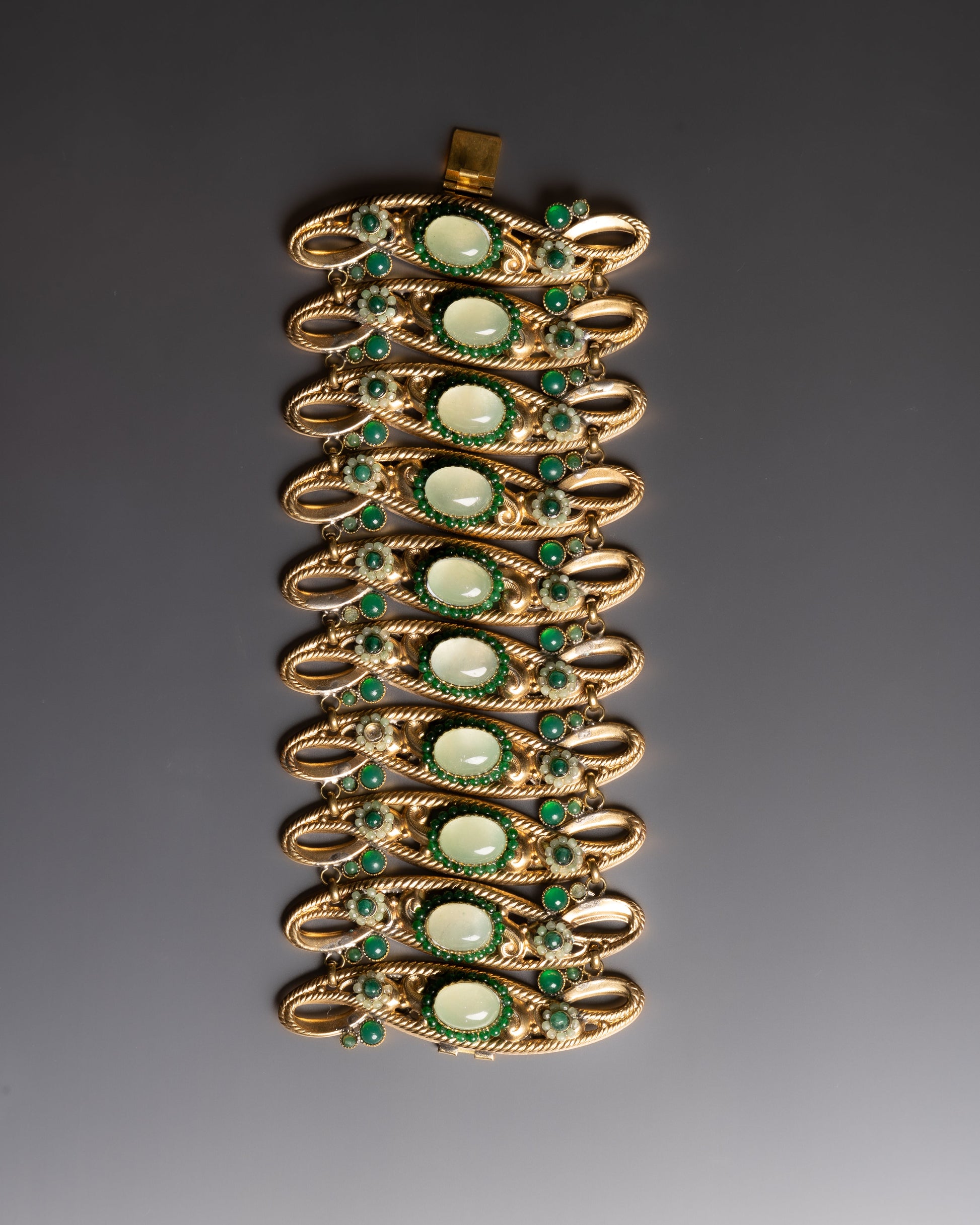 Bracelet manchette en métal doré à incrustations de pierres couleur émeraudes. En superbe état.