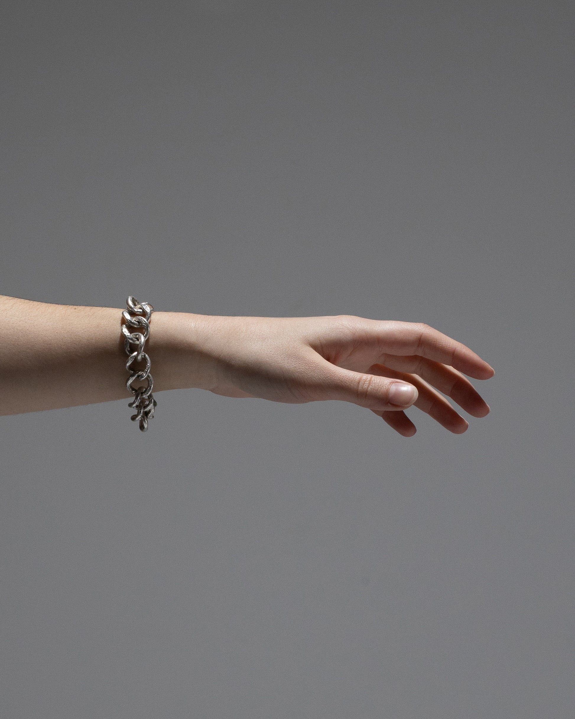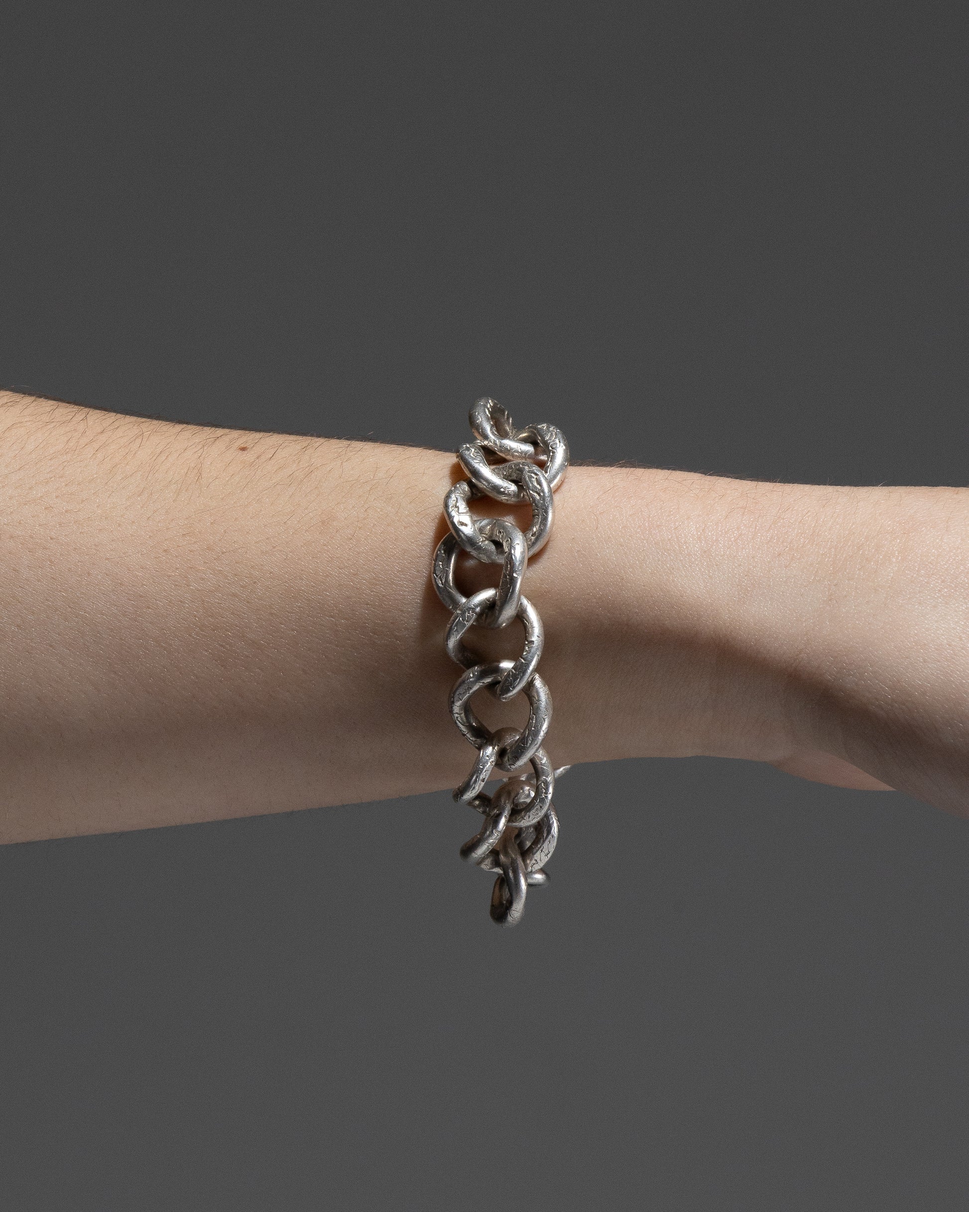 Bracelet en argent massif 950 par l’artiste Basile Dolfus. Entièrement façonné à la main, il se compose de fins maillons entrelacés, créant une maille souple et élégante.
