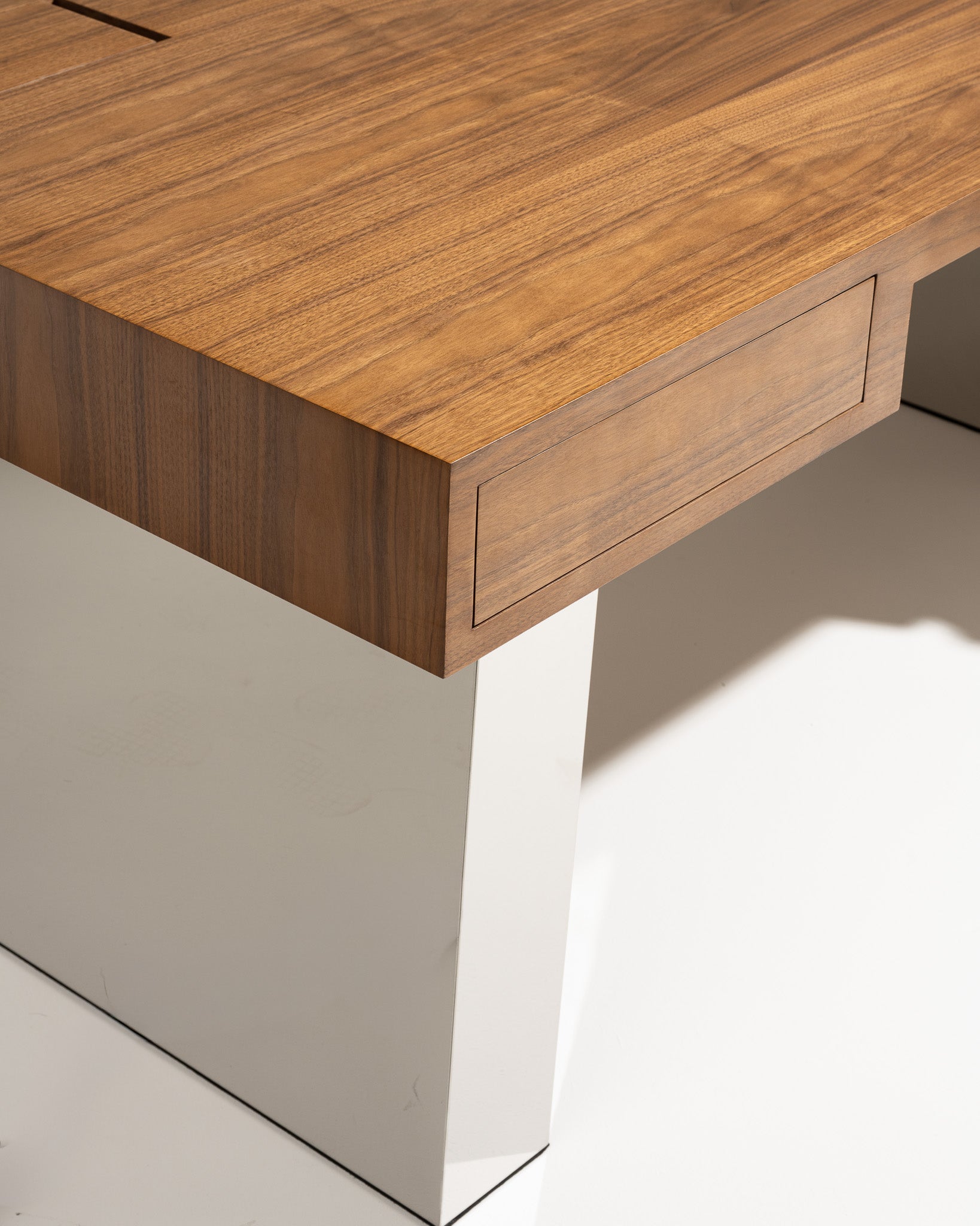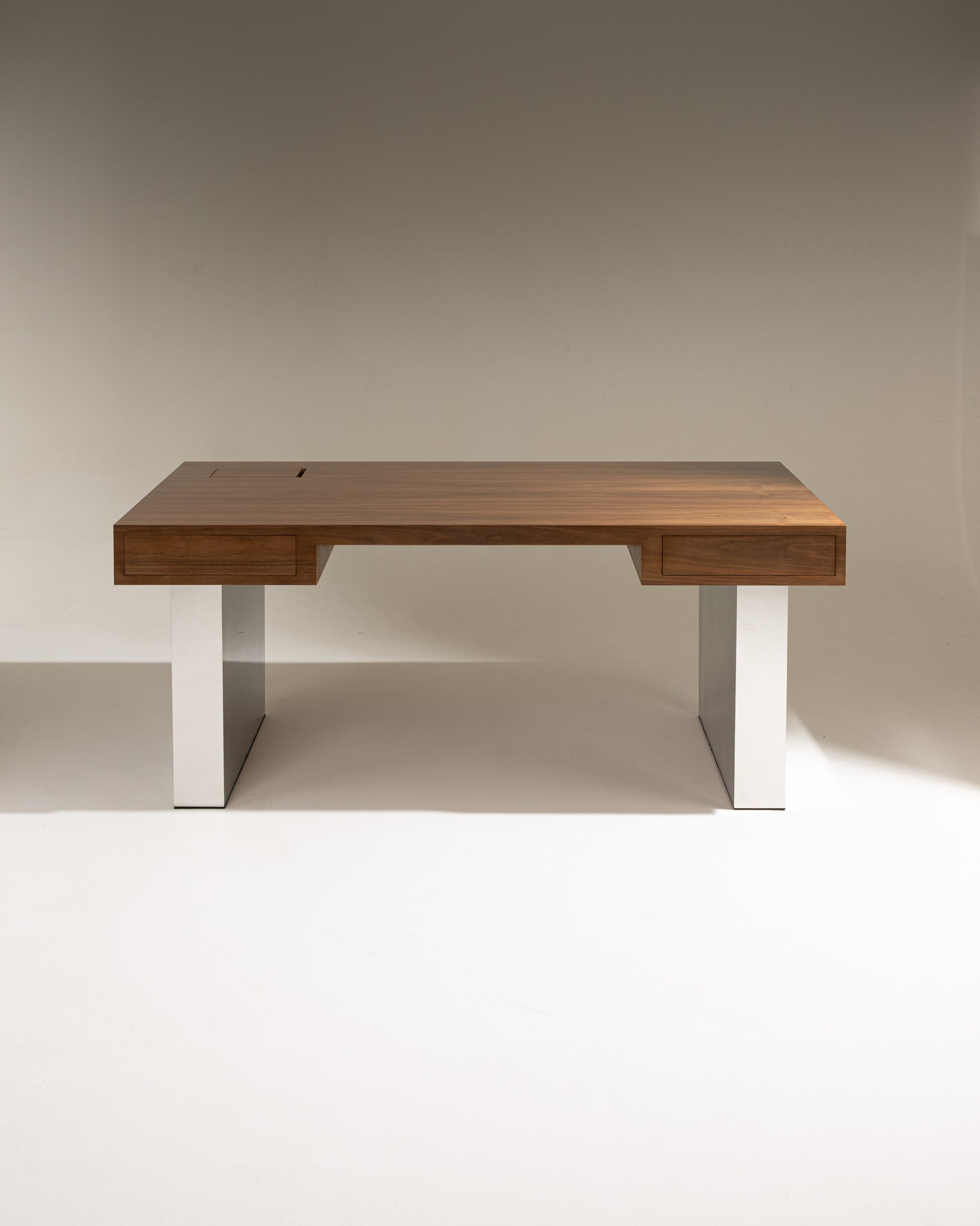 La structure repose sur un piètement architectural en acier inoxydable poli miroir, formant deux volumes pleins. En façade, le bureau est équipé de deux tiroirs latéraux intégrés, à ouverture coulissante, alignés dans l'épaisseur du plateau.