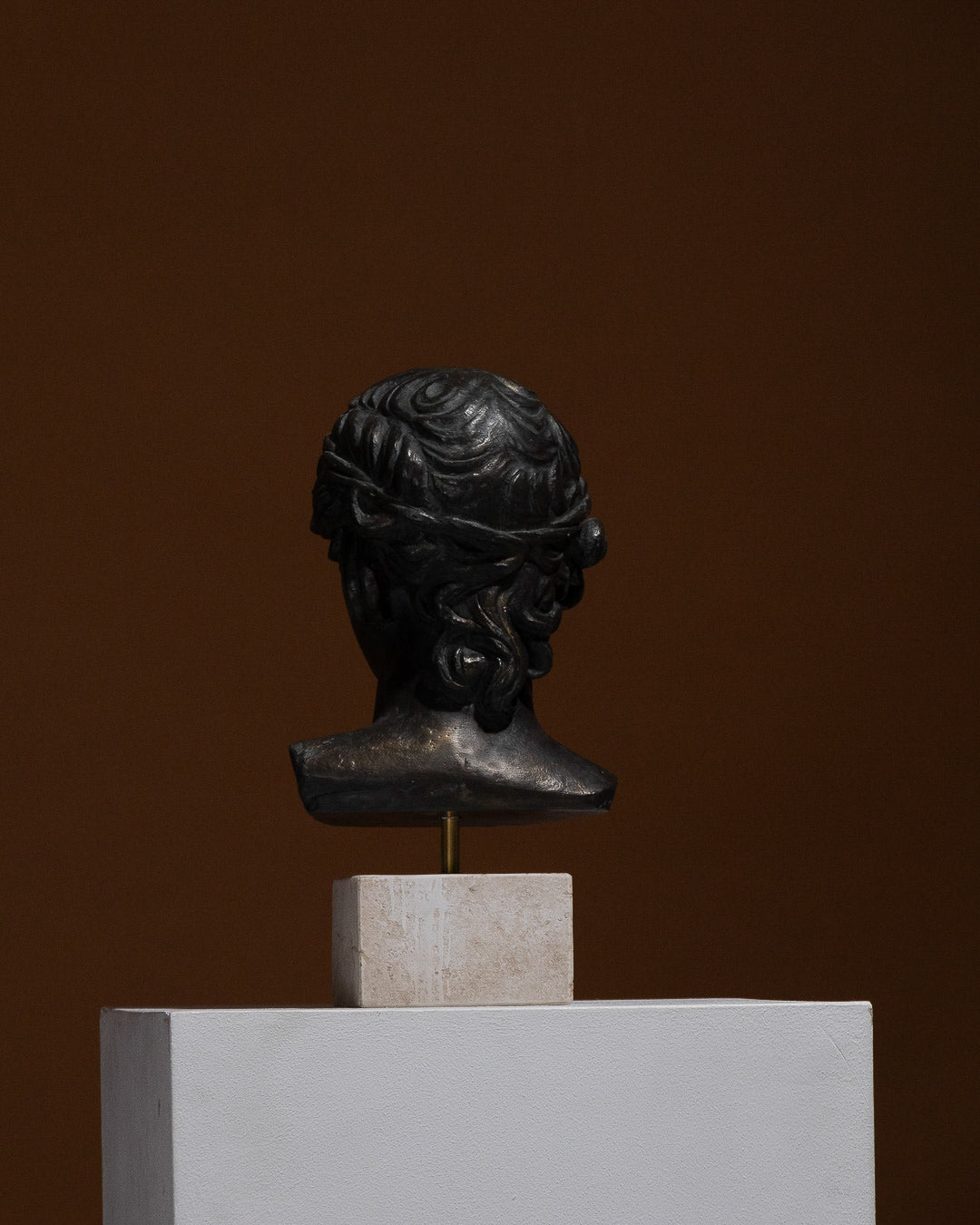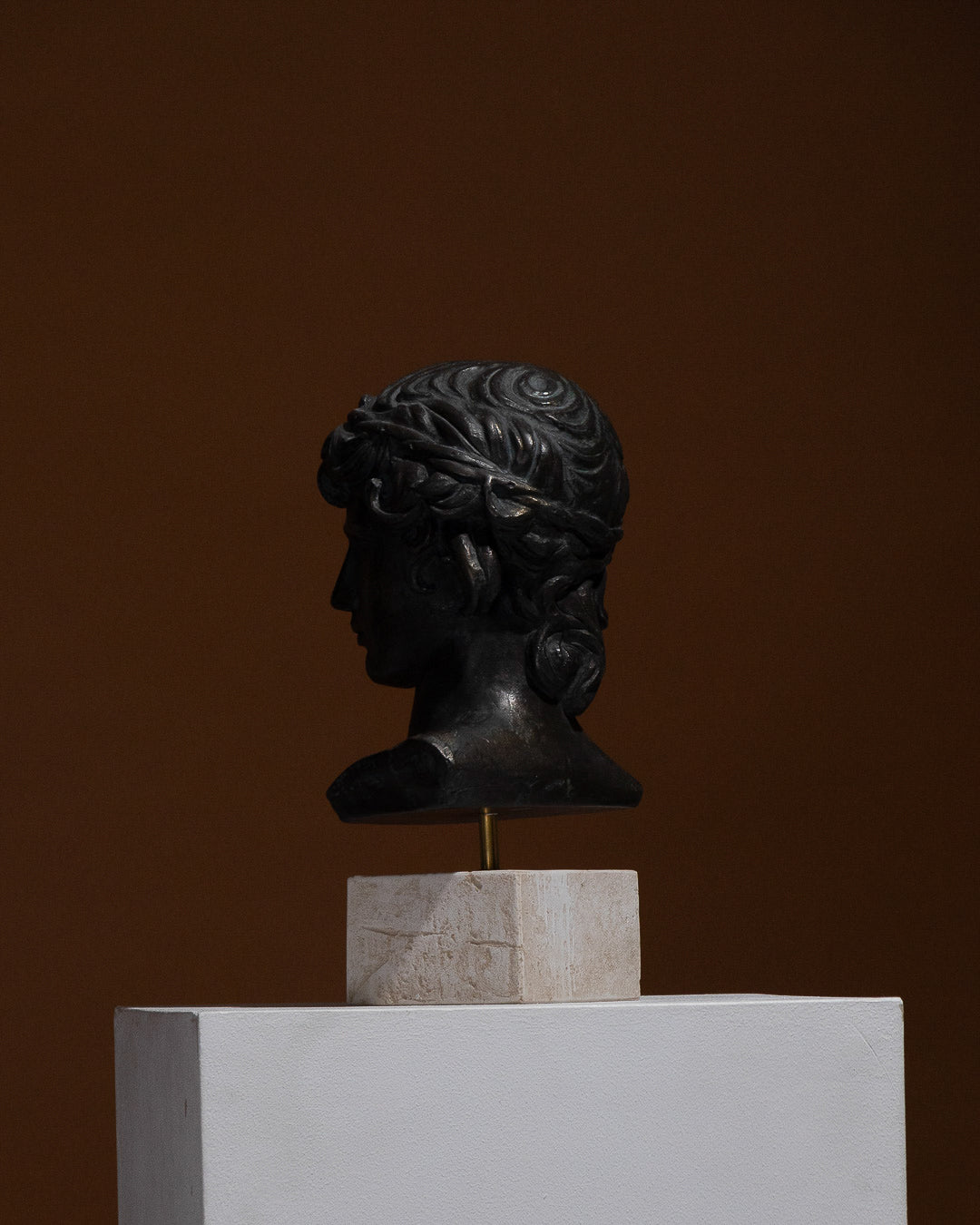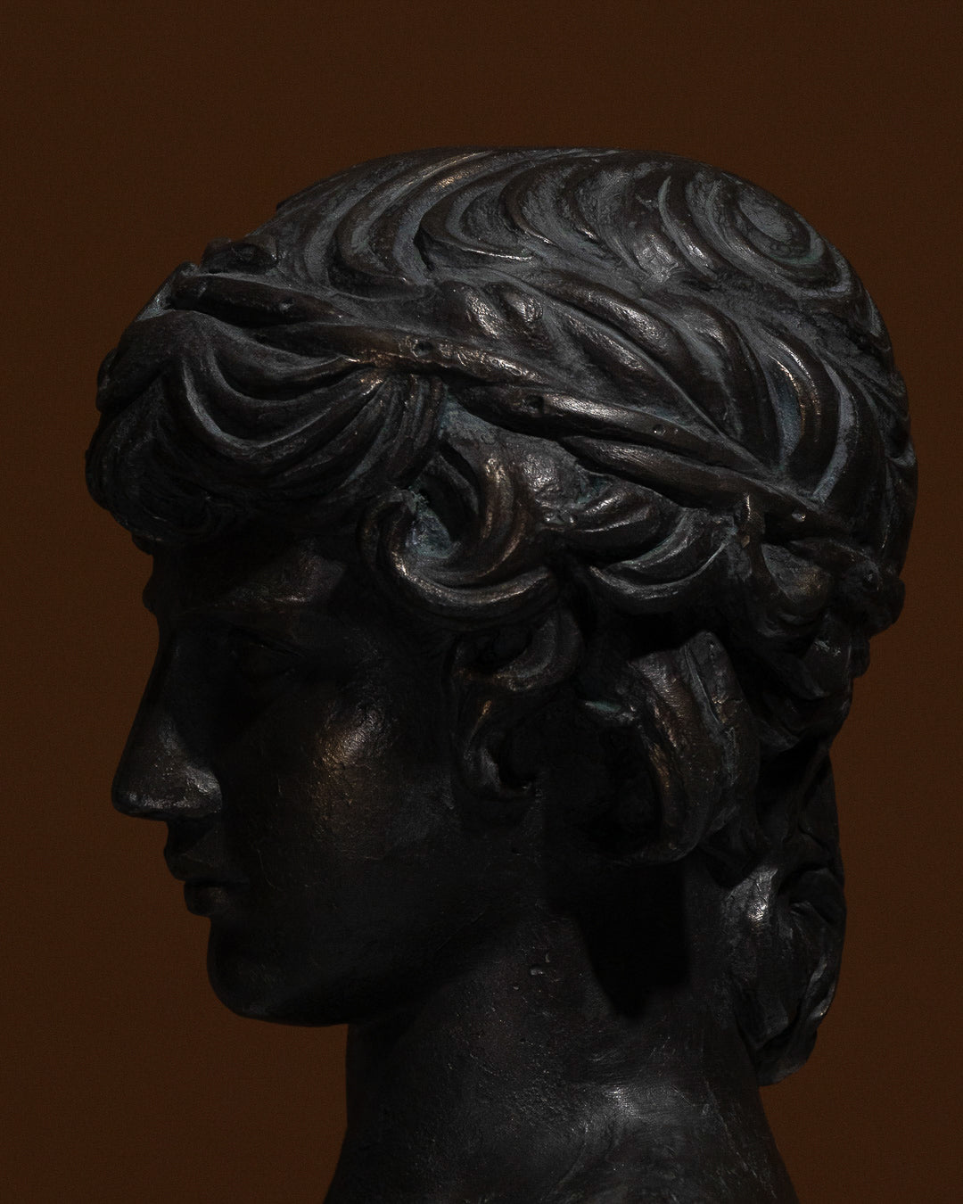 Buste académique en poudre de marbre patiné en bronze à l'effigie d'Antinoüs, favori de l'empereur romain Hadrien. Repose sur un socle carré. Légère patine du bronze due au temps, très bon état.