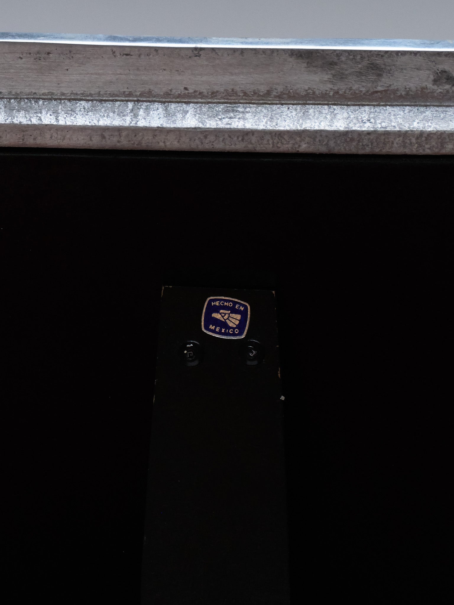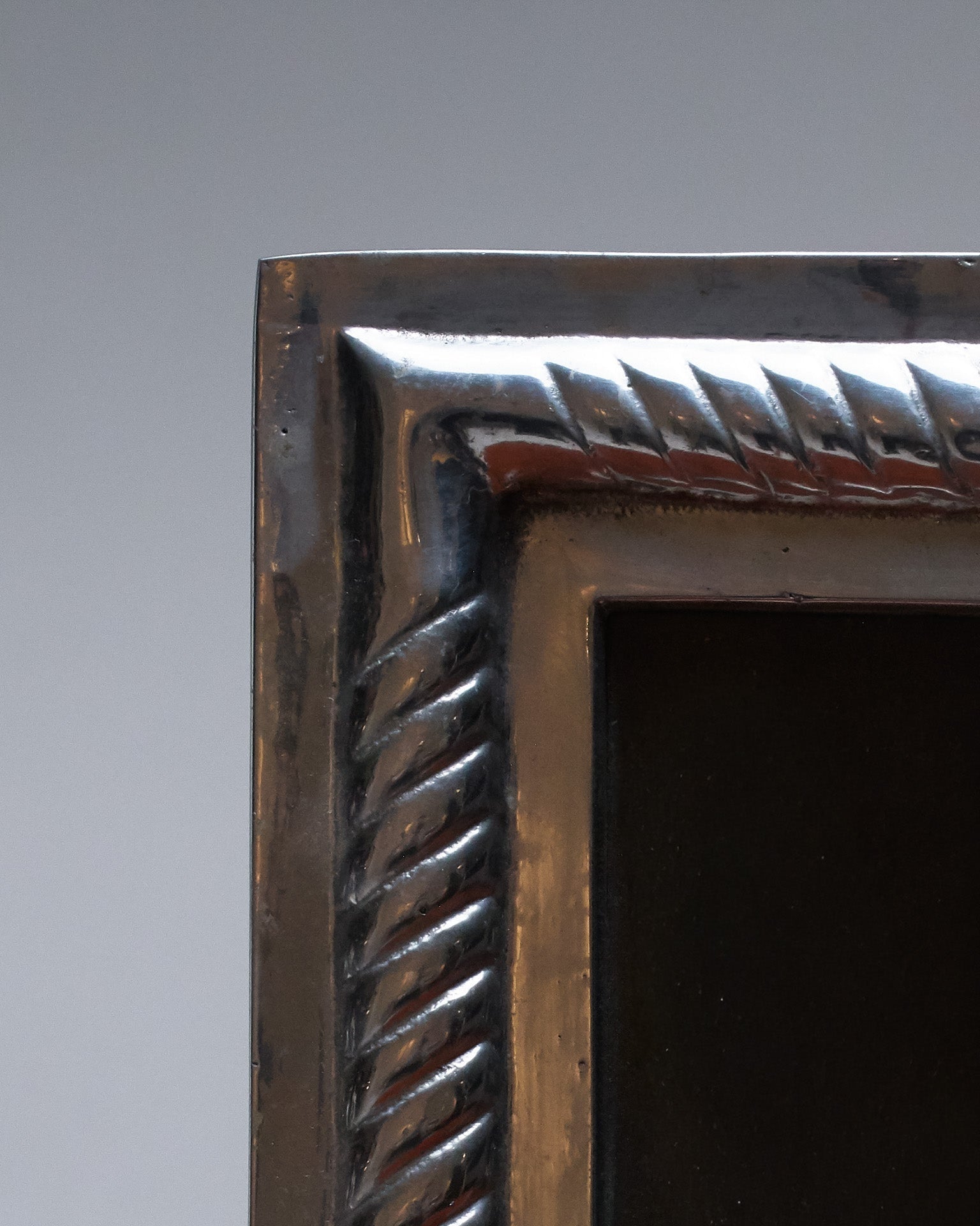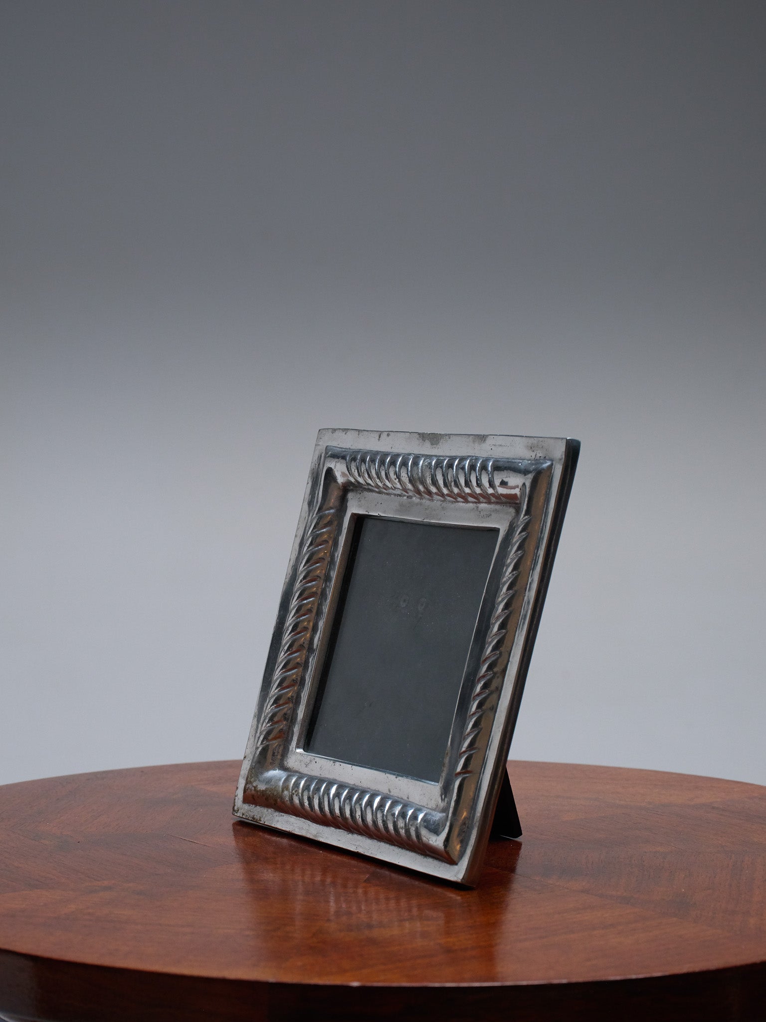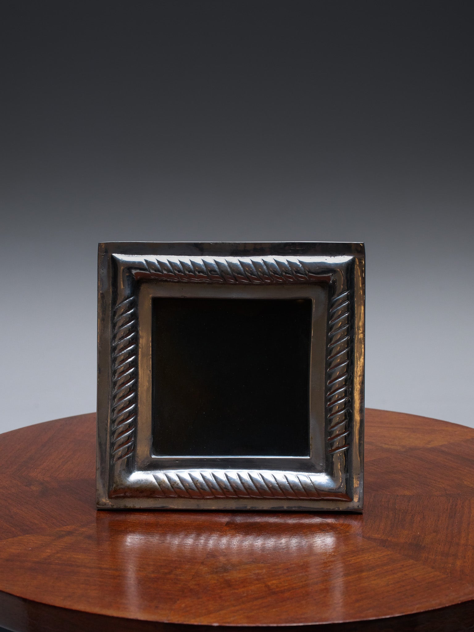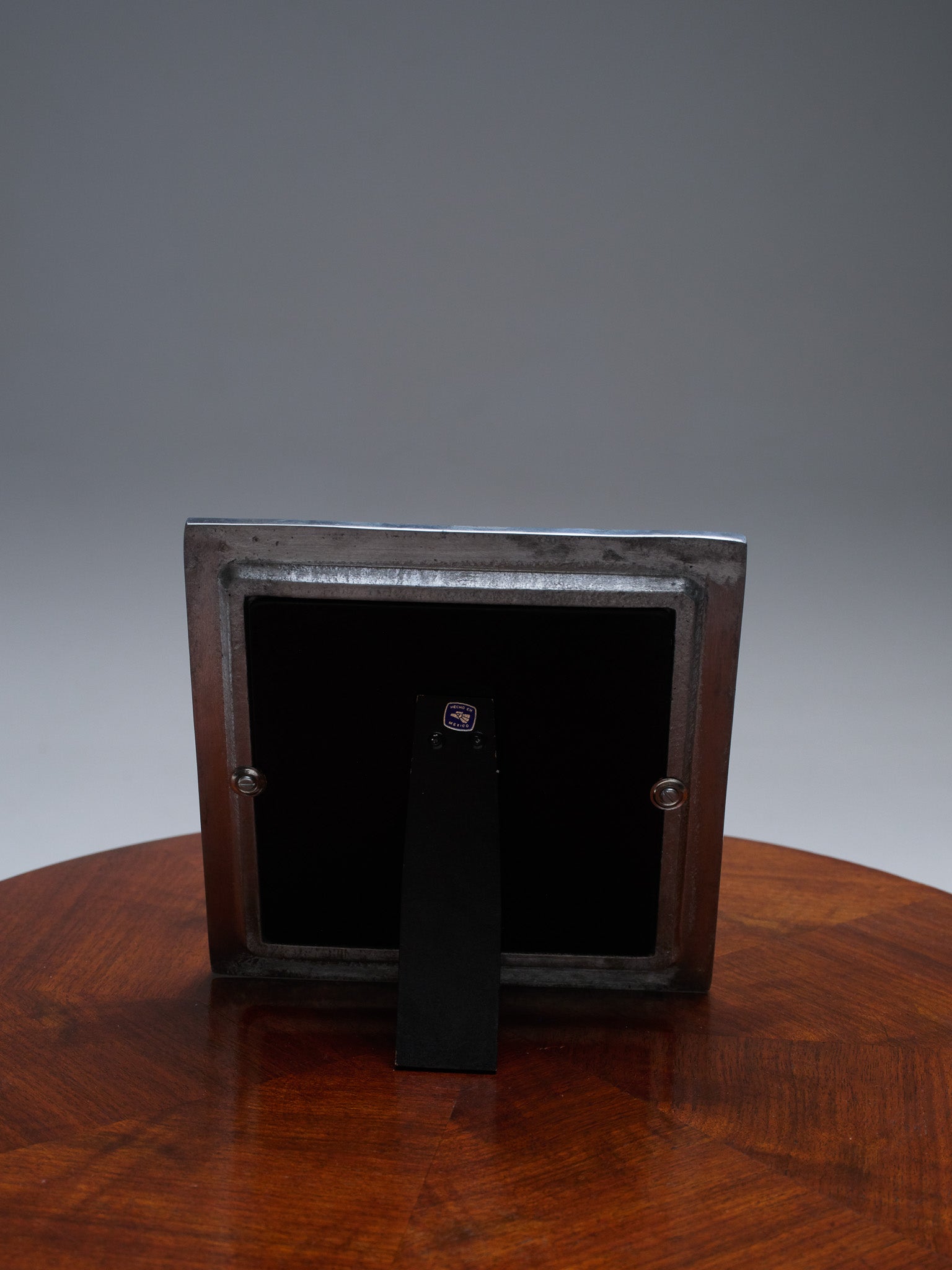 Cadre photo en métal de forme carrée. Encadrement à décor mouluré en relief, dans le style Art déco. Dos à poser. Travail typique des années 1930, estampillé 'Hecho en Mexico' au dos. Bel état général, avec quelques traces conformes à l’âge et à l’usage.