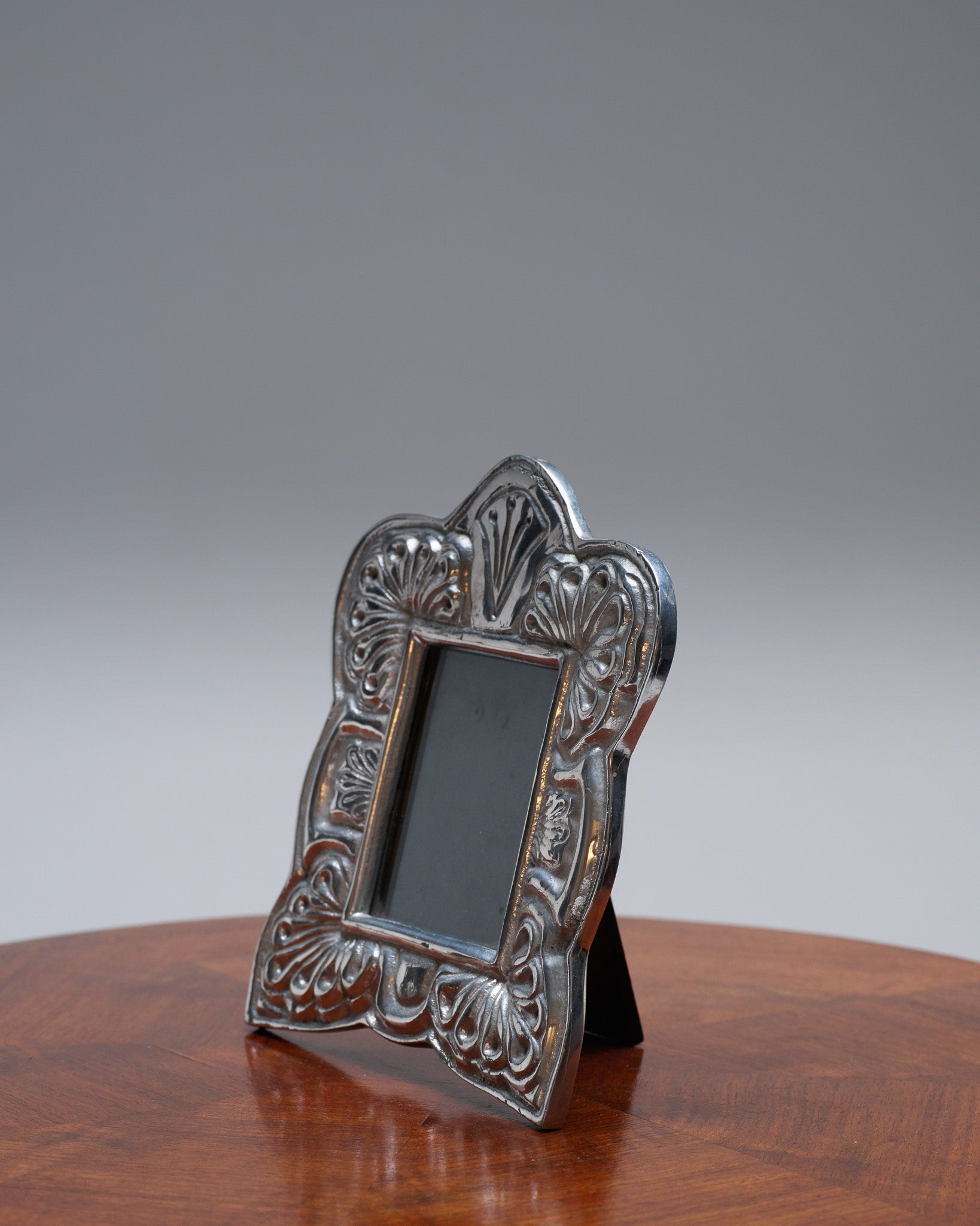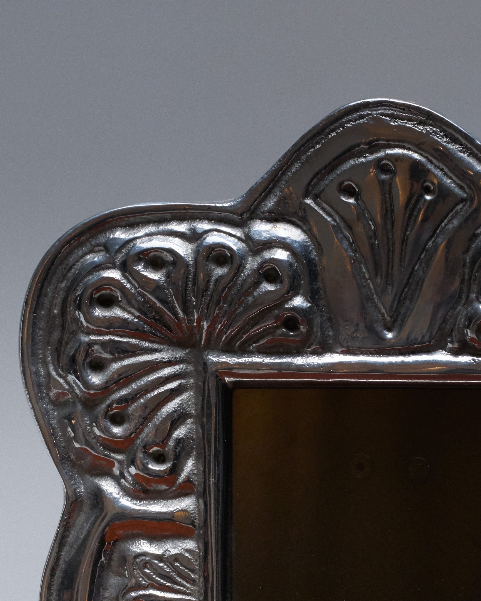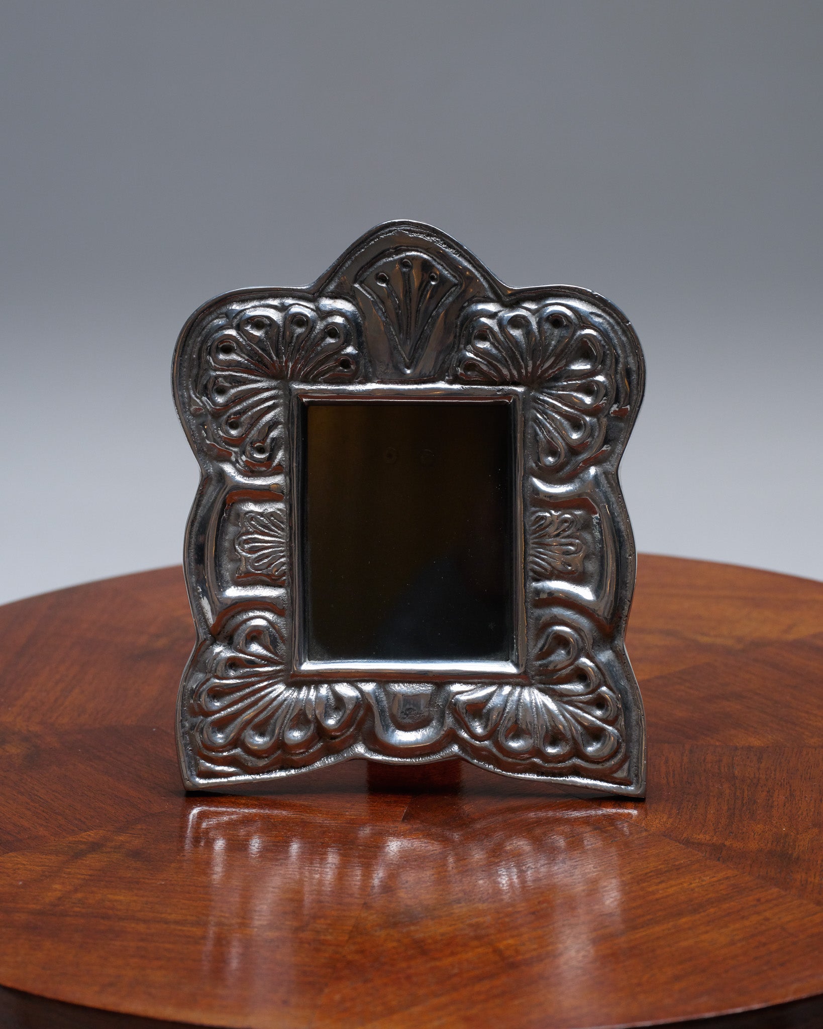 Cadre photo en métal de forme rectangulaire, présentant un décor de feuillage en relief sur son pourtour. Motif symétrique, travail typique des années 1960. Dos à poser. Bel état général.