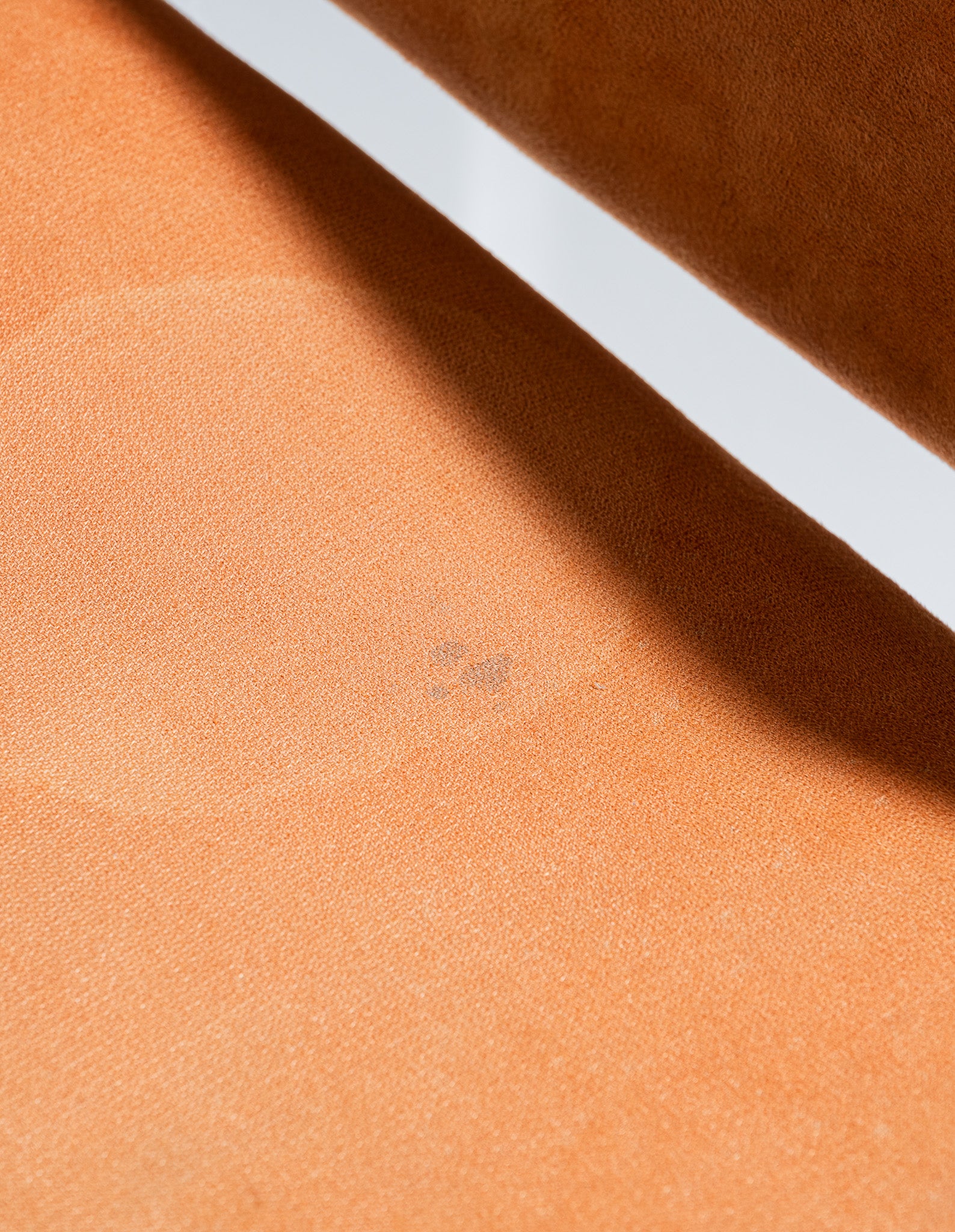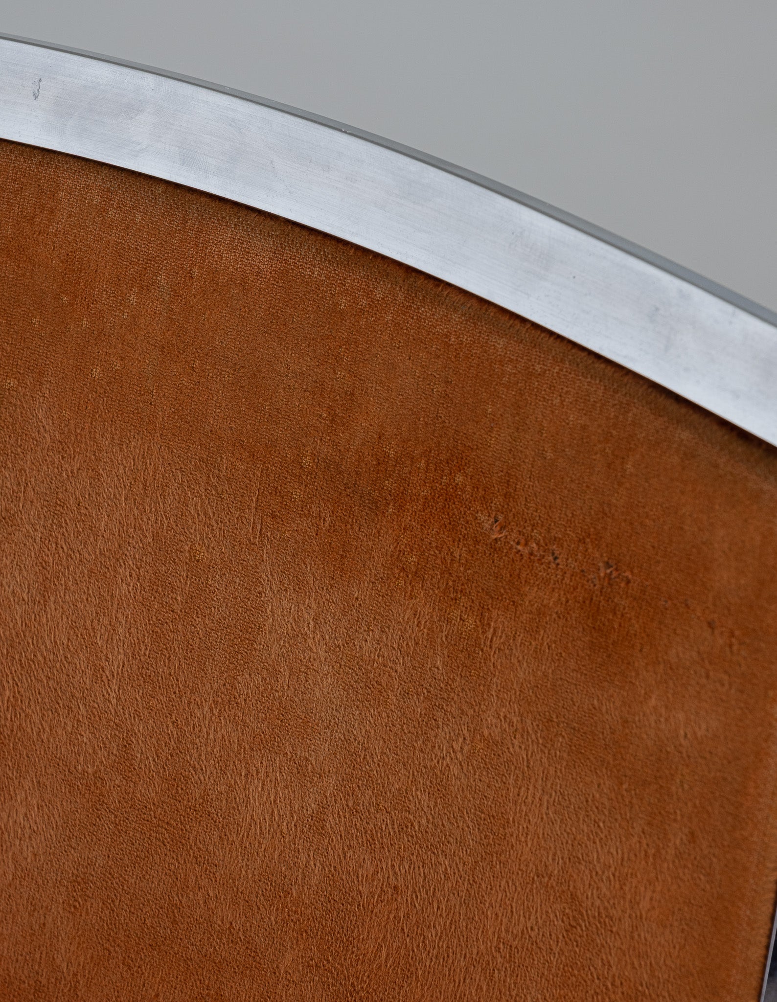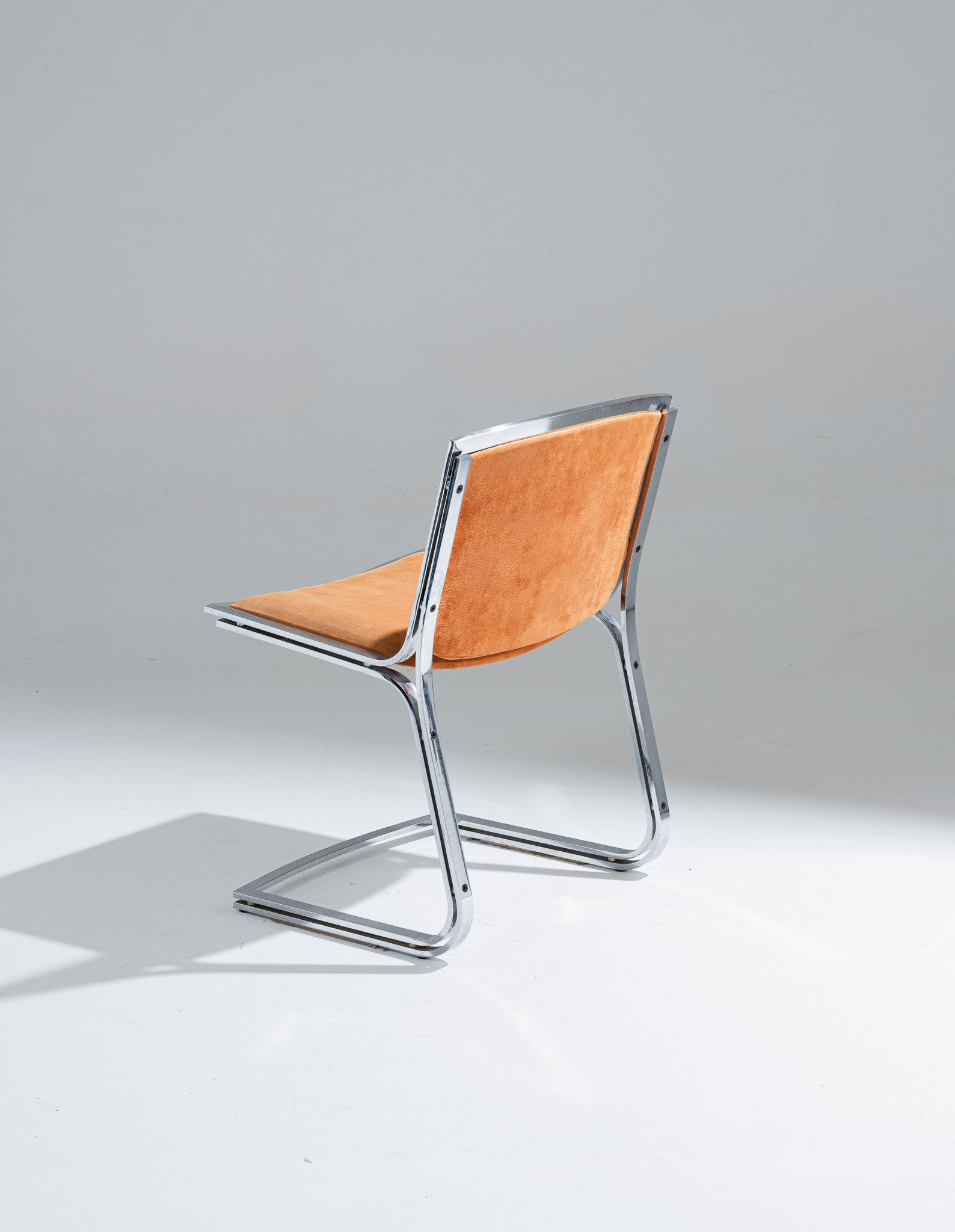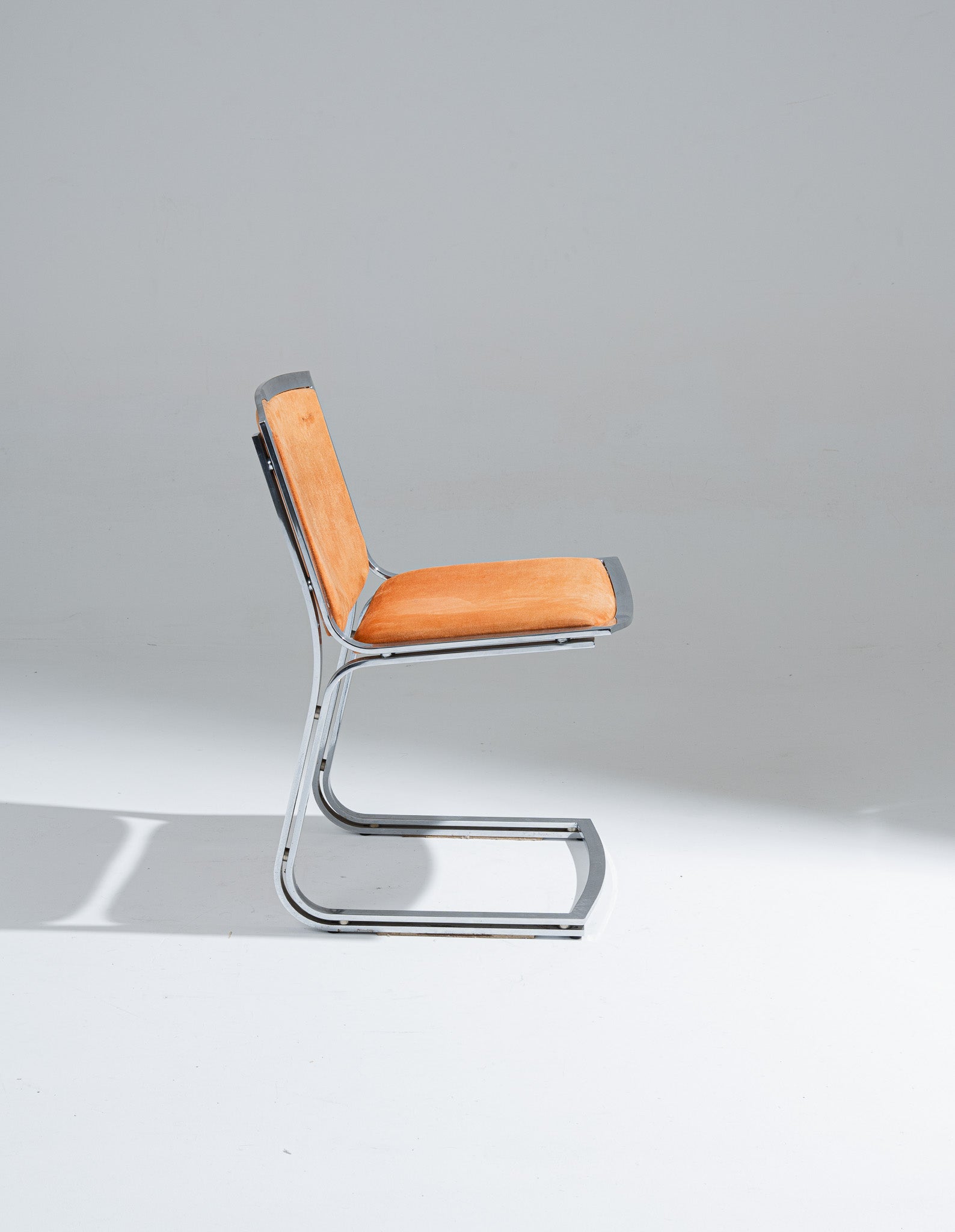 Chaise au piètement en console, réalisées par le designer italien Sergio Asti dans les années 1970. Conçues en acier chromé poli, elles sont habillées d’un velours orangé d’origine. Le velours présente quelques traces d’usage cohérentes avec le temps. En bon état général, à noter une tâche sur l'assise.