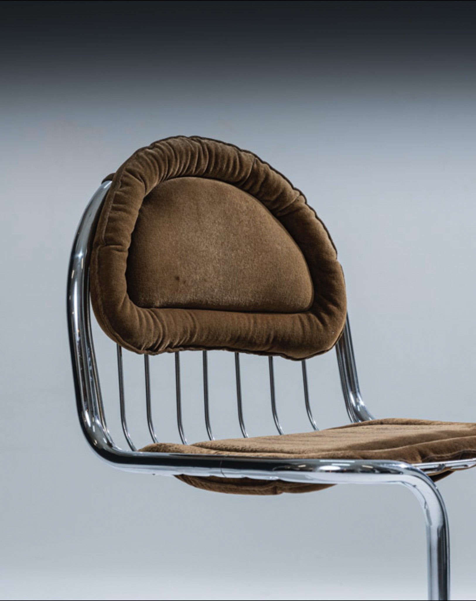 Chaise en métal et velours conçue par Gastone Rinaldi pour RIMA dans les années 1970. Sa structure en fil et tube d’acier chromé lui donne une silhouette moderne et légère, typique de l'esthétique des années 70.