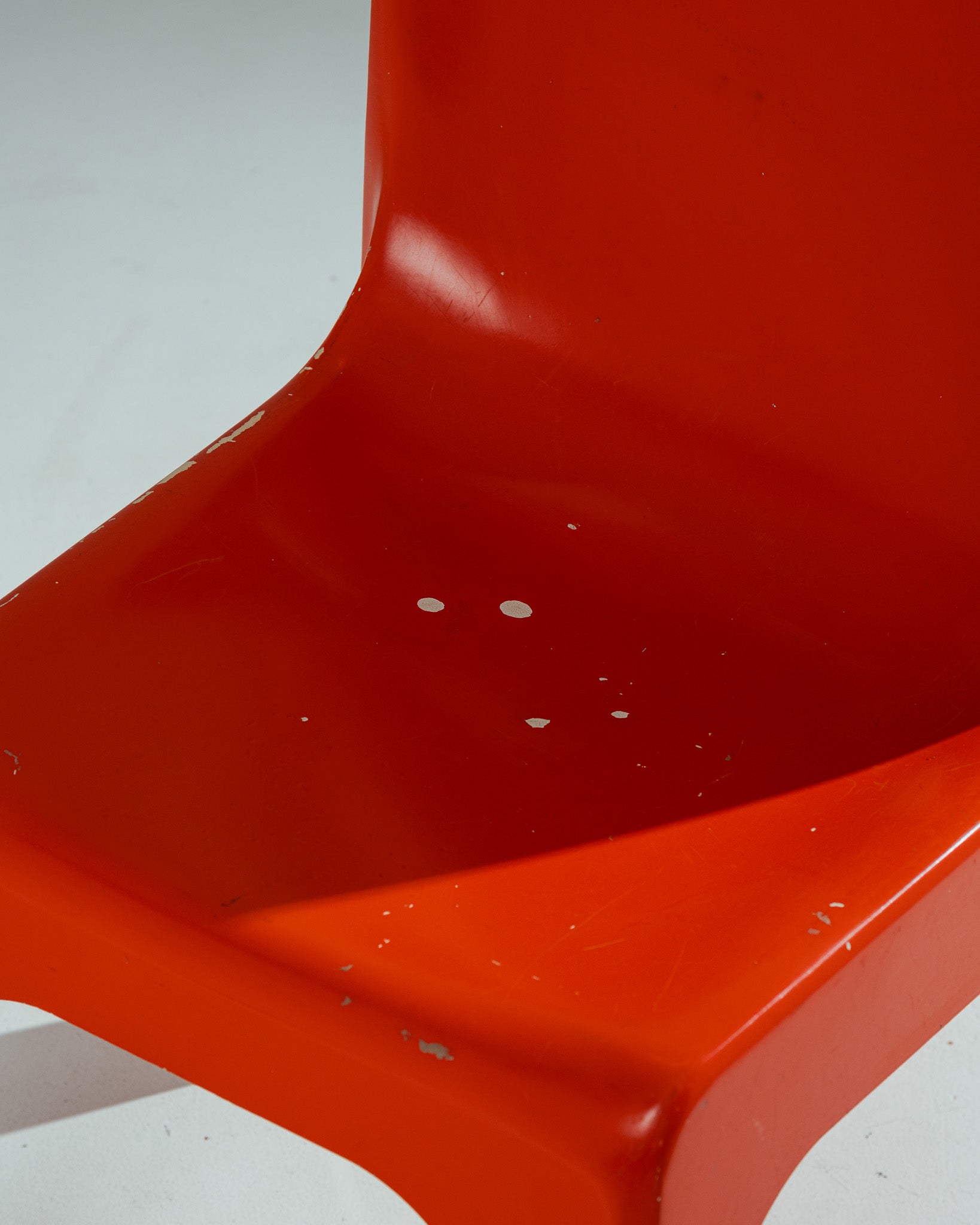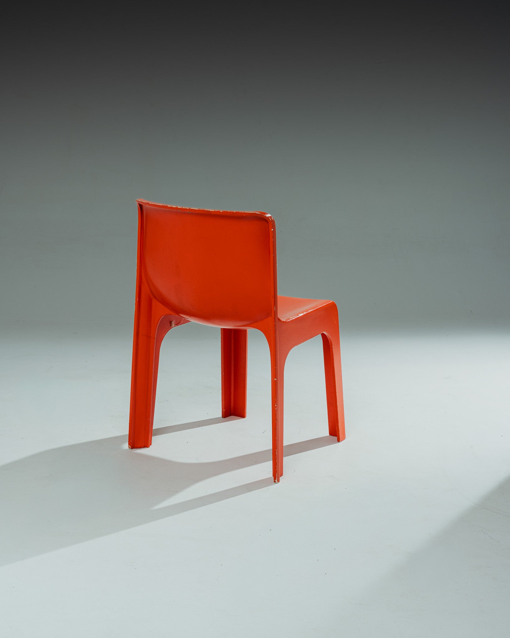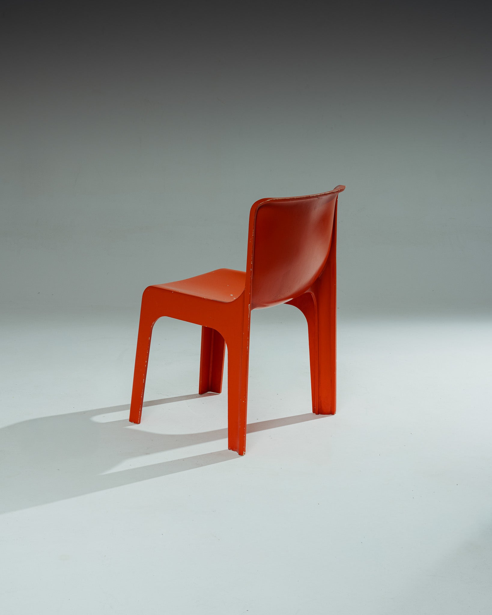 Chaise monobloc en polystyrène moulé par injection, renforcé et laqué rouge-orangé. Modèle dessiné par Étienne Fermigier, circa 1970. Structure d'un seul tenant, aux lignes continues reliant dossier, assise et piètement.