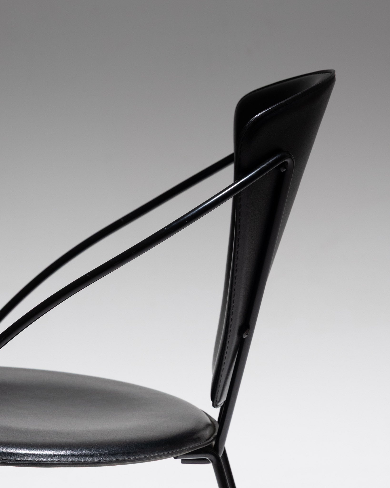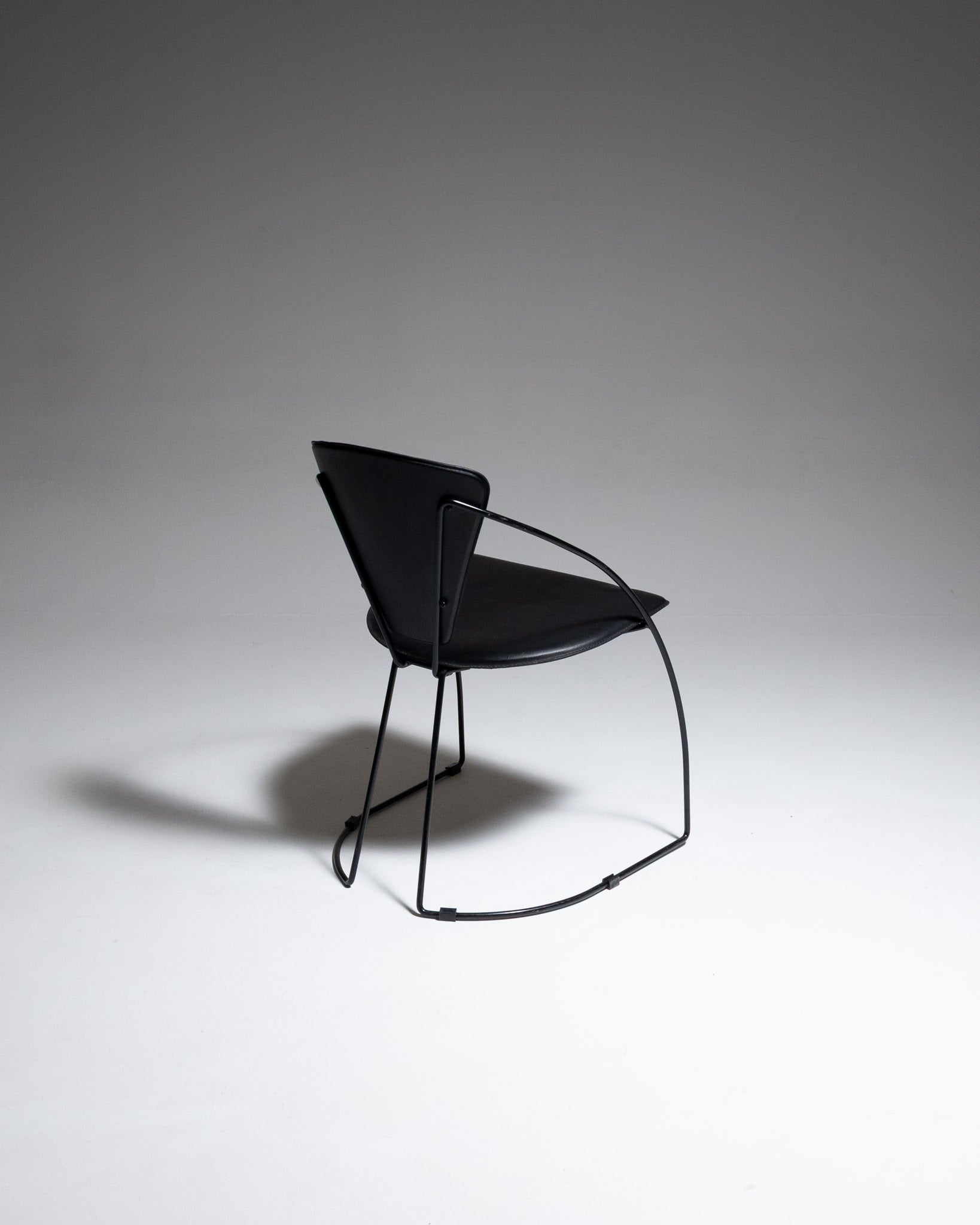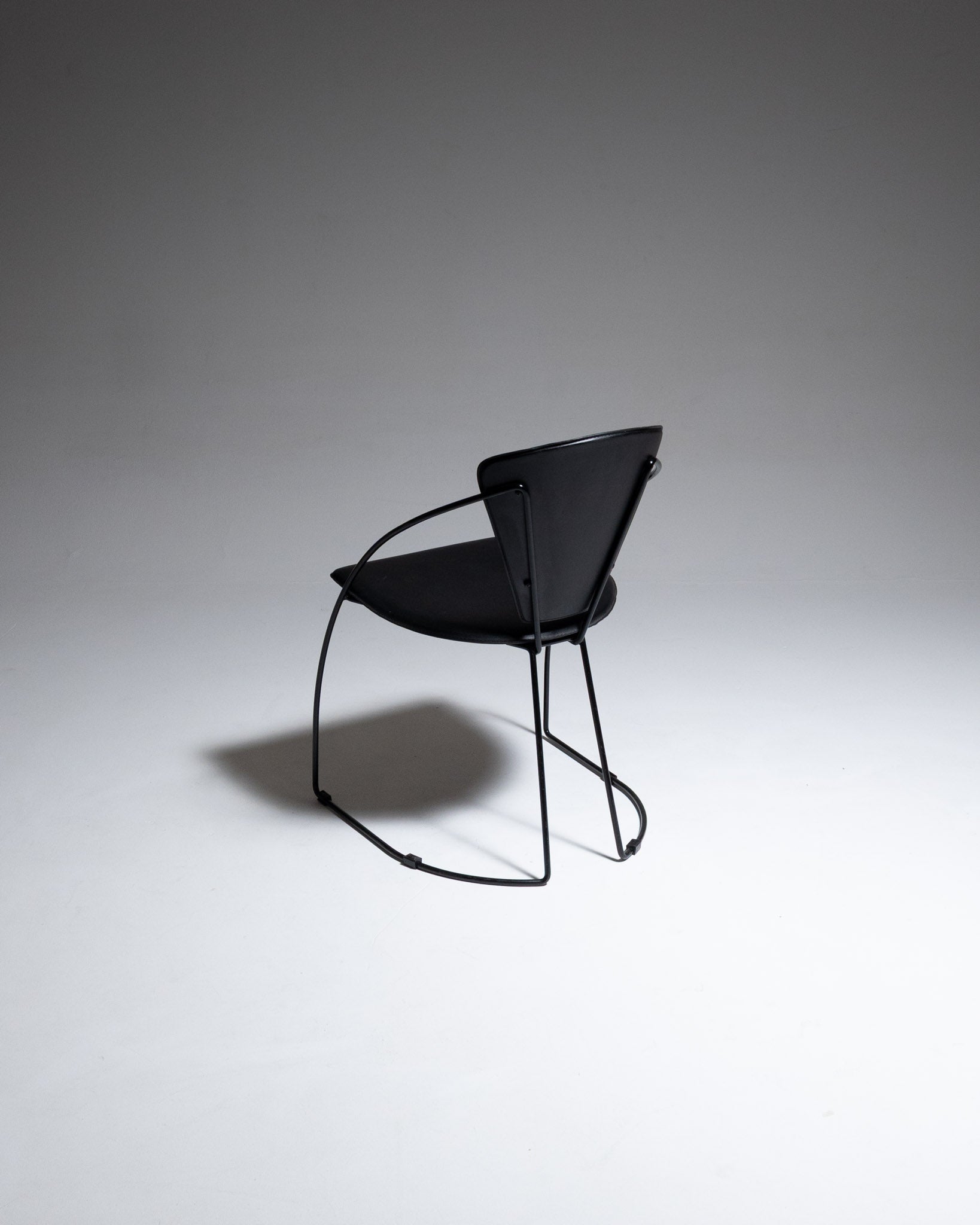 Chaise modèle Linda, éditée par Arrben, années 1960. Structure en métal laqué noir formant un piètement luge avec arceau arrière cintré. Assise et dossier en métal recouverts de cuir noir.