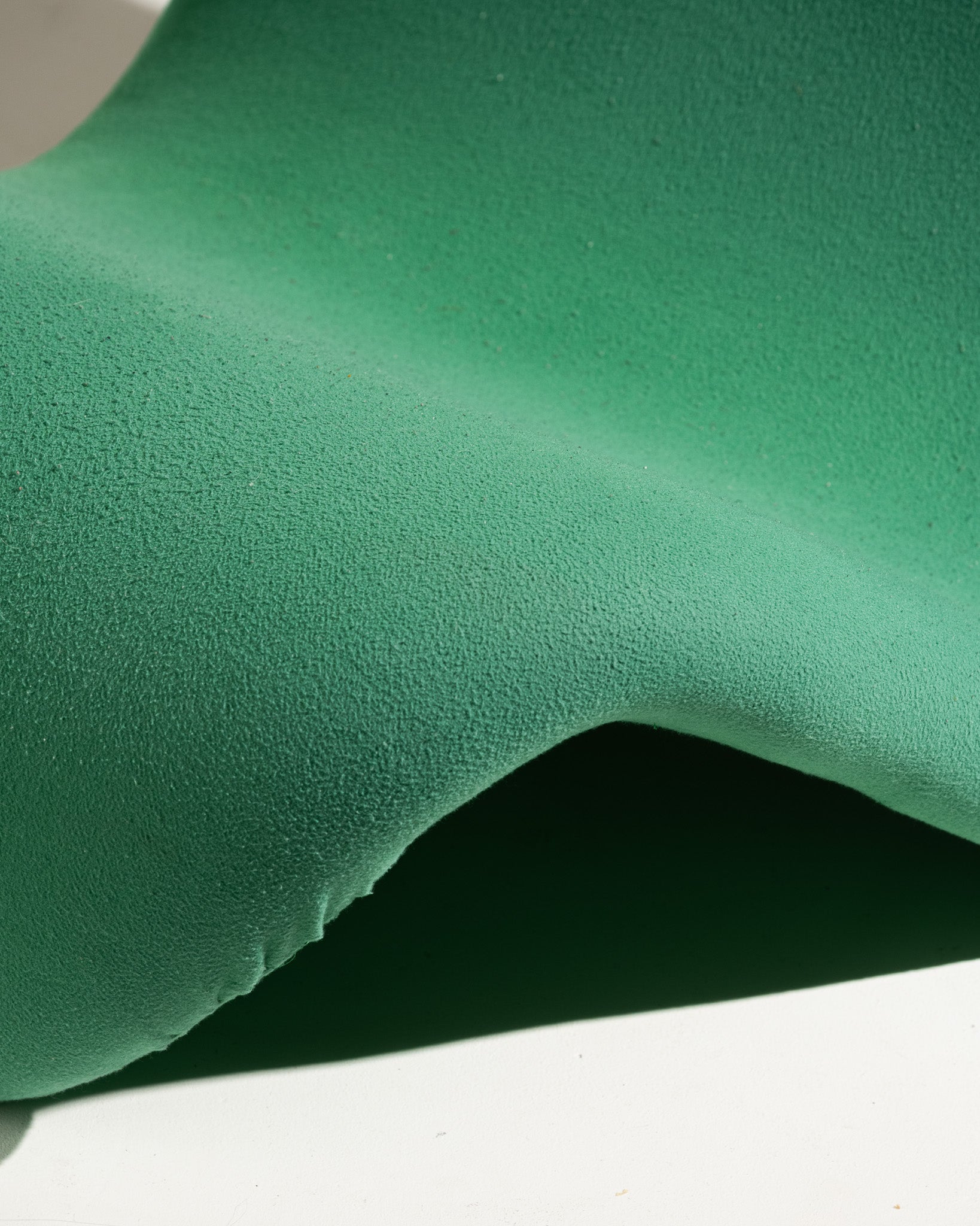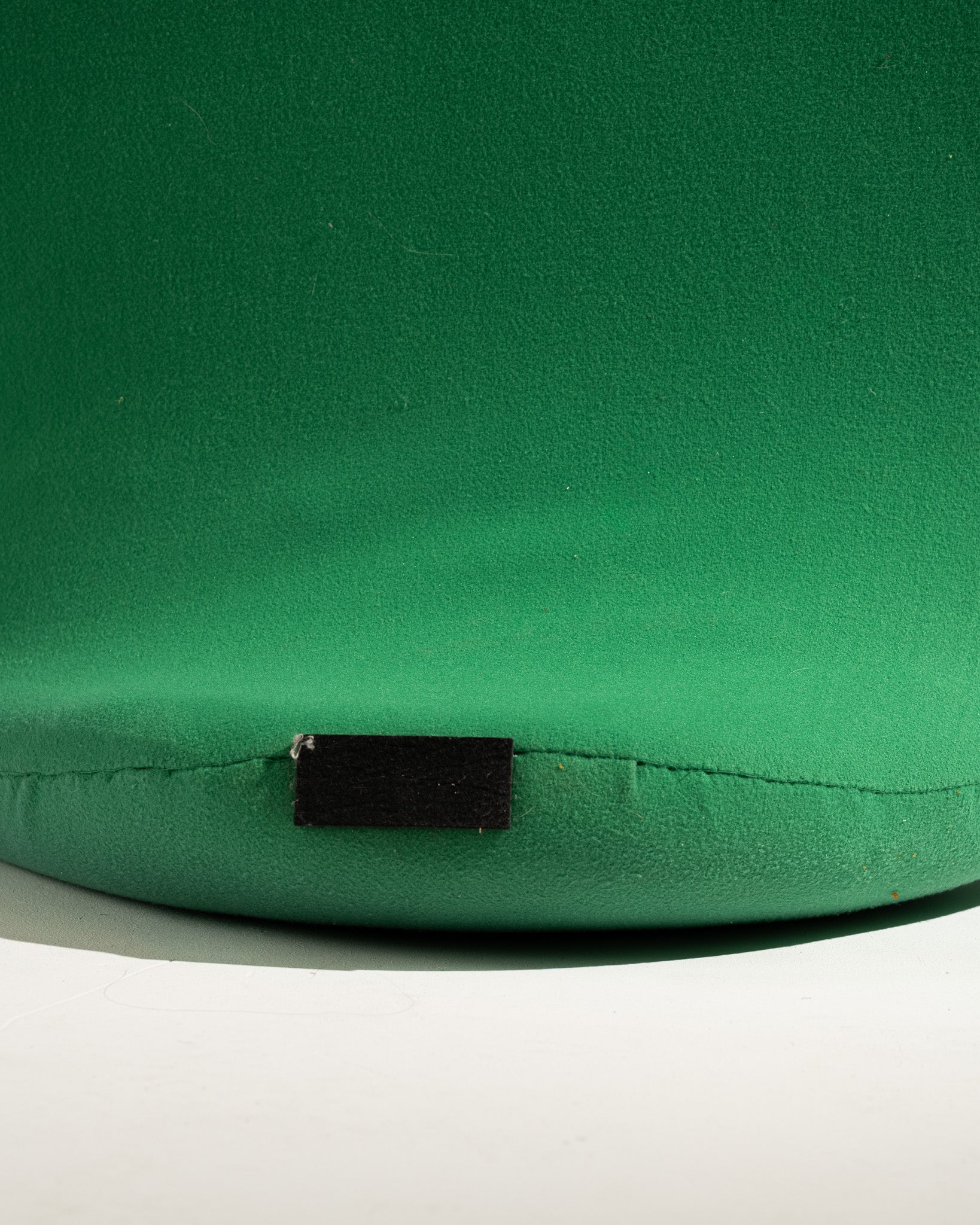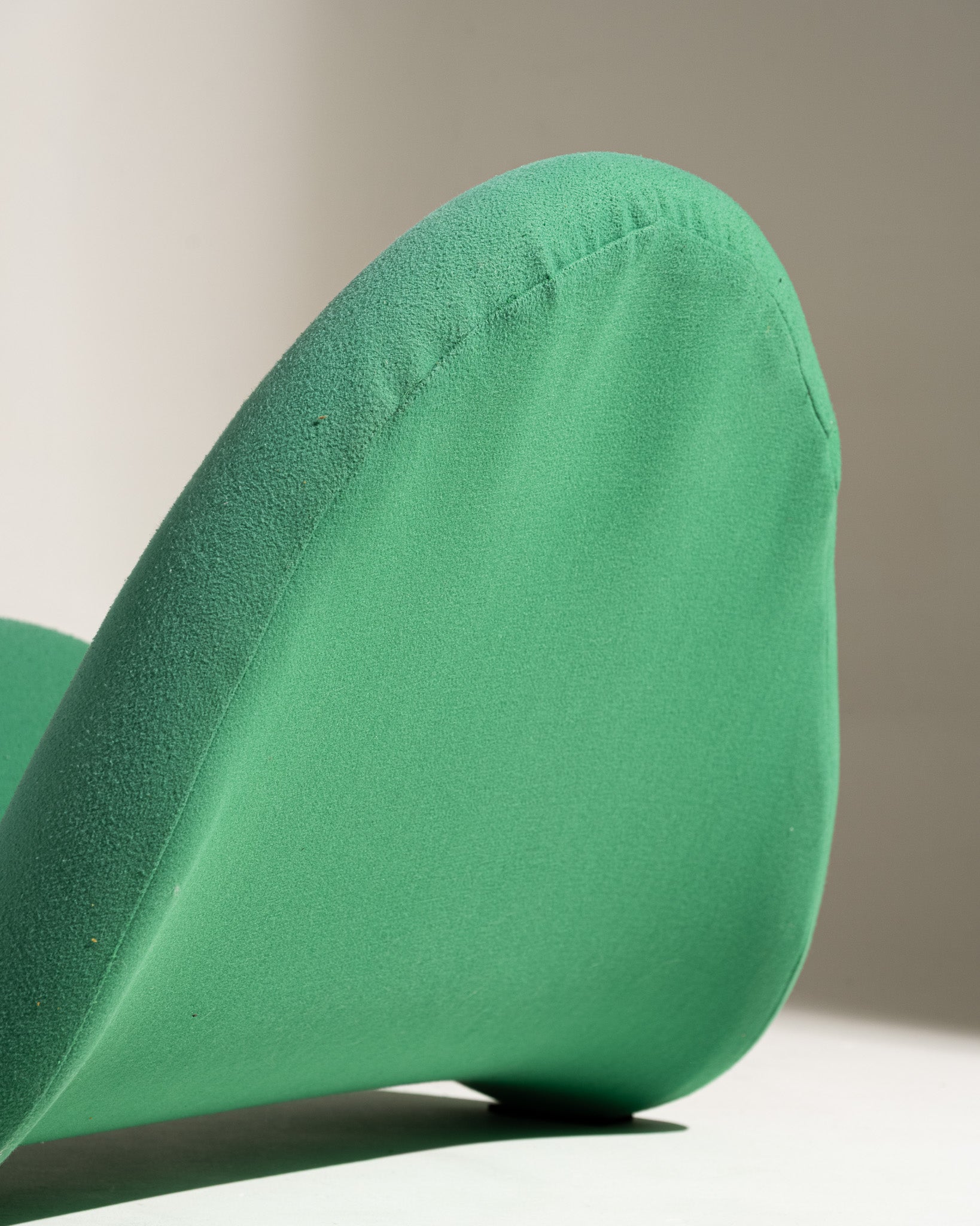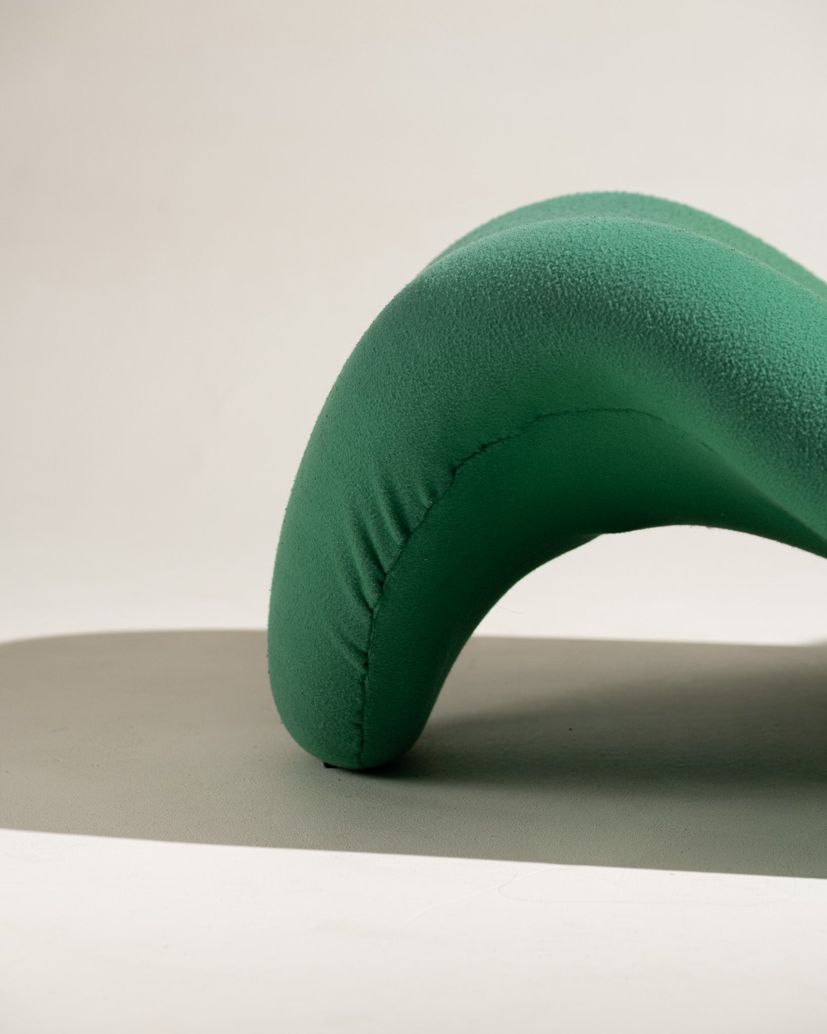 Chauffeuse Tong par Pierre Paulin pour Artifort en 1960. Assise basse en mousse moulée monobloc et revêtement en textile vert. Forme organique continue, sans structure apparente.