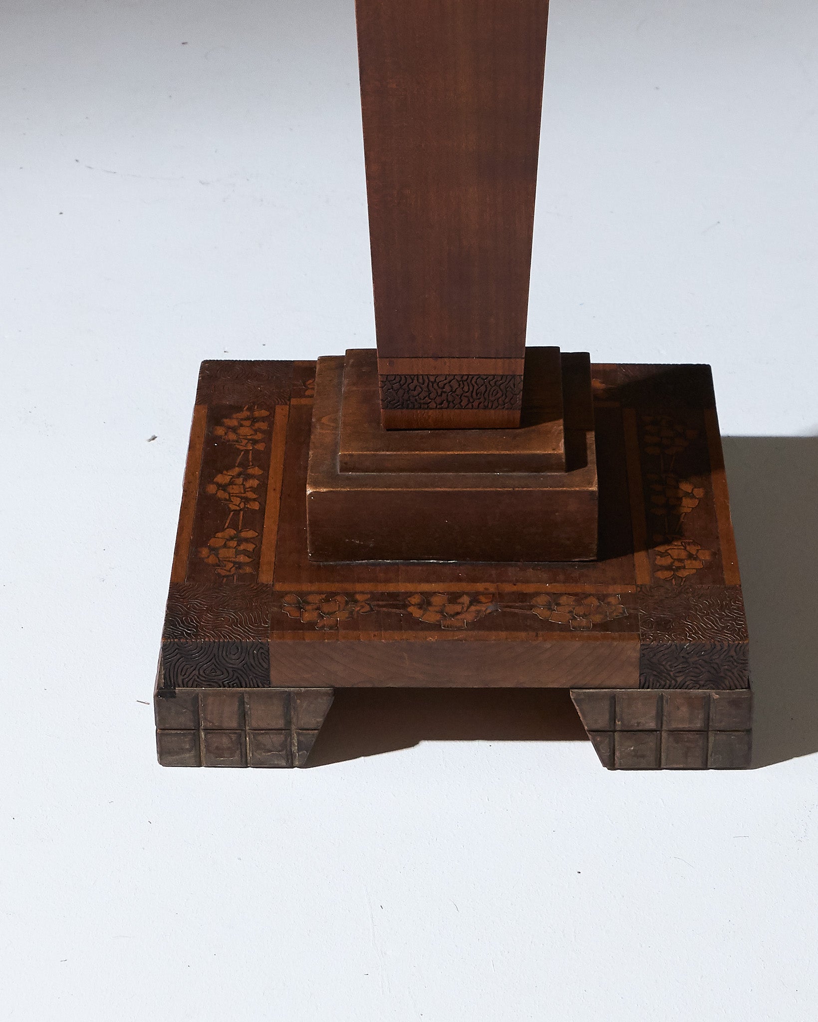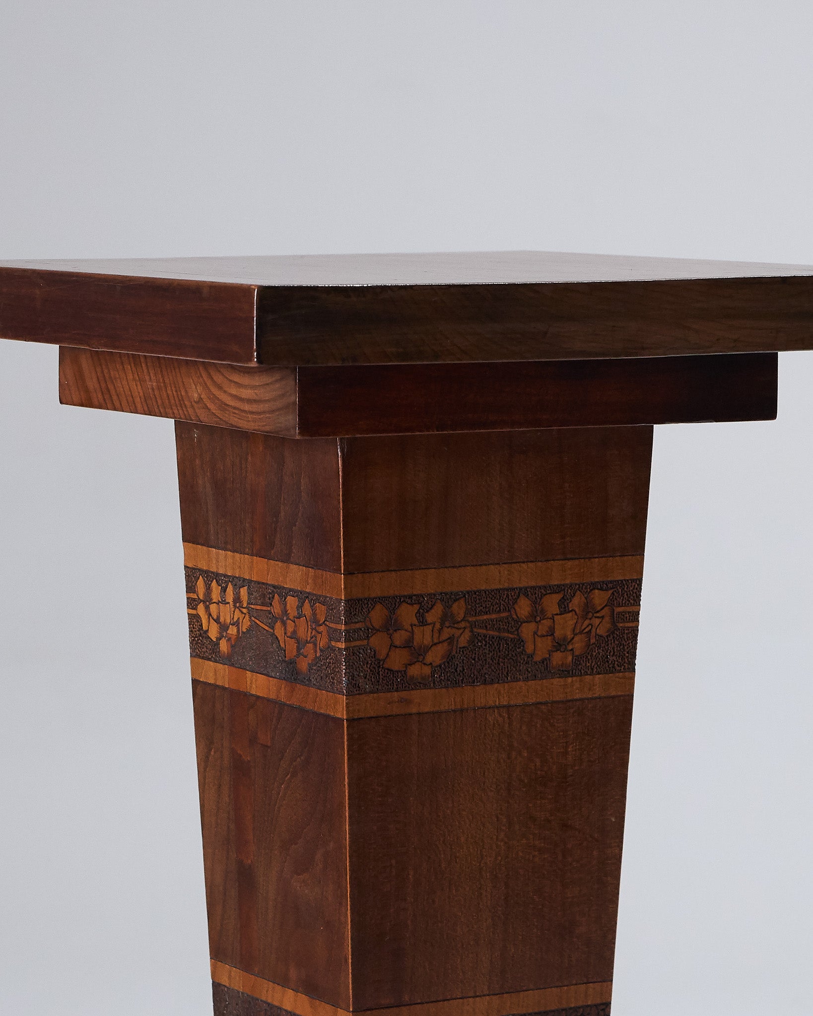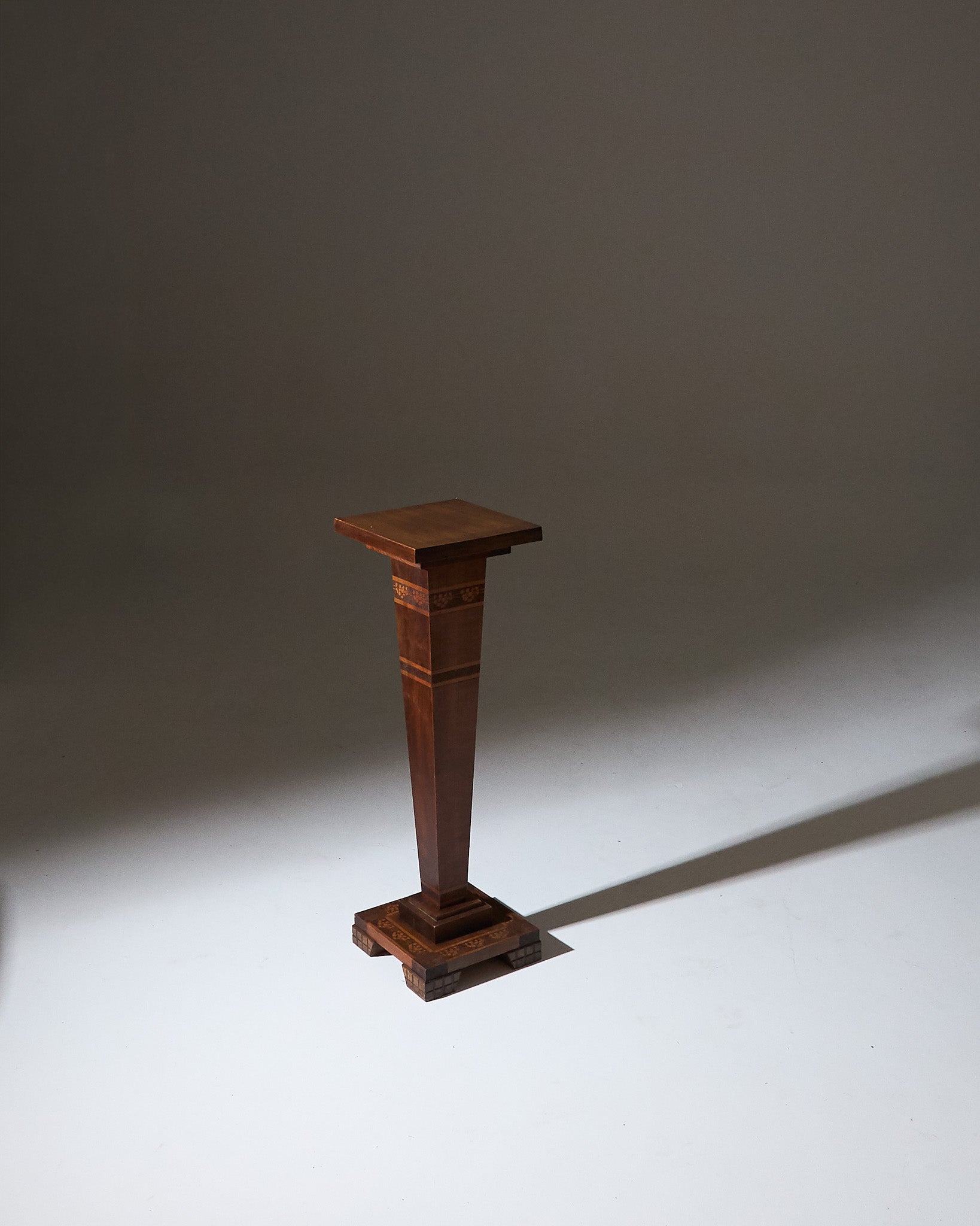 Colonne en bois massif reposant sur une base carrée à ressauts. Fût de section carrée, légèrement galbé, orné d'un travail de marqueterie géométrique sur le fût. et la base. Présence d'une frise gravée dans le bois en partie haute du fût. Plateau supérieur carré mouluré. Travail Art Déco des années 1930.