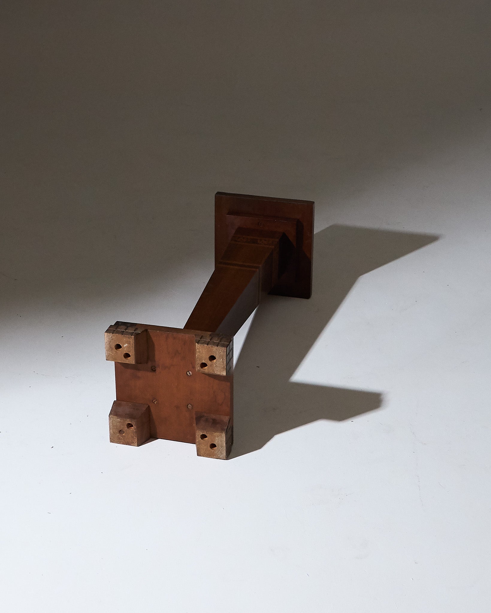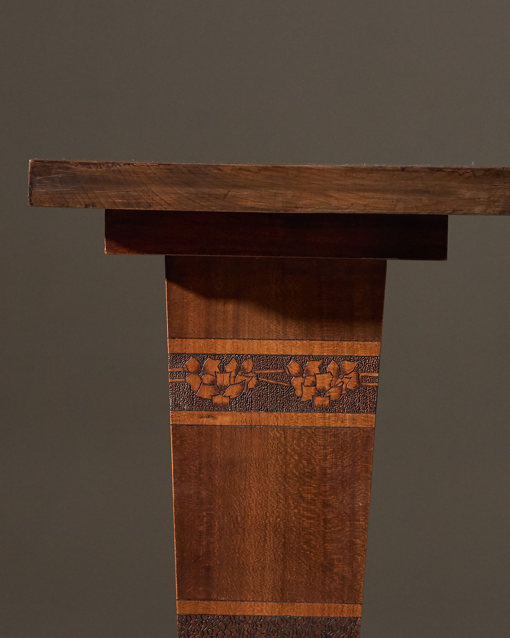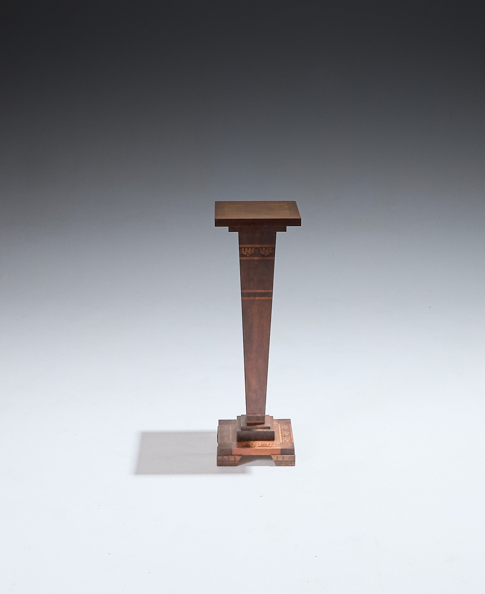 Colonne en bois massif reposant sur une base carrée à ressauts. Fût de section carrée, légèrement galbé, orné d'un travail de marqueterie géométrique sur le fût. et la base. Présence d'une frise gravée dans le bois en partie haute du fût. Plateau supérieur carré mouluré. Travail Art Déco des années 1930.