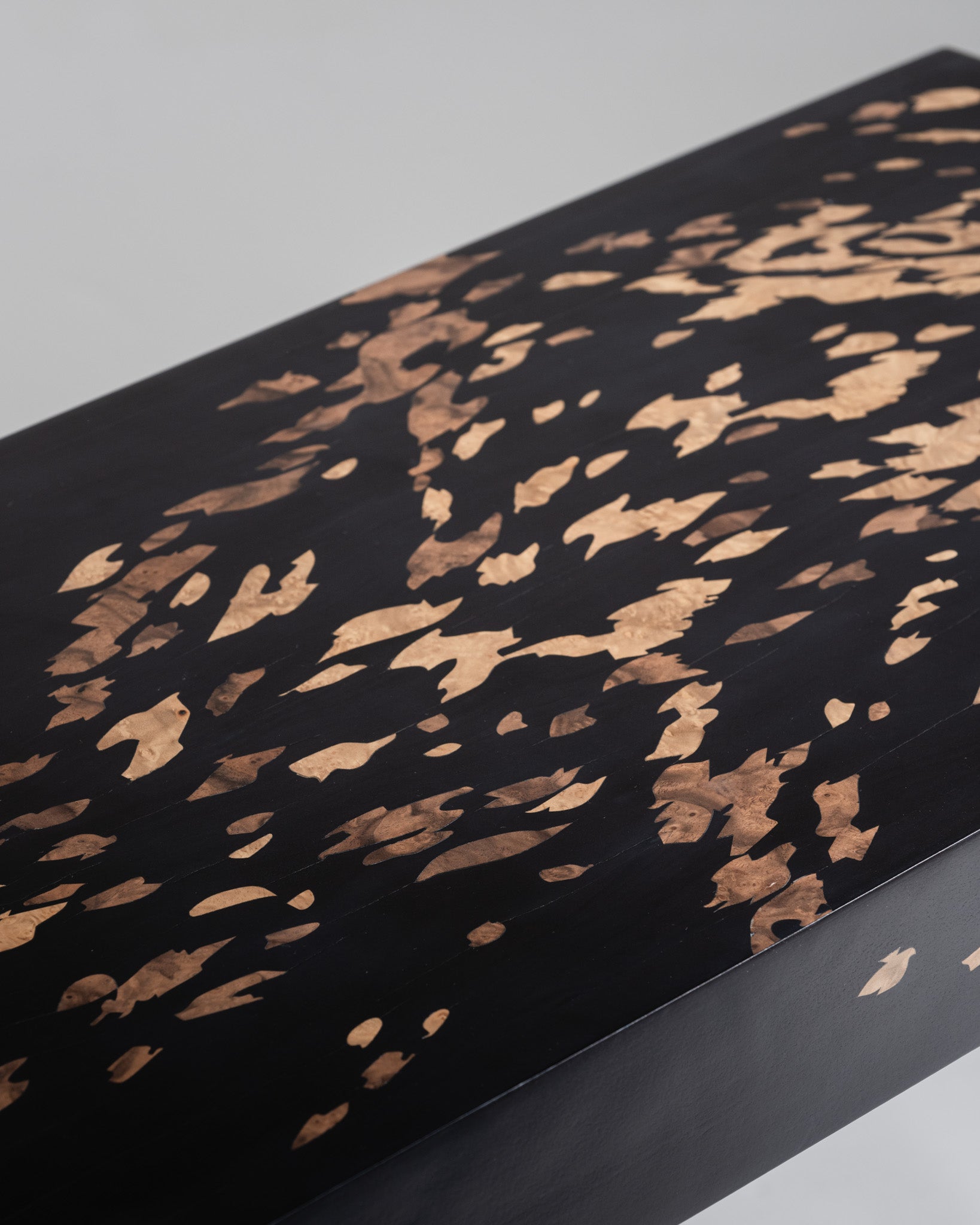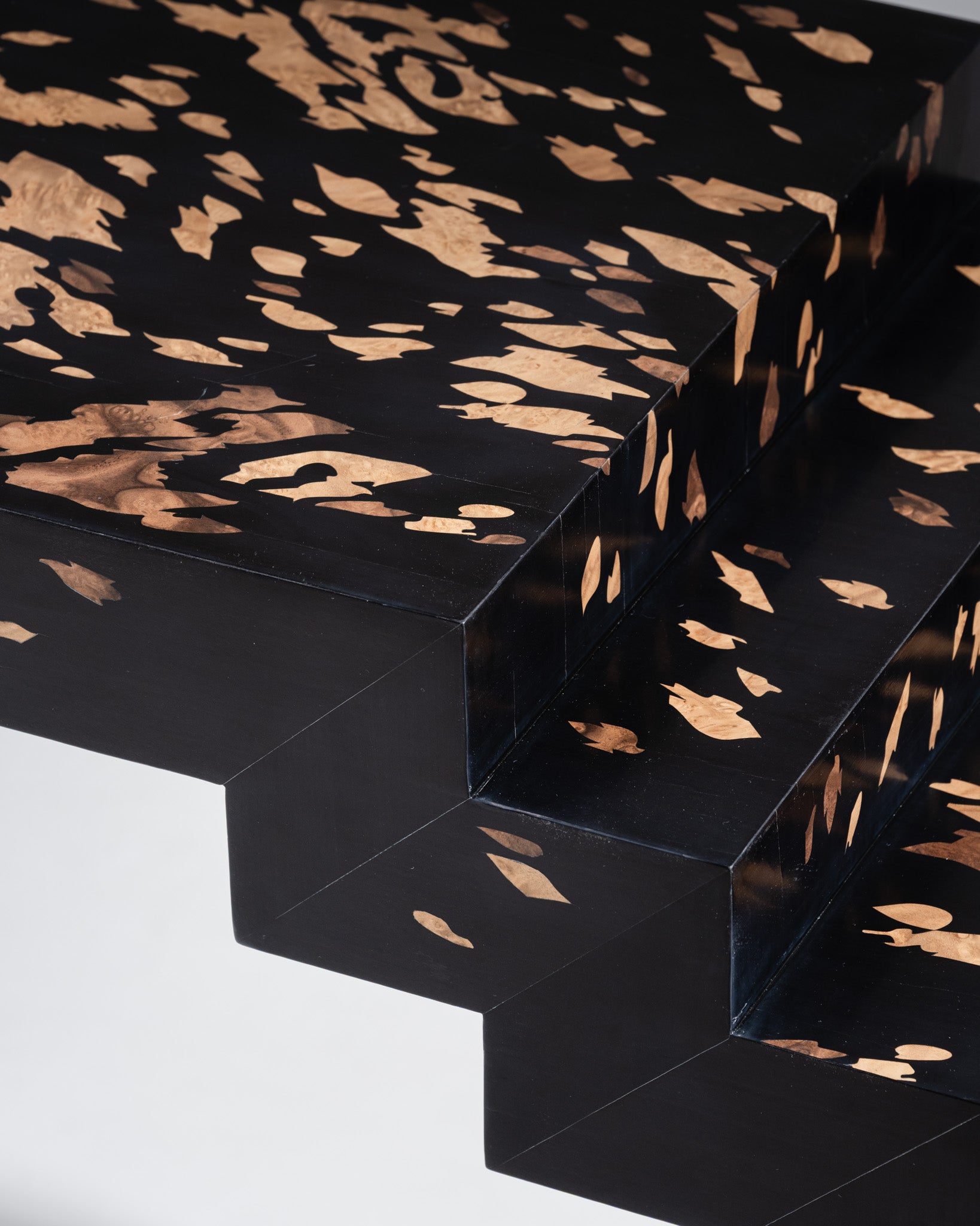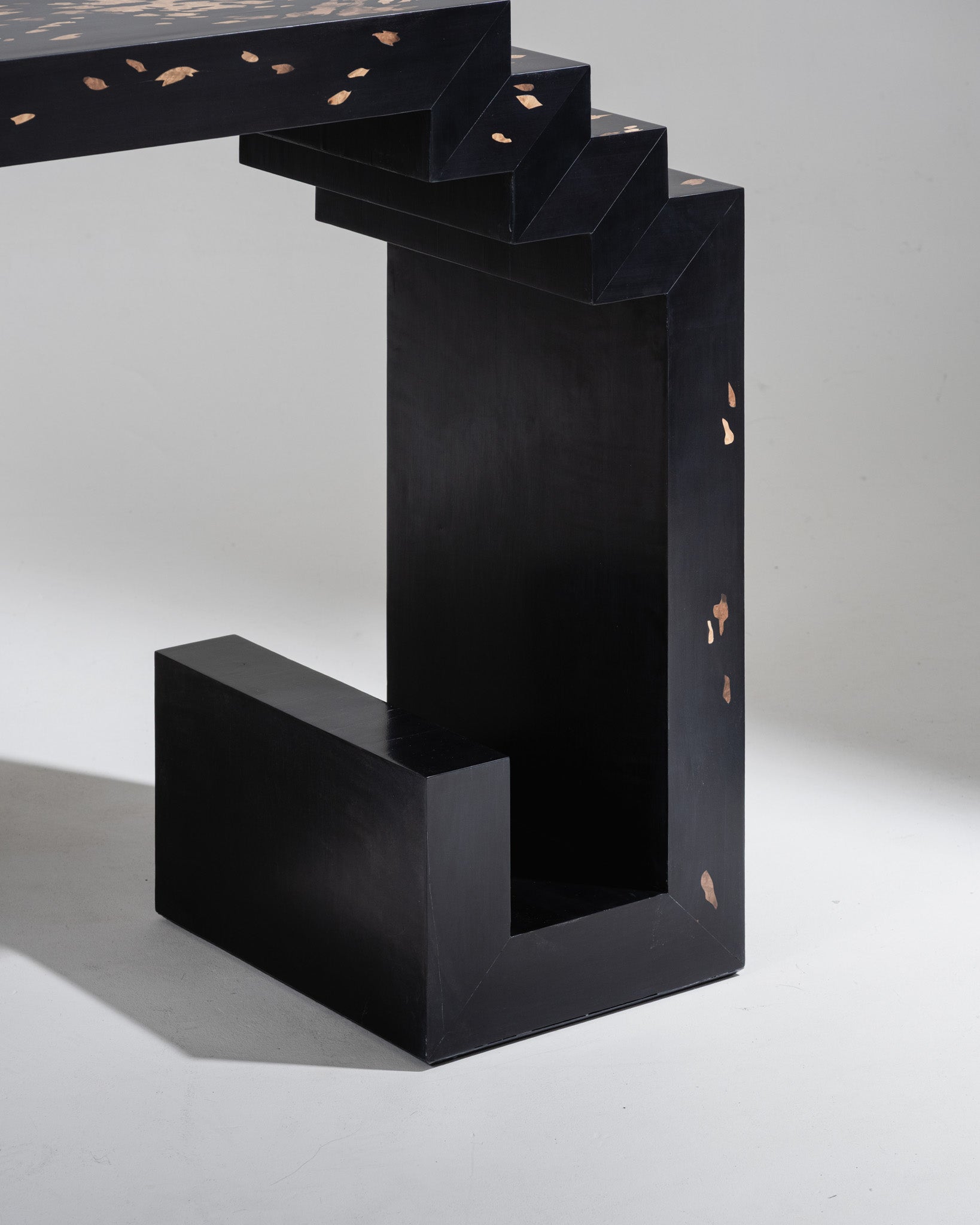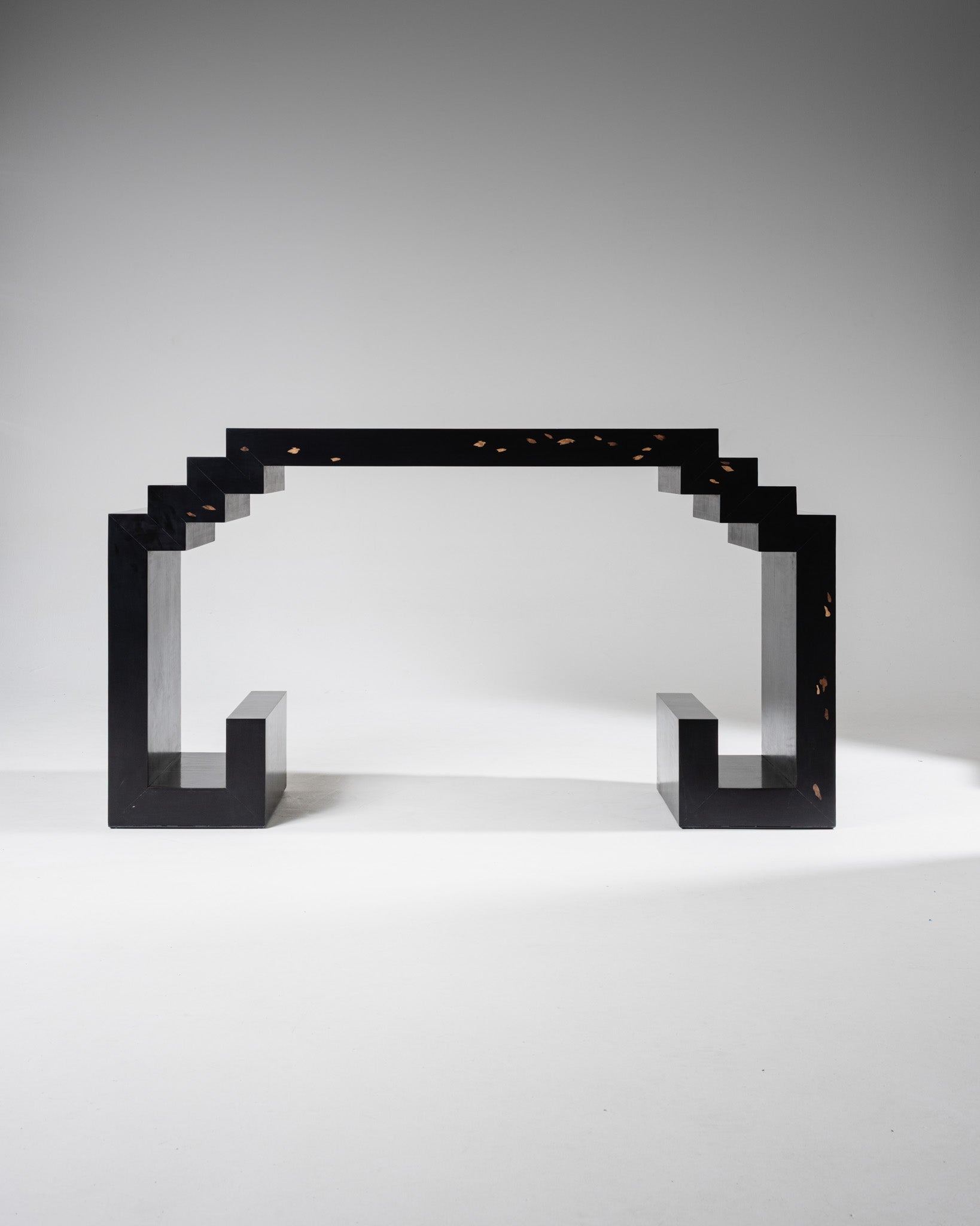 Console Mont réalisée par le Studio Karen B. Sa silhouette géométrique en gradins s’inspire de l’architecture monumentale et révèle un traitement sculptural du mobilier. La pièce est travaillée dans une finition sombre ponctuée d’éclats cuivrés, apportant profondeur et singularité à l’ensemble.