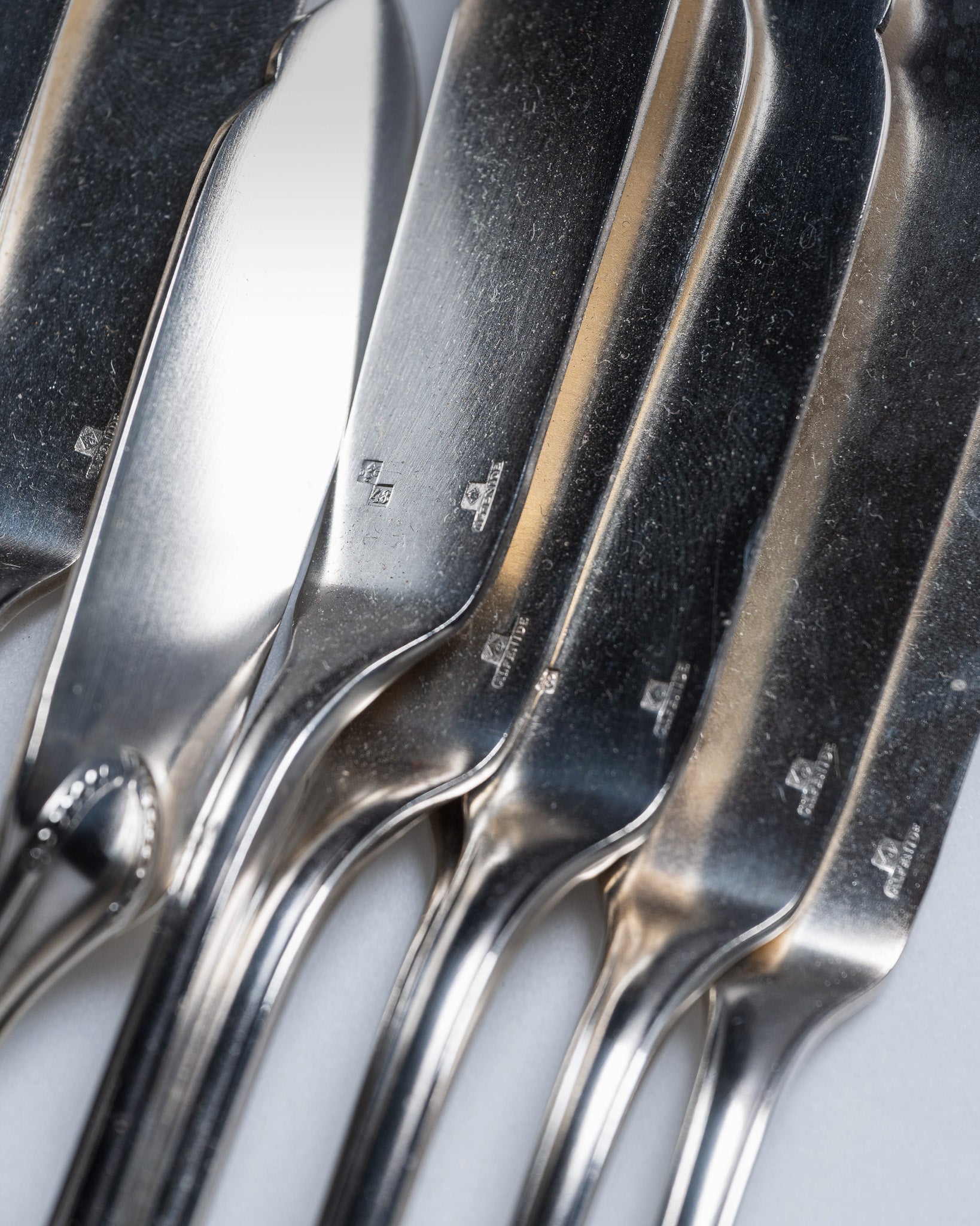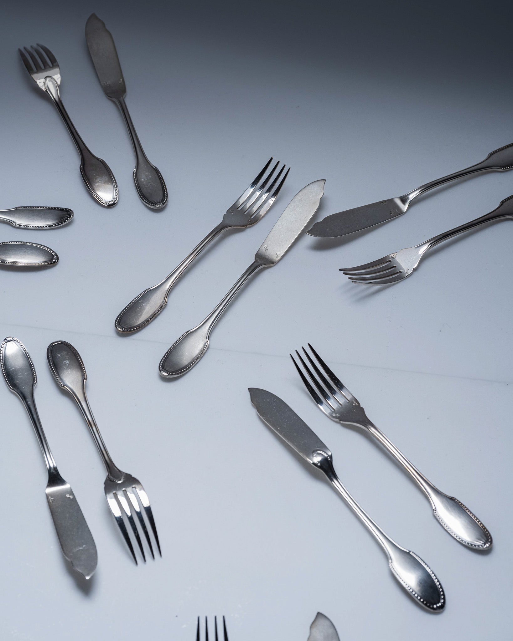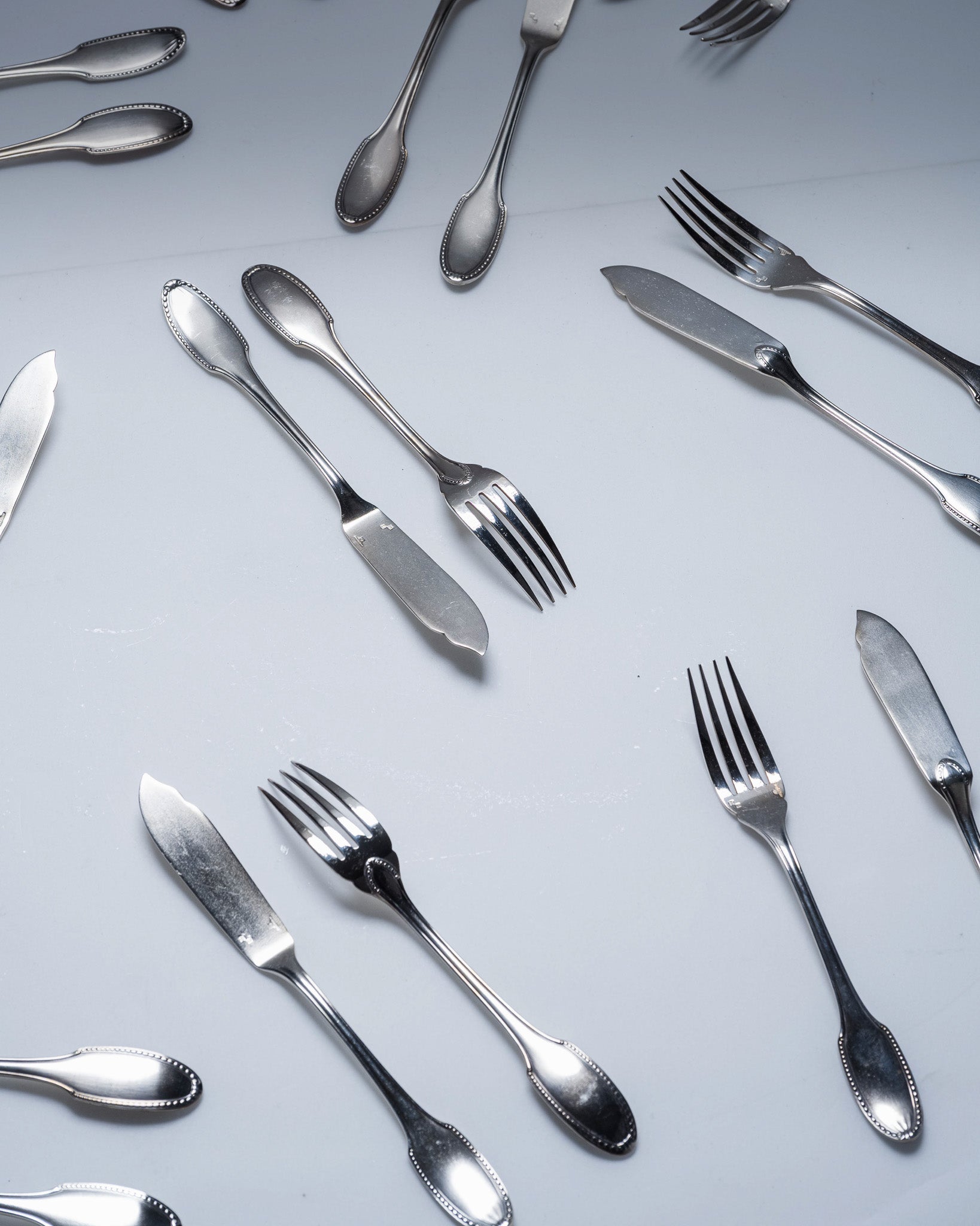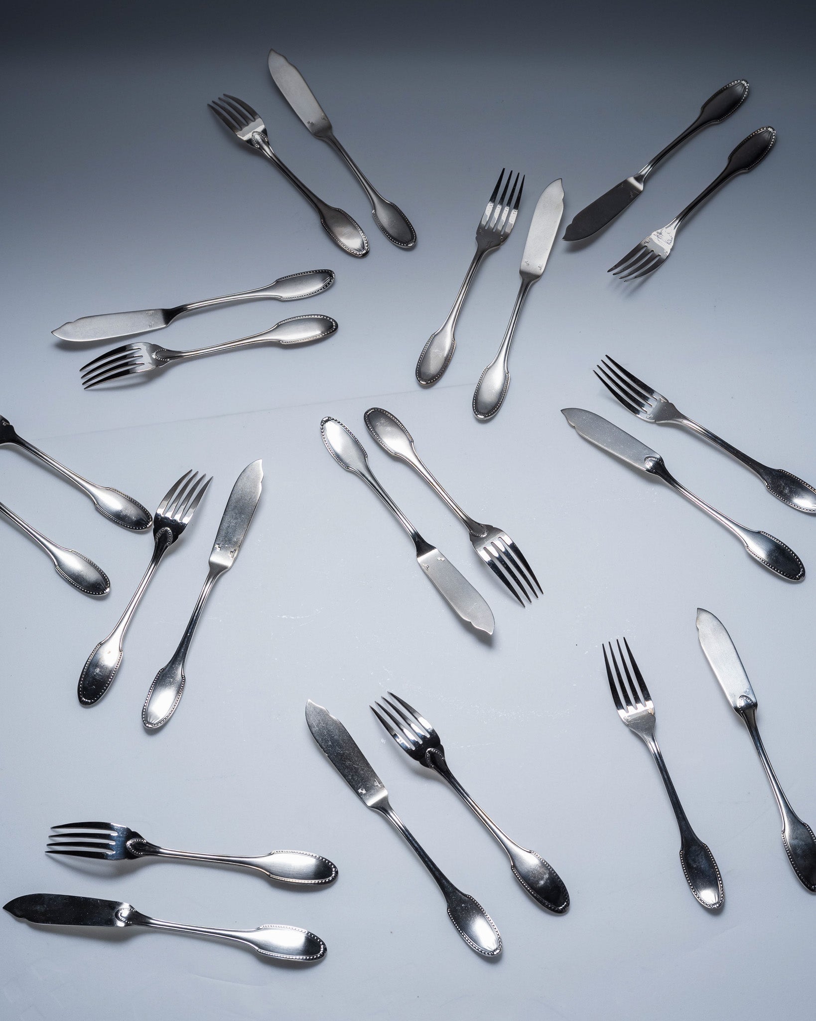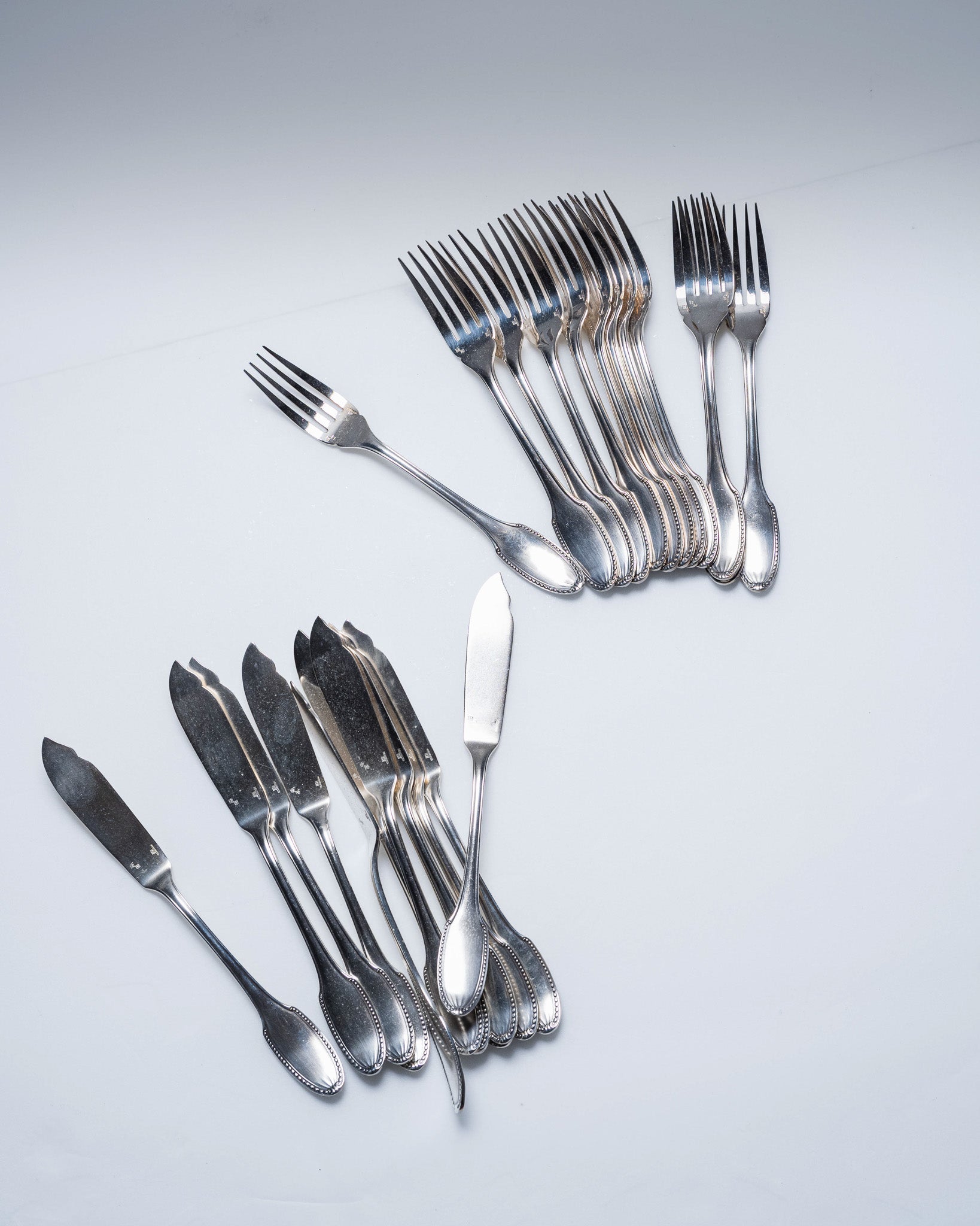 ENSEMBLE DE COUVERTS À POISSON EN MÉTAL ARGENTÉ COMPOSÉ DE DOUZE COUTEAUX ET DOUZE FOURCHETTES À DÉCORS DE PERLES. TRÈS BON ÉTAT GÉNÉRAL.