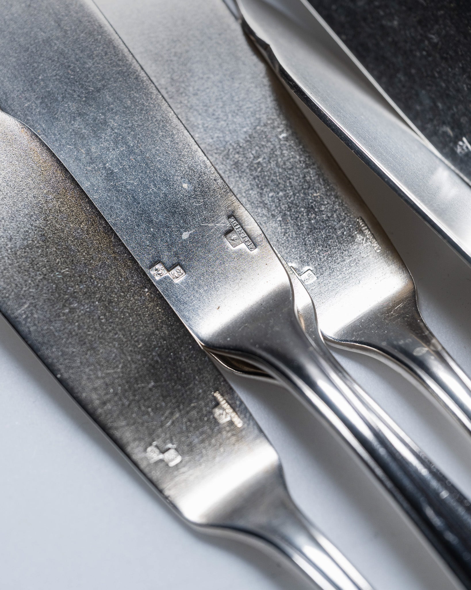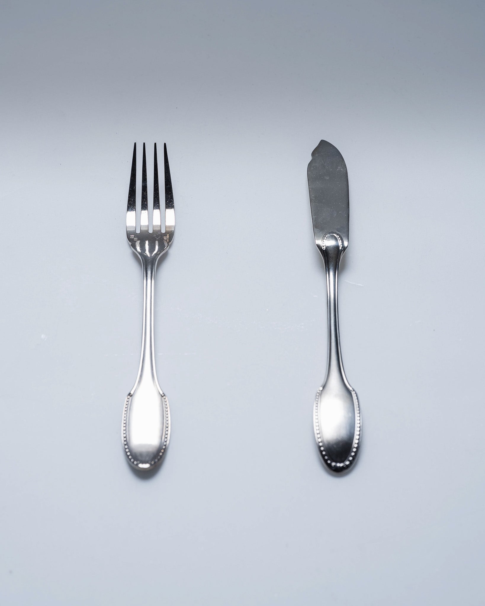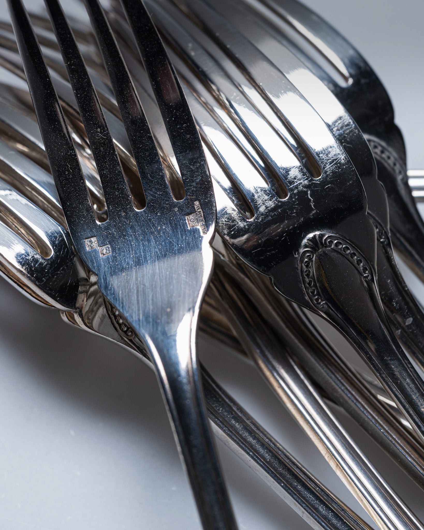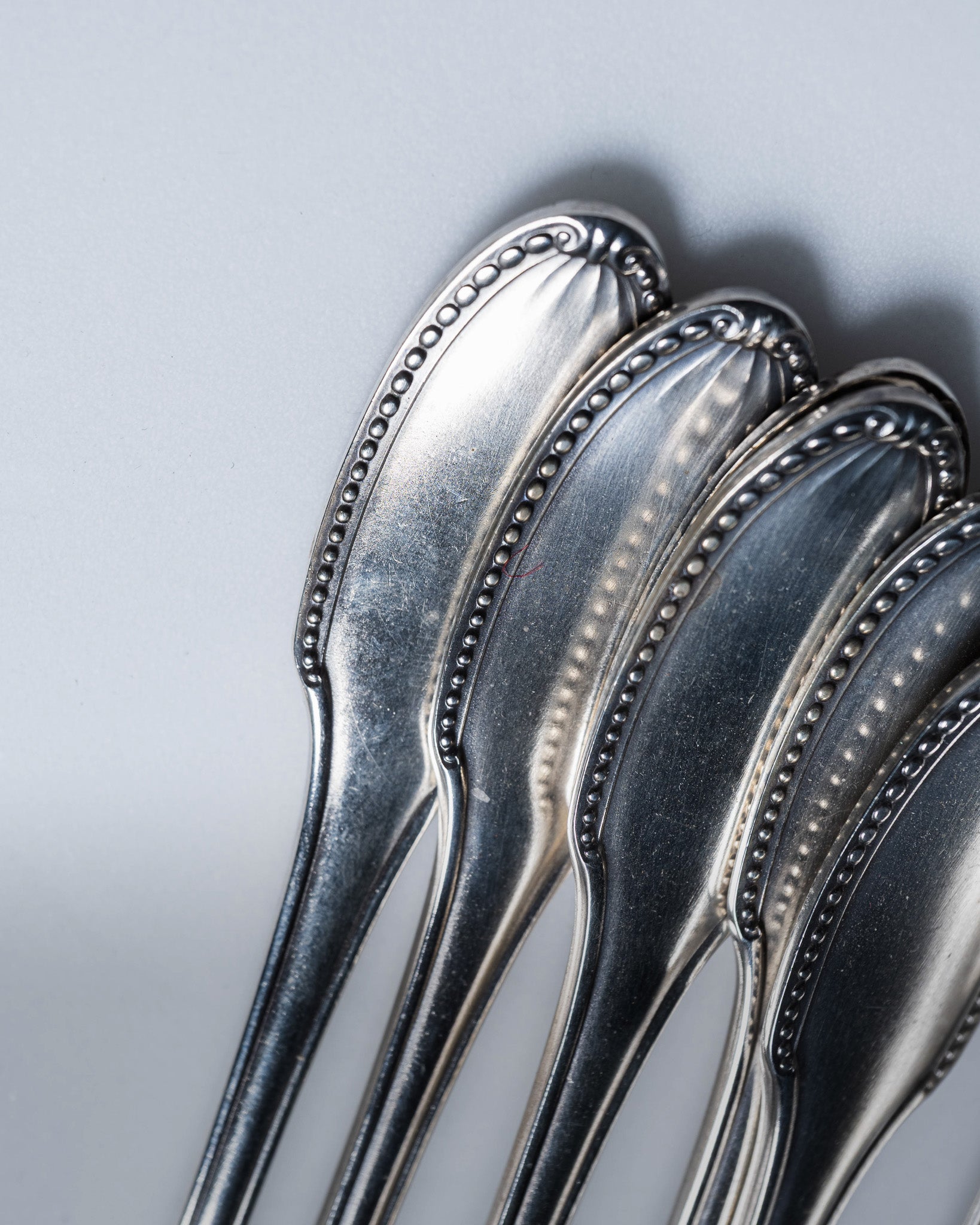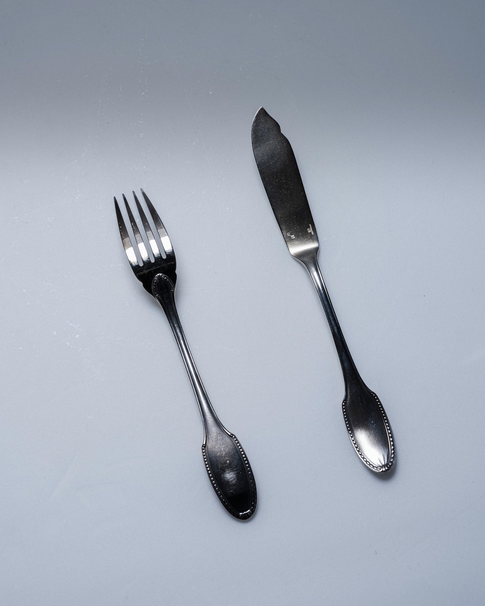 ENSEMBLE DE COUVERTS À POISSON EN MÉTAL ARGENTÉ COMPOSÉ DE DOUZE COUTEAUX ET DOUZE FOURCHETTES À DÉCORS DE PERLES. TRÈS BON ÉTAT GÉNÉRAL.