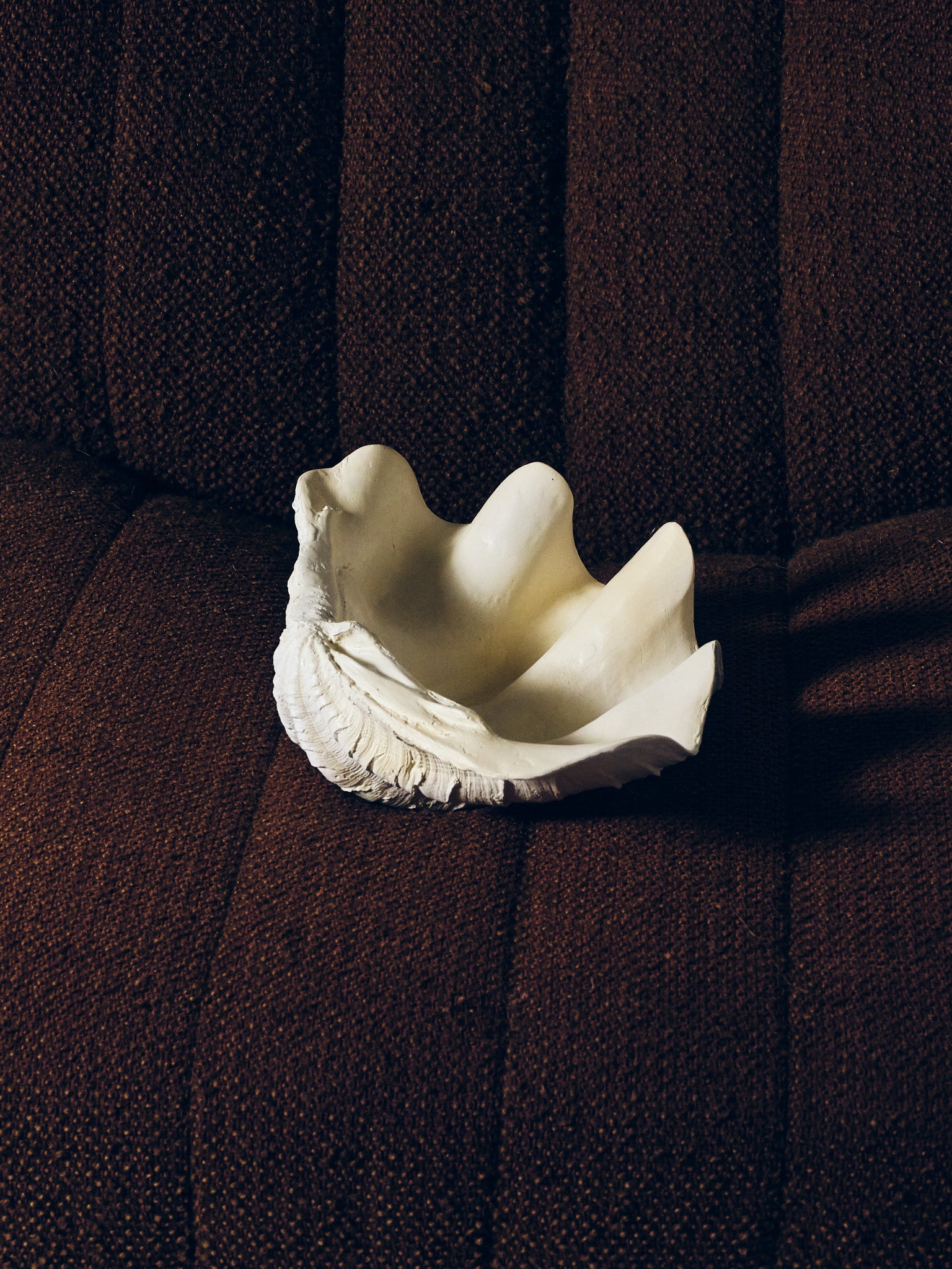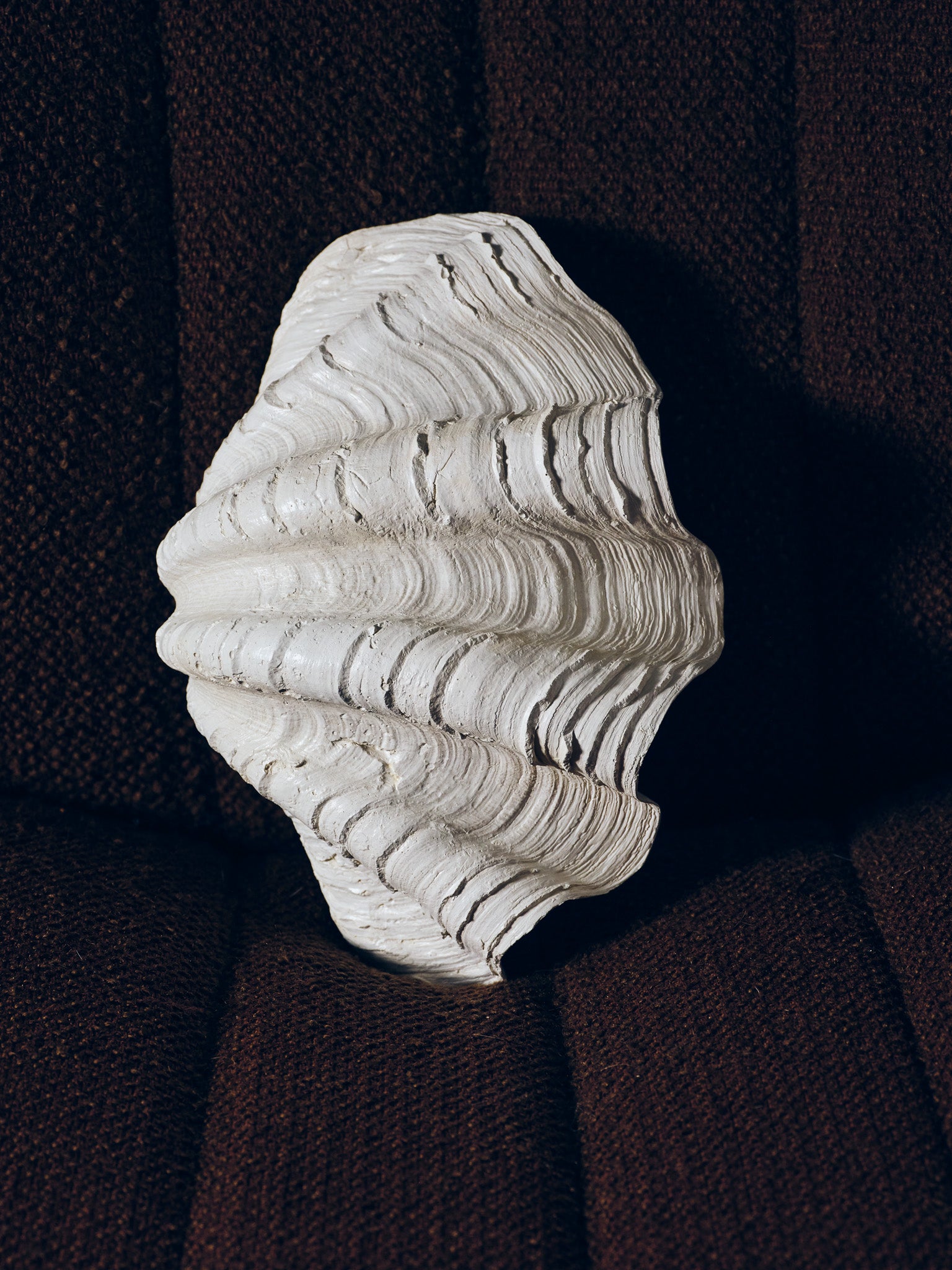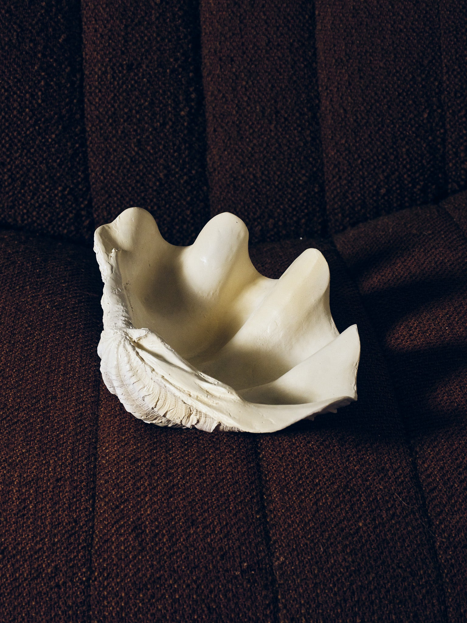 Coupe sculpturale "Clam Shell" réalisée par Médecine Studio, inspirée de la forme organique des coquillages géants. Pièce texturée en plâtre céramique, aux courbes ondulées, parfaite en centre de table, vide-poche ou objet décoratif.