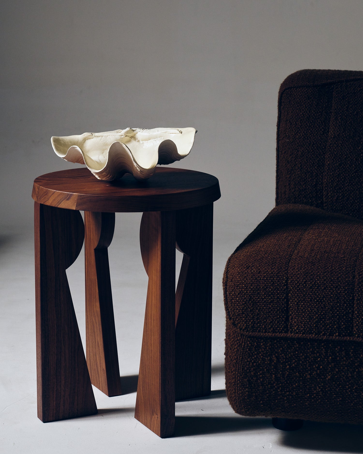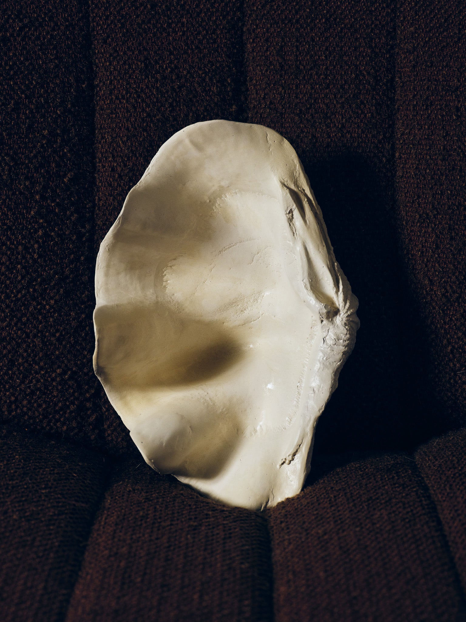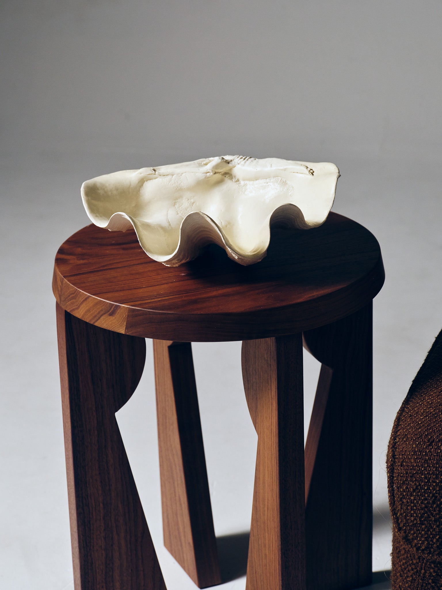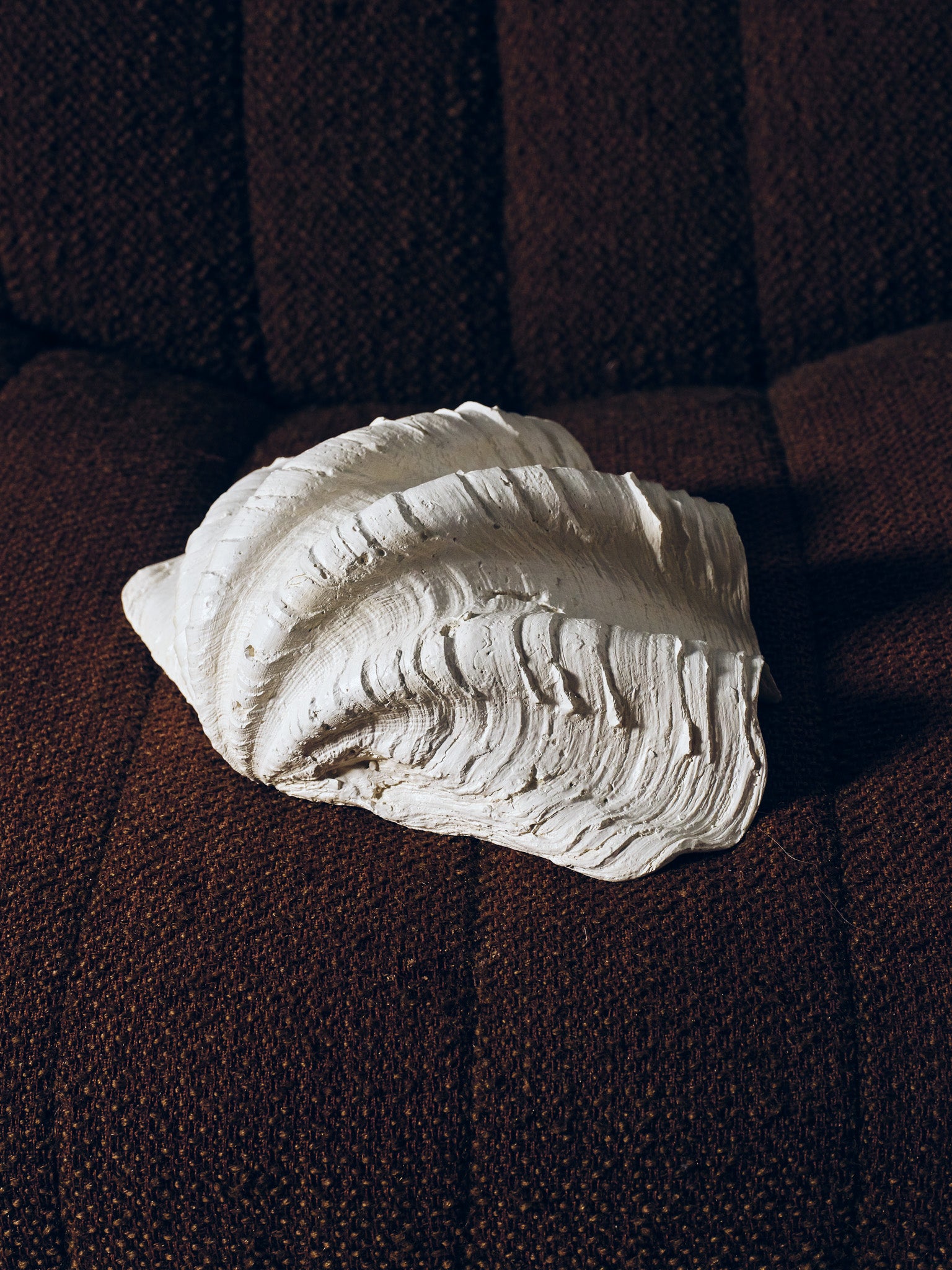 Coupe sculpturale "Clam Shell" réalisée par Médecine Studio, inspirée de la forme organique des coquillages géants. Pièce texturée en plâtre céramique, aux courbes ondulées, parfaite en centre de table, vide-poche ou objet décoratif.