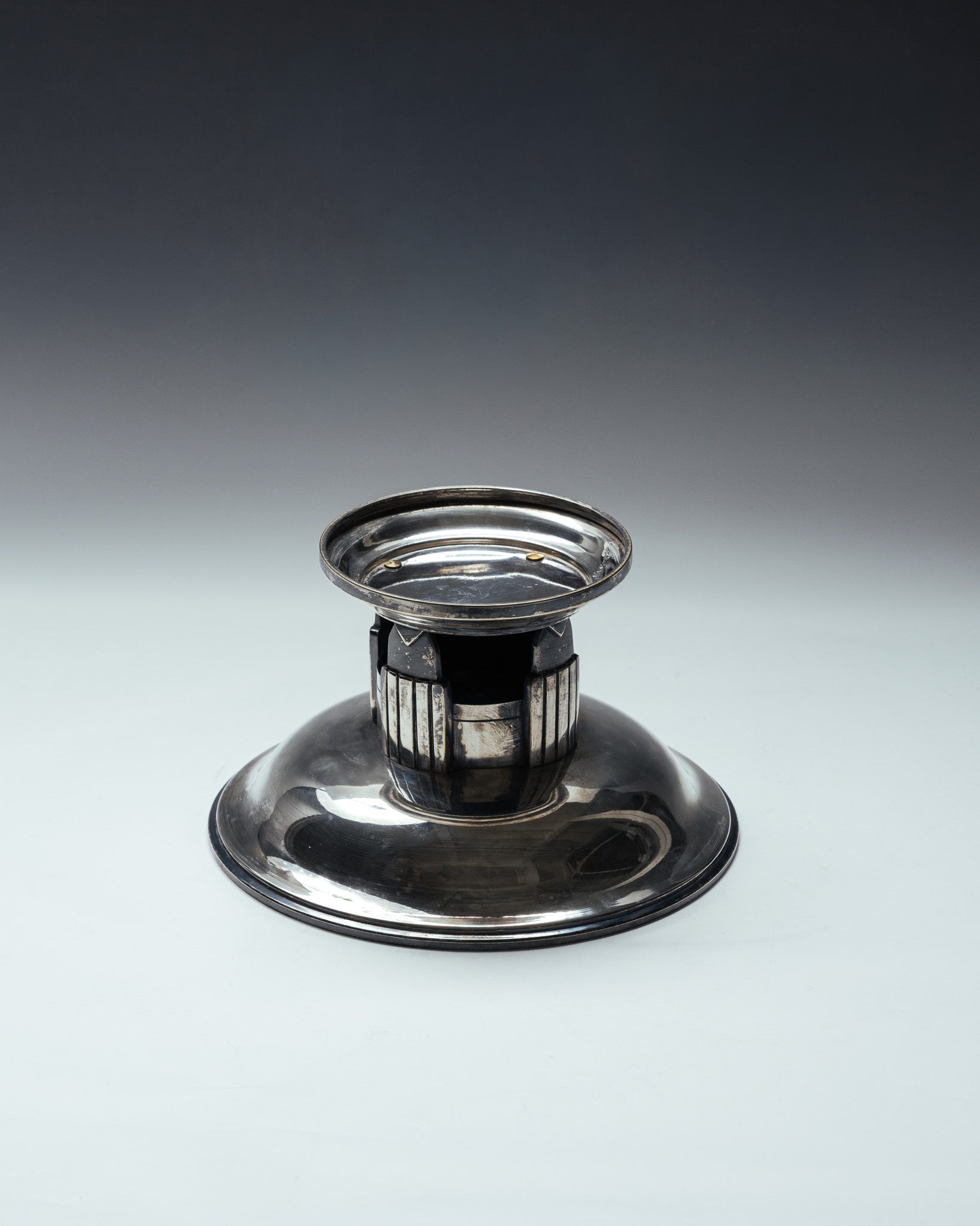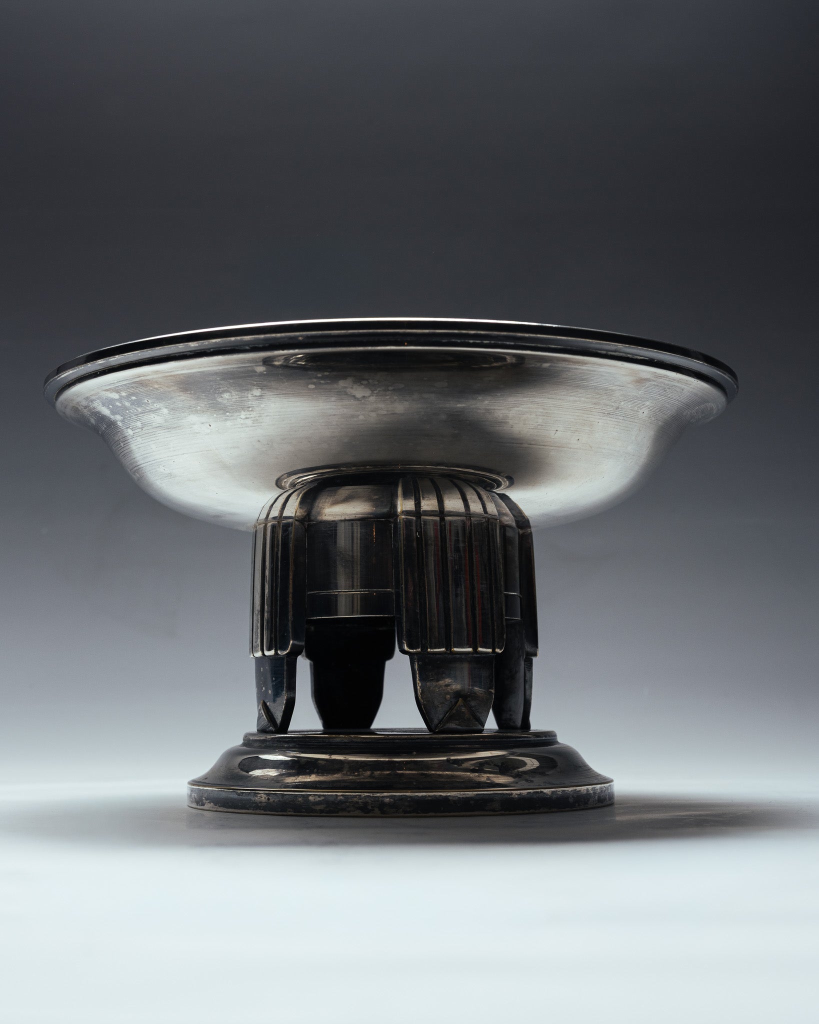 Coupe circulaire en métal argenté, reposant sur un piédouche architectural composé d'un fût ajouré à colonnettes verticales. Dans l'esthétique Art Déco. Bel état général, légères marques et patine d'usage.