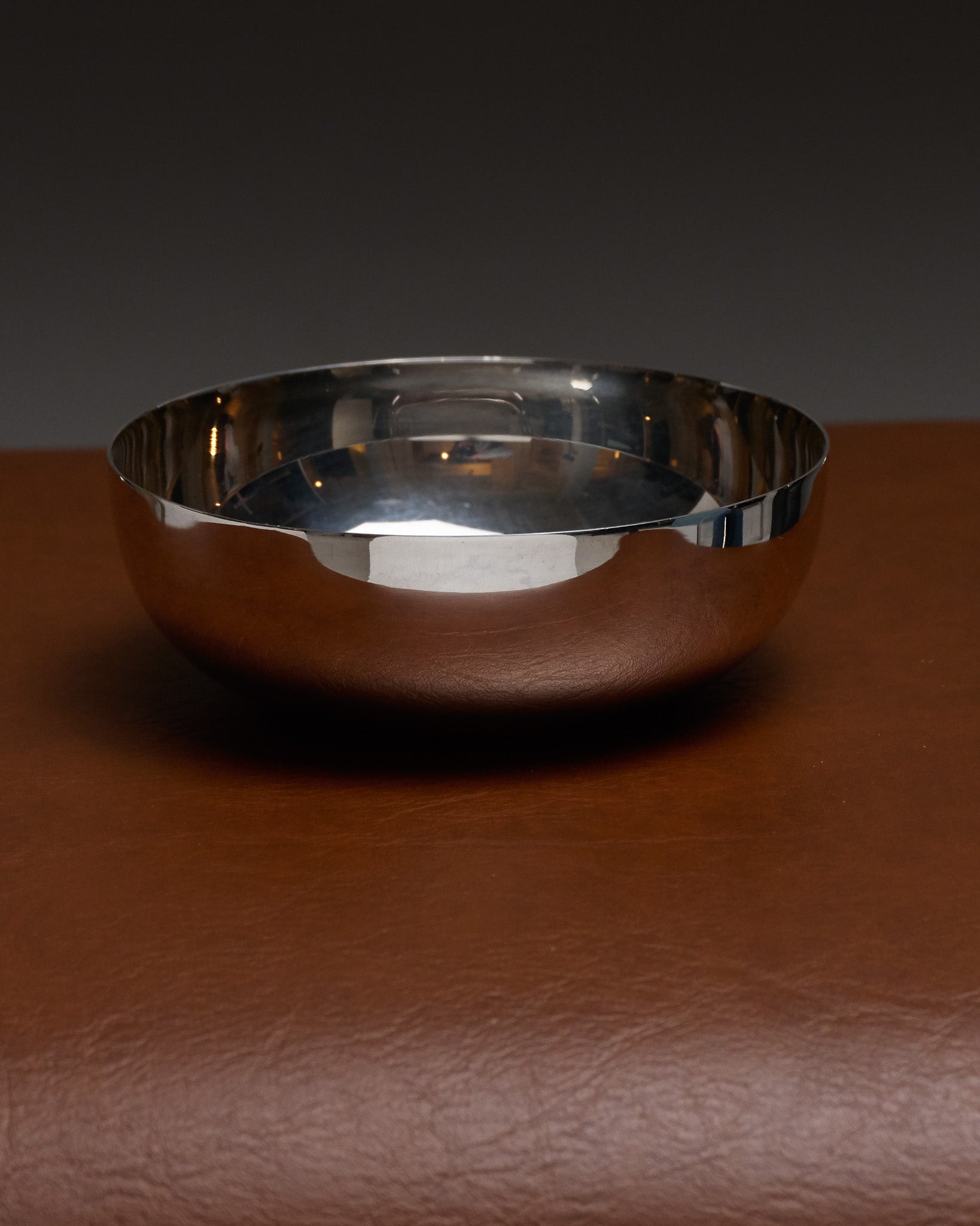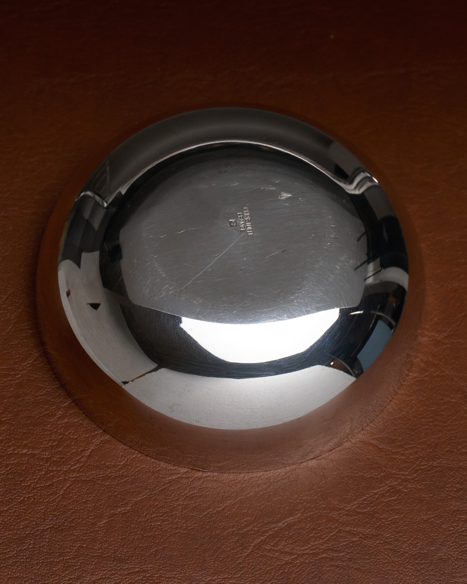 Coupelle apéritif ronde en métal argenté, signée Christofle. Surface lisse et polie, production typique de la maison dans les années 1970. Poinçonnée au-dessous, très bel état.