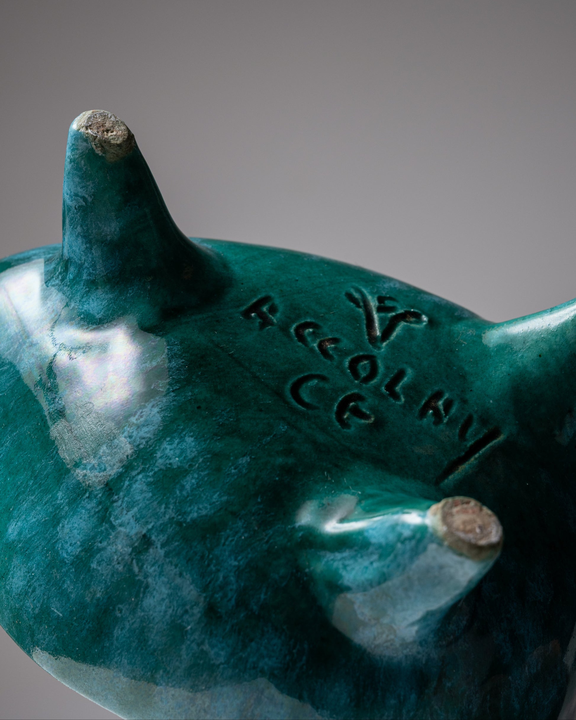 Coupelle zoomorphe en céramique émaillée vert-bleu, travail typique des Atelier d’Accolay dans les années 1950/1960. En très bon état.