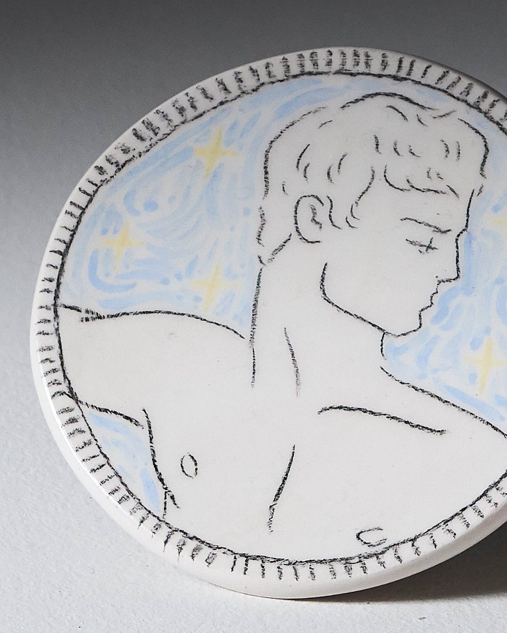 Dessous de verre en céramique émaillée blanche, à décor incisé représentant un profil masculin entouré de motifs d'étoiles stylisés blancs, bleus et jaunes, avec contour strié. Pièce unique, signée 'Eldarov. T' au revers.