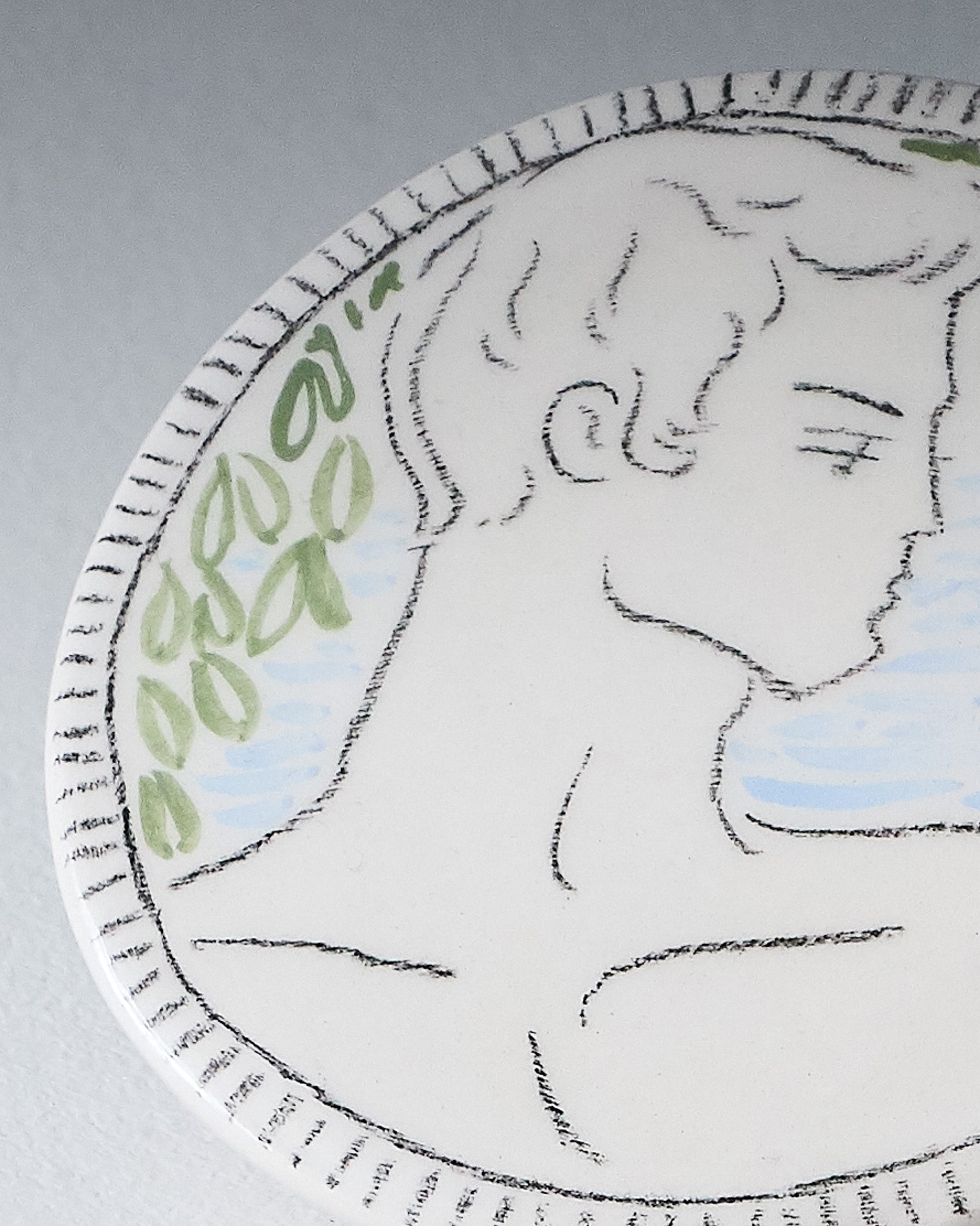 Dessous de verre en céramique émaillée blanc, à décor incisé représentant un profil masculin sur un fond bleu et feuillagé vert, avec contour strié noir. Pièce artisanale unique, signée 'Eldarov. T' au revers.