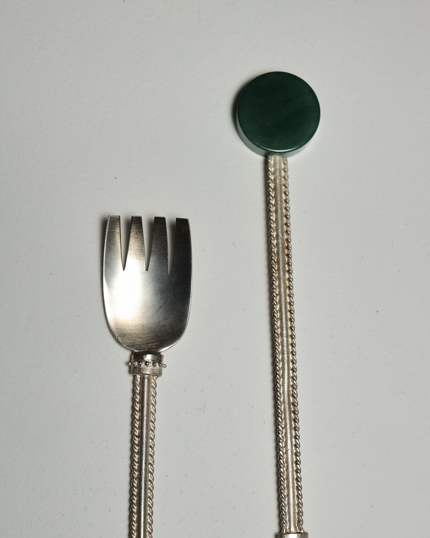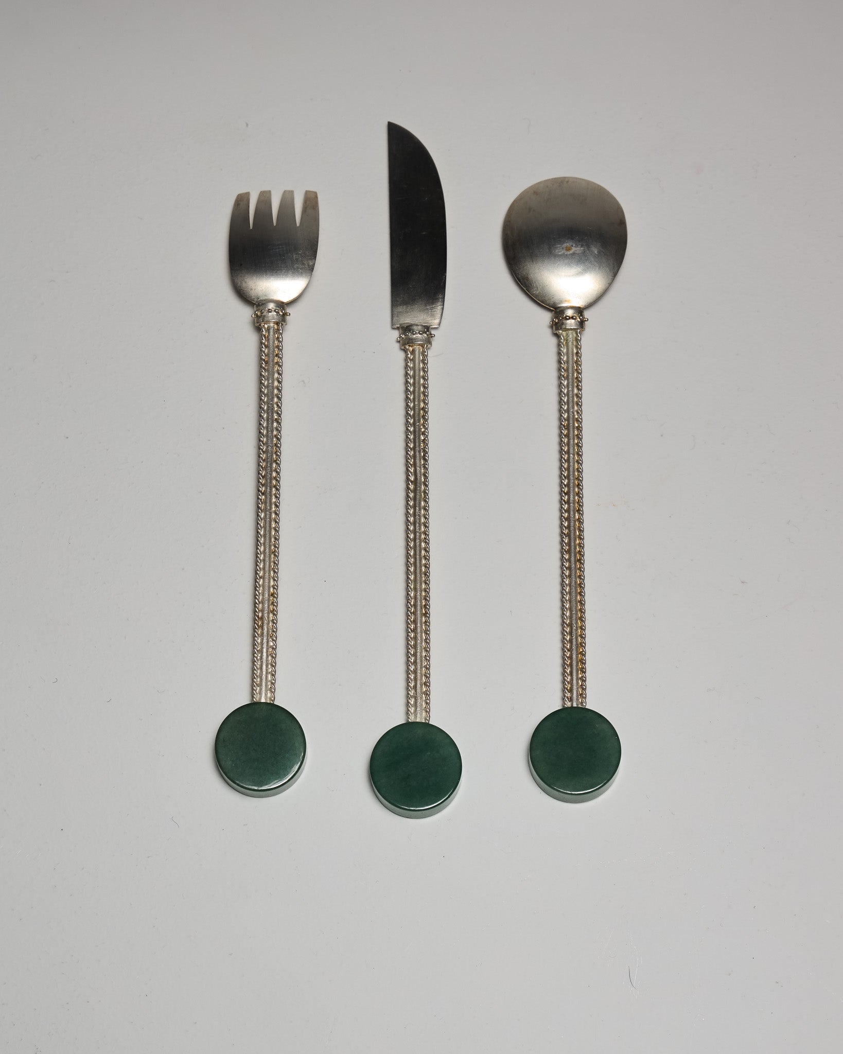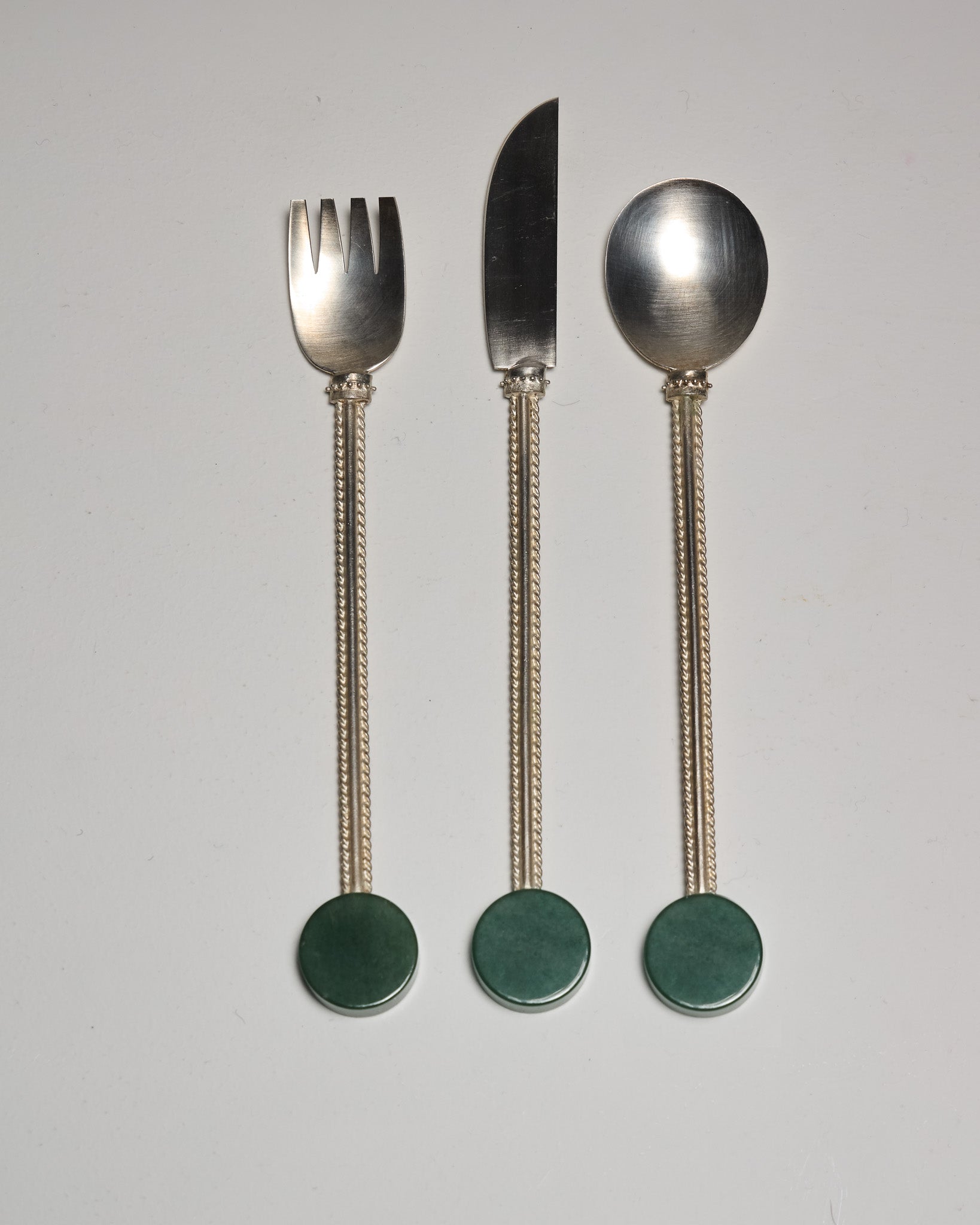"AMÉLIOREZ VOTRE EXPÉRIENCE CULINAIRE AVEC L'ENSEMBLE DE COUVERTS EN PIERRE DU STUDIO DE DESIGN MILANAIS NATALIA CRIADO. UNE FOURCHETTE, UNE CUILLÈRE ET UN COUTEAU – MÉTICULEUSEMENT FABRIQUÉS EN LAITON PLAQUÉ ORNÉS D'UN MANCHE SCULPTURAL EN PIERRE. FABRIQUÉE À LA MAIN PAR DES ARTISANS ITALIENS, LA PIERRE DISTINCTIVE AJOUTE UNE TOUCHE D'ÉLÉGANCE ART DÉCO INSPIRÉE DES BIJOUX À VOTRE VAISSELLE. LAVER AVEC DU SAVON DOUX ET DE L'EAU. UTILISEZ UN CHIFFON DOUX POUR SÉCHER."