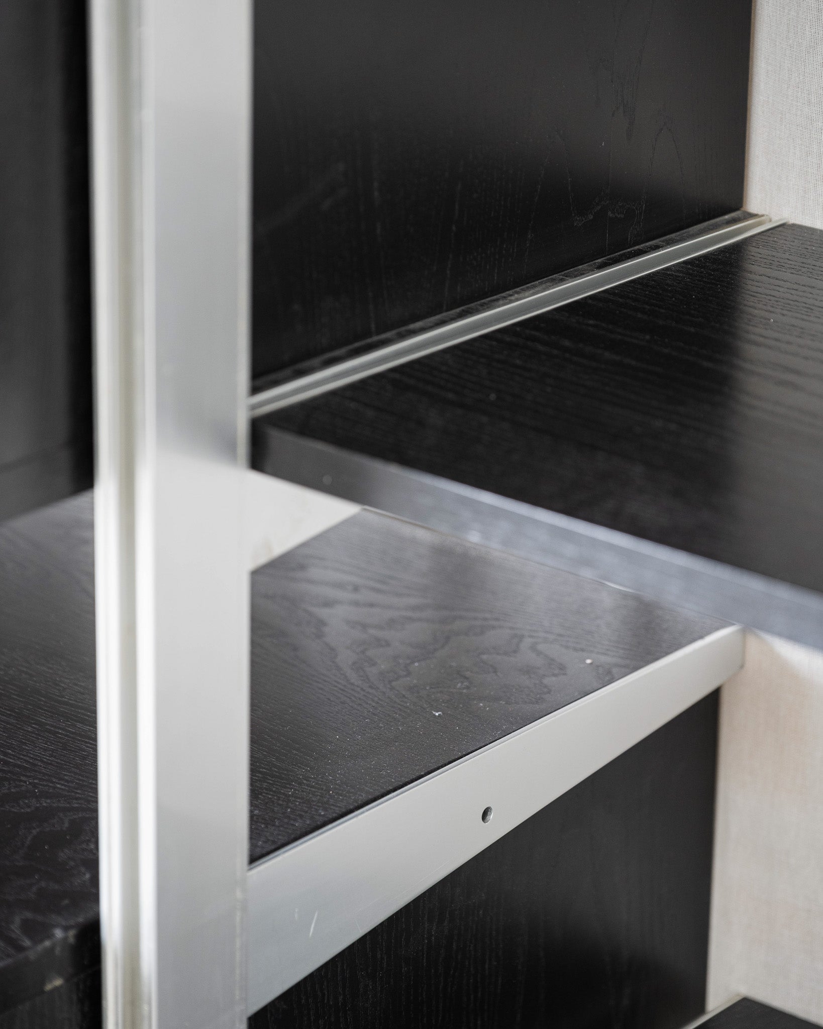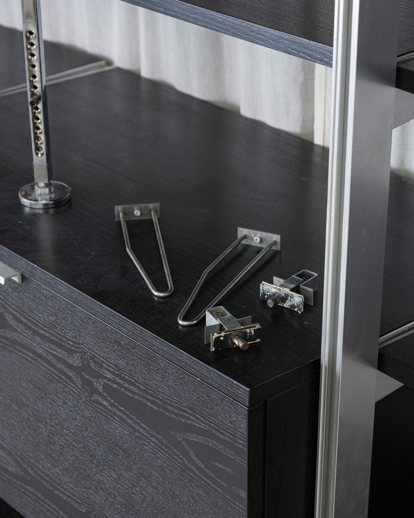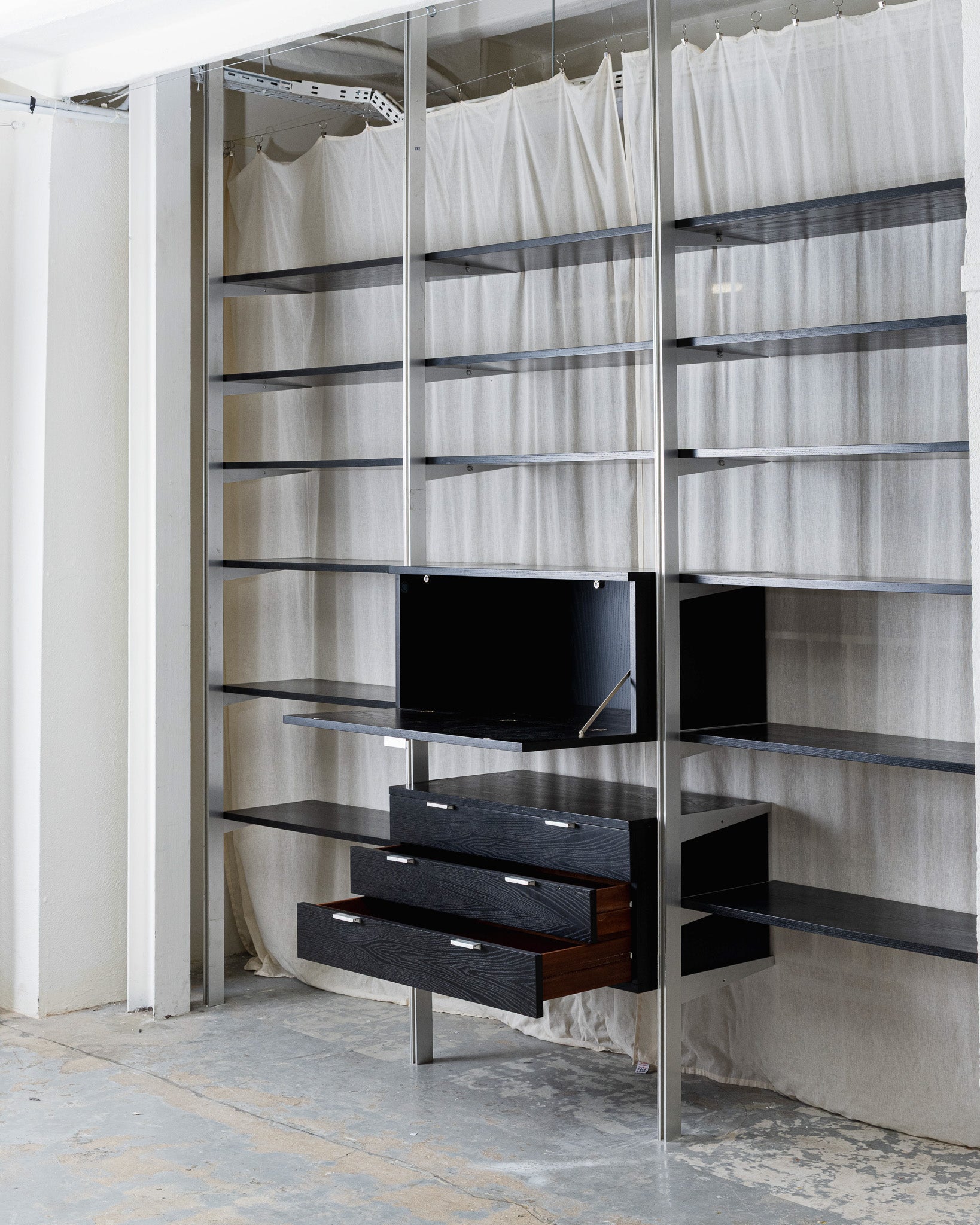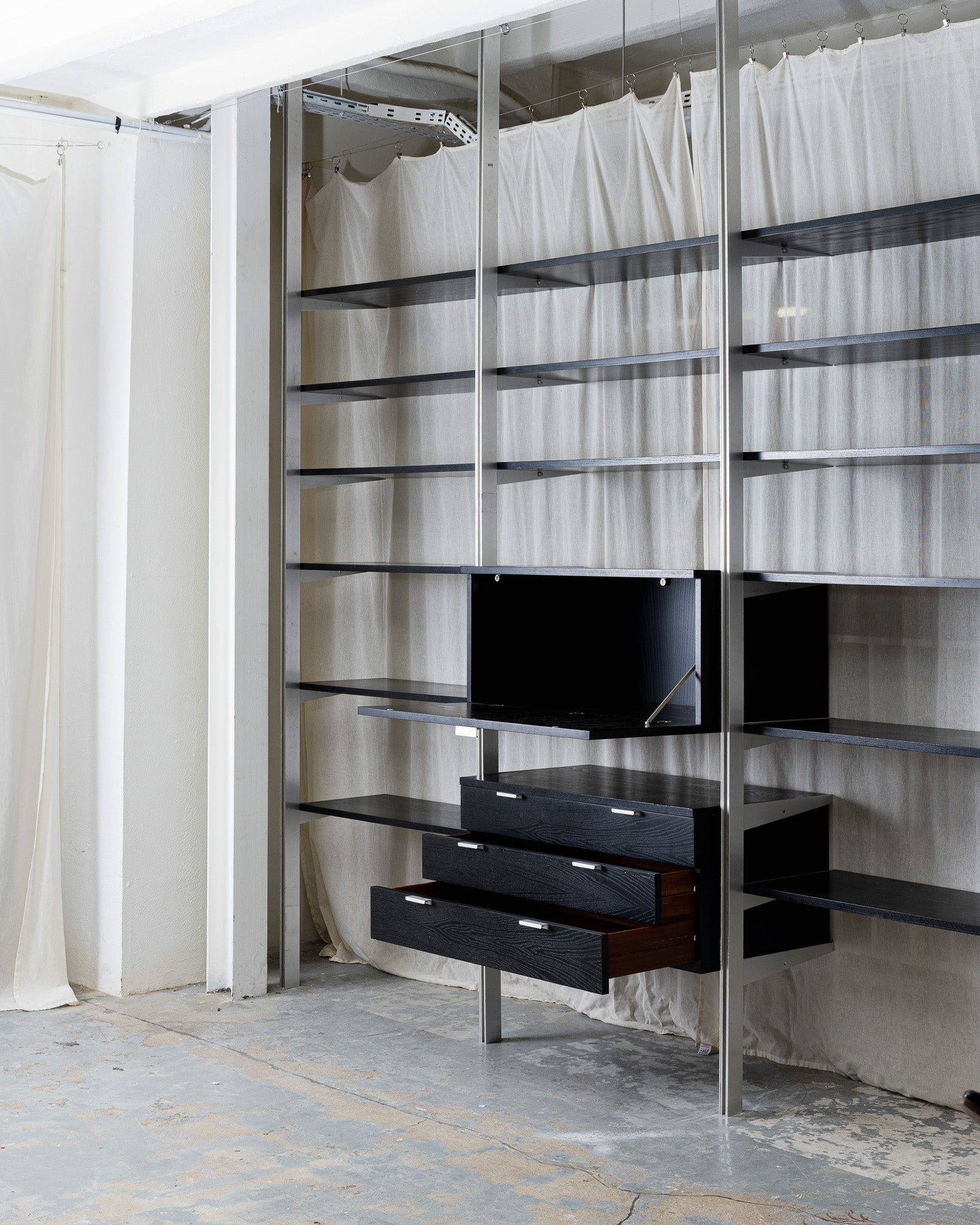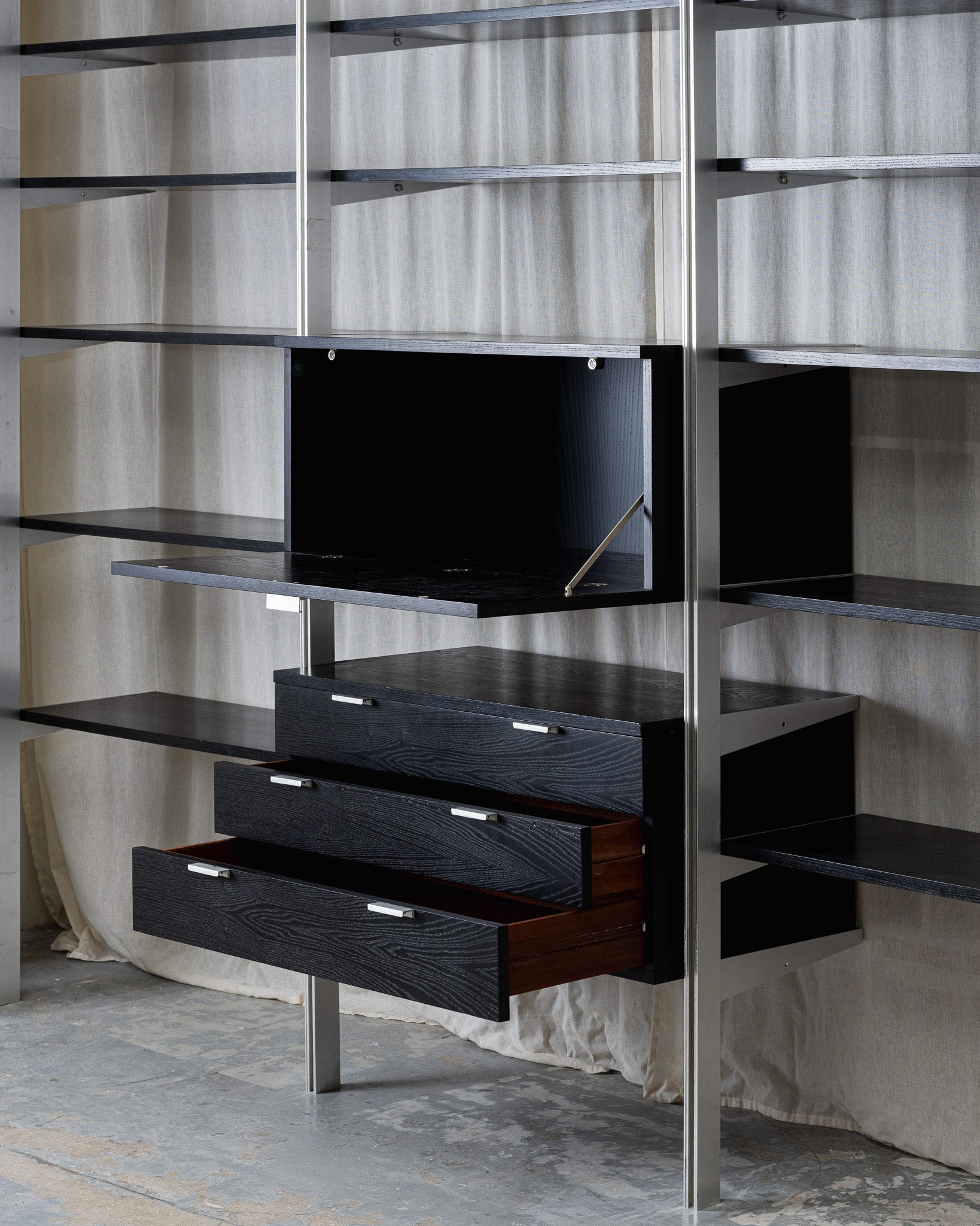 Grande étagère conçue par George Nelson pour Herman Miller. Elle se compose d'une structure en aluminium et de plateaux en bois teinté noirs. Elle intègre 2 modules de rangements fermés avec porte et 3 tiroirs, offrant une combinaison d'espaces ouverts et fermés. Travail des années 1950.