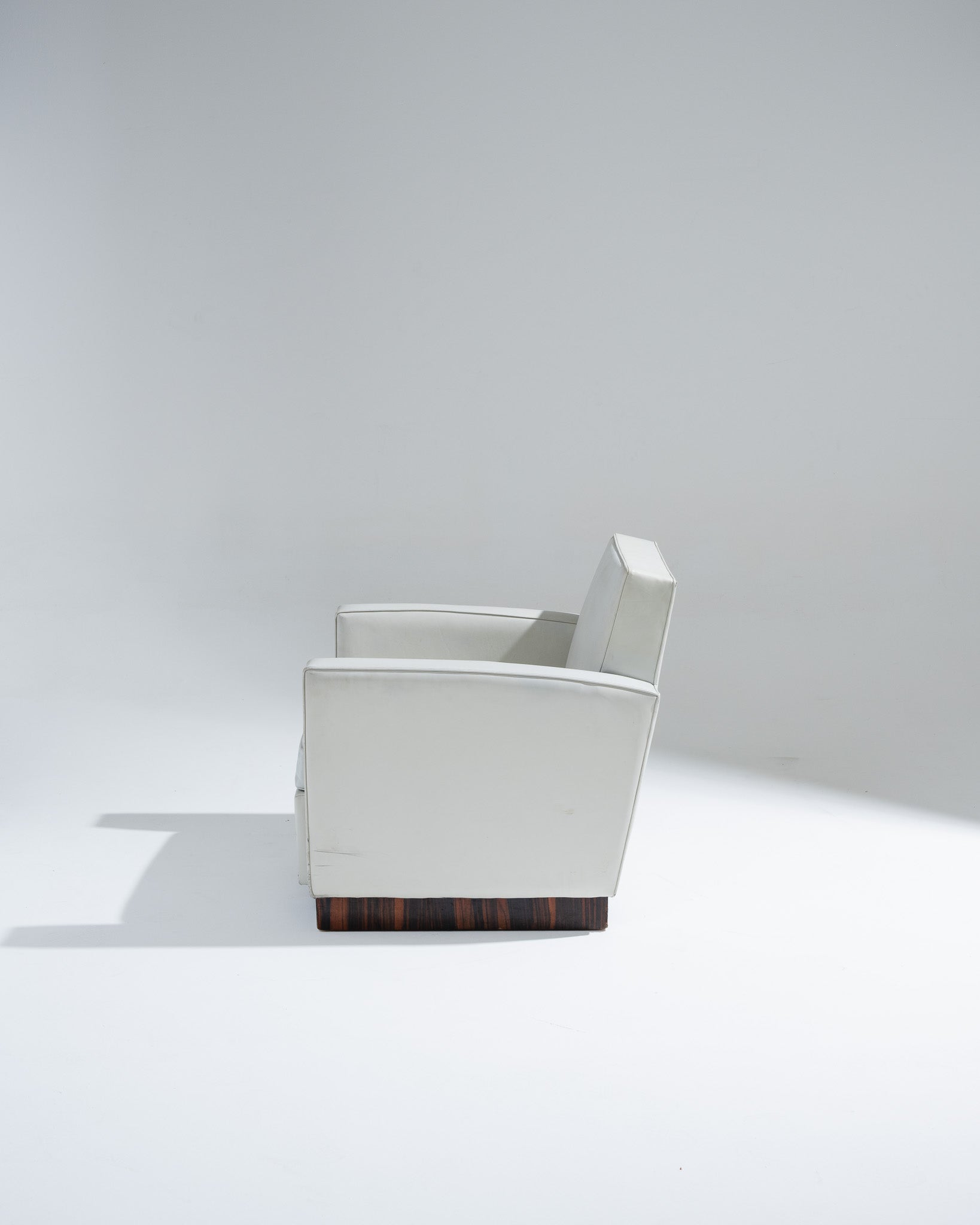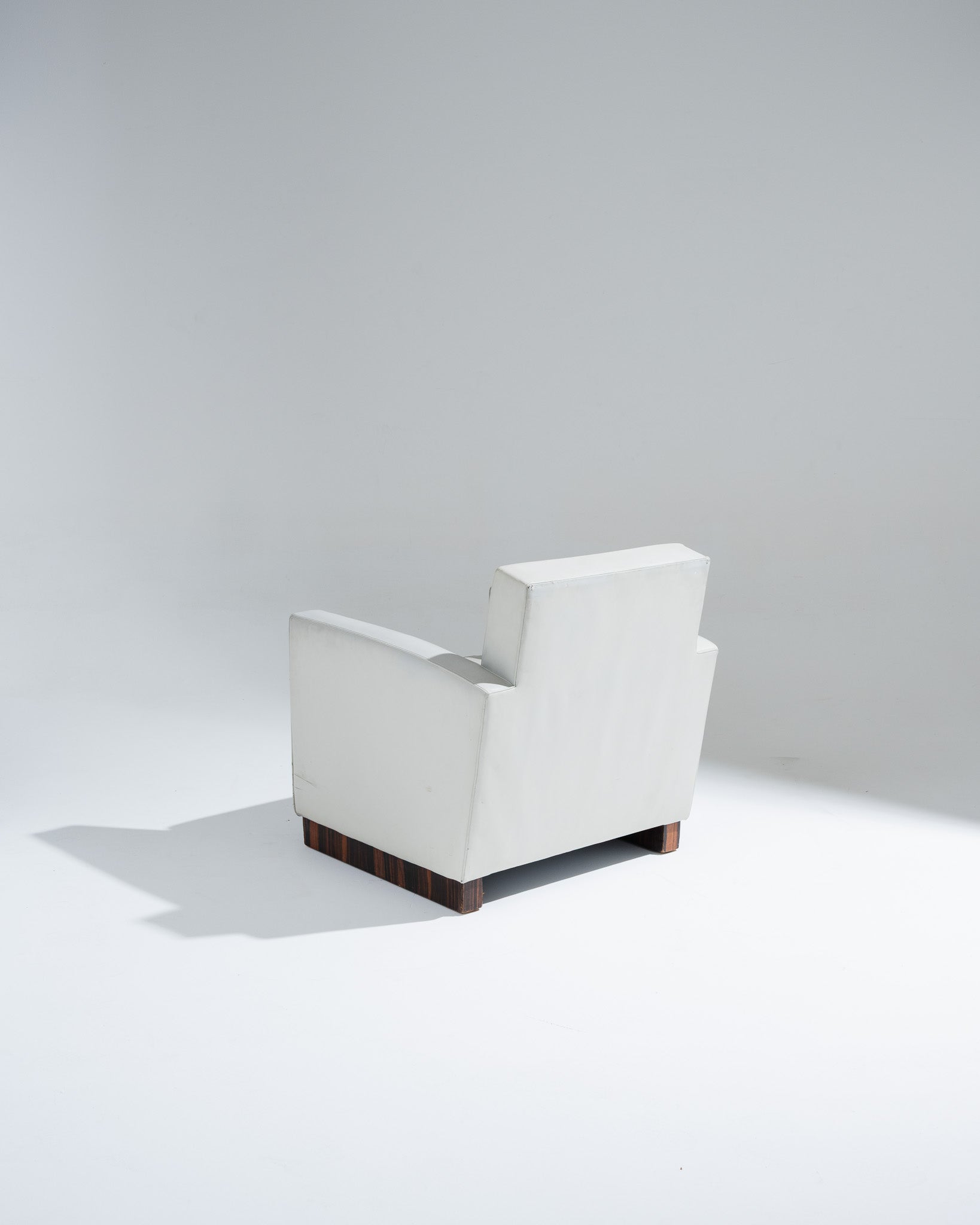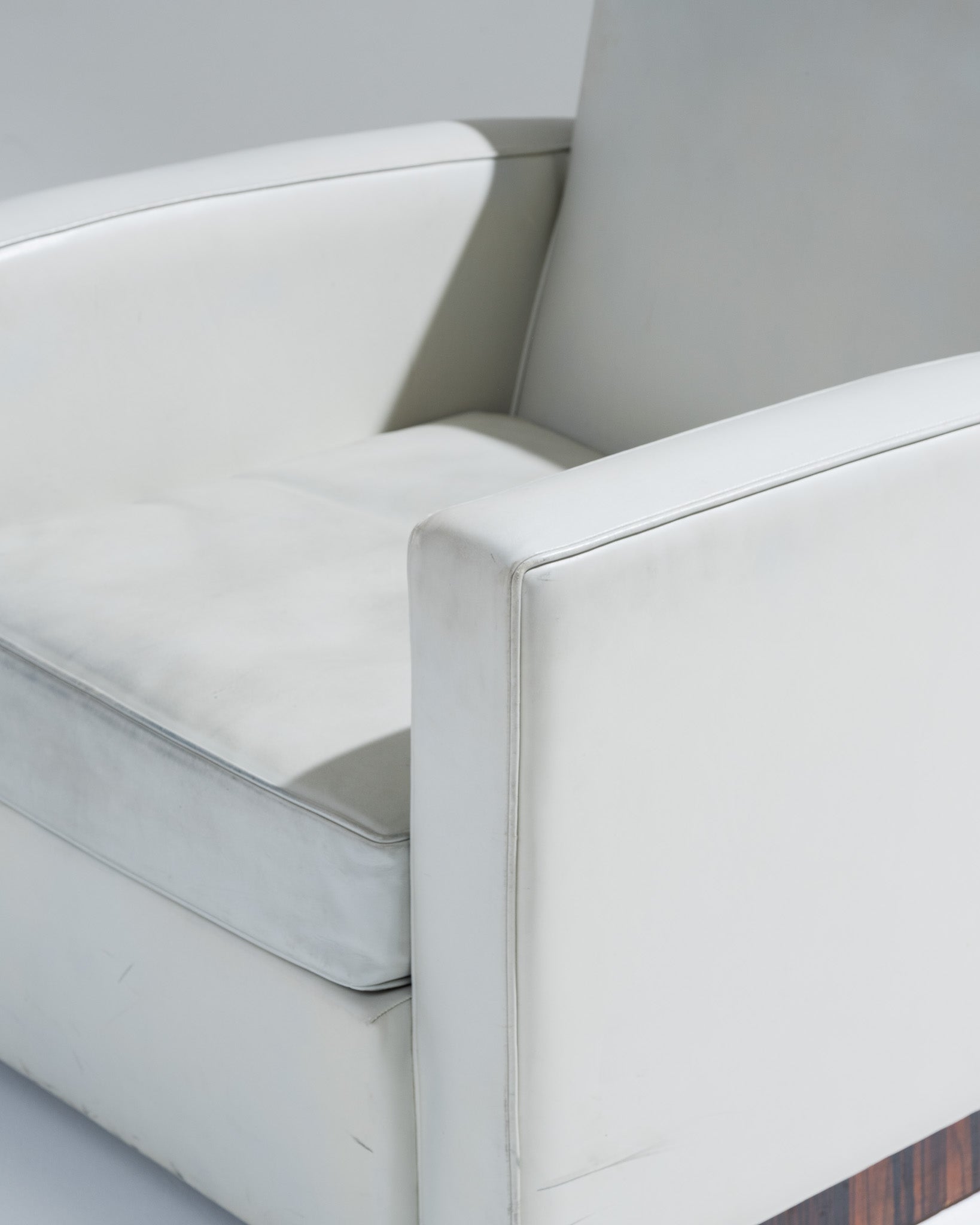 Fauteuil art déco recouverts d'un cuir gris clair, par l'architecte et designer français Jacques Adnet (1900-1984) dans les années 1930. Le dossier incliné est encadré par deux accotoirs. Le piètement plein est en plaquage de noyer. En bon état général malgré quelques altérations du cuir liées à l'usage et au temps.