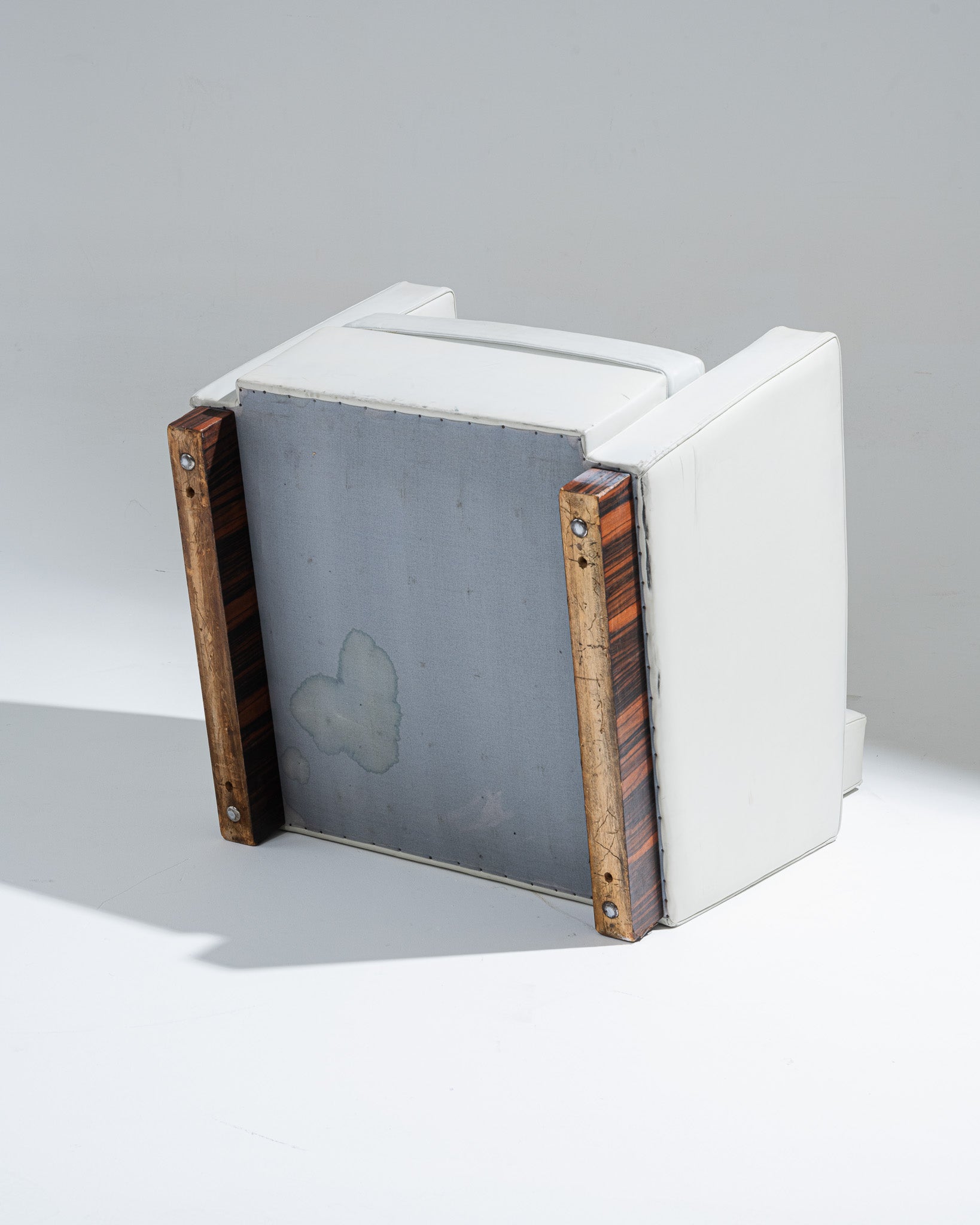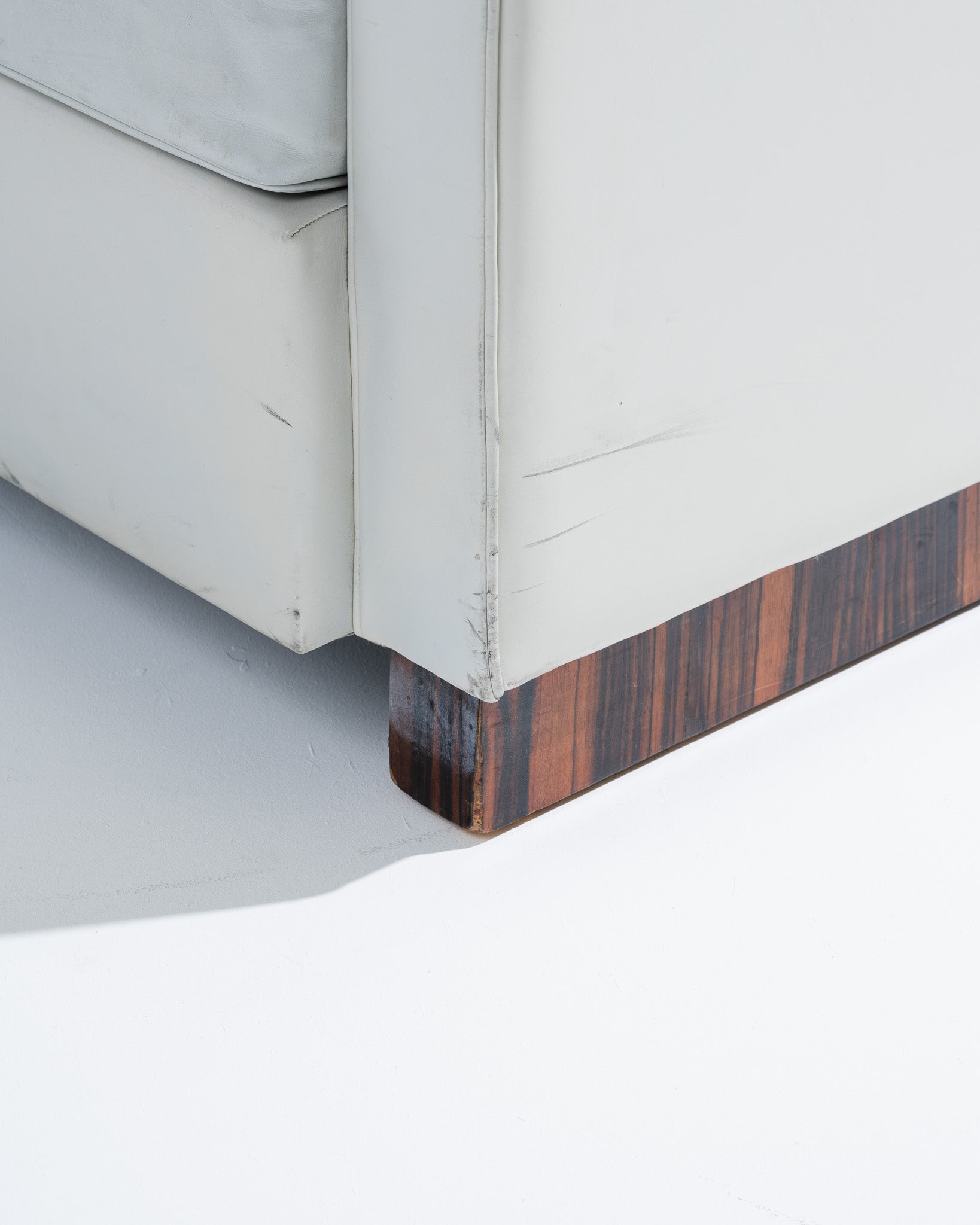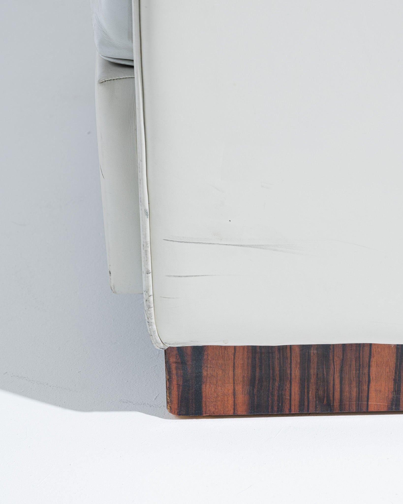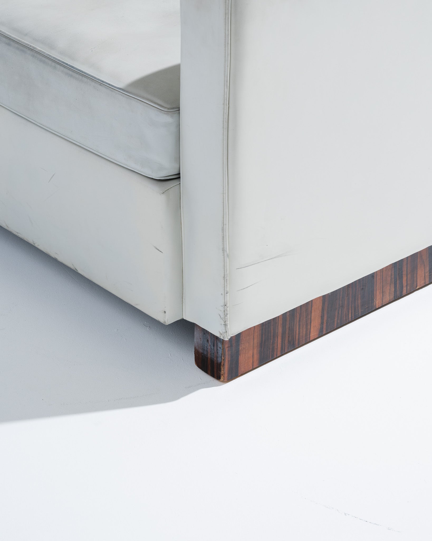 Fauteuil art déco recouverts d'un cuir gris clair, par l'architecte et designer français Jacques Adnet (1900-1984) dans les années 1930. Le dossier incliné est encadré par deux accotoirs. Le piètement plein est en plaquage de noyer. En bon état général malgré quelques altérations du cuir liées à l'usage et au temps.
