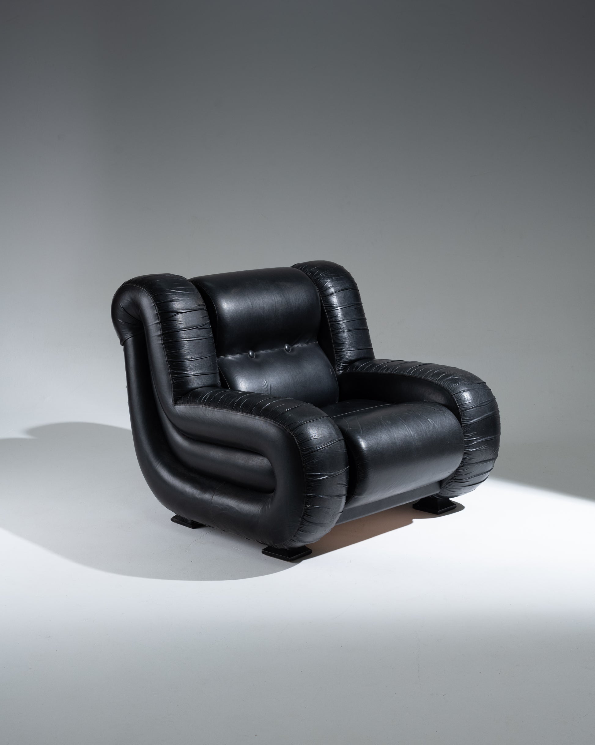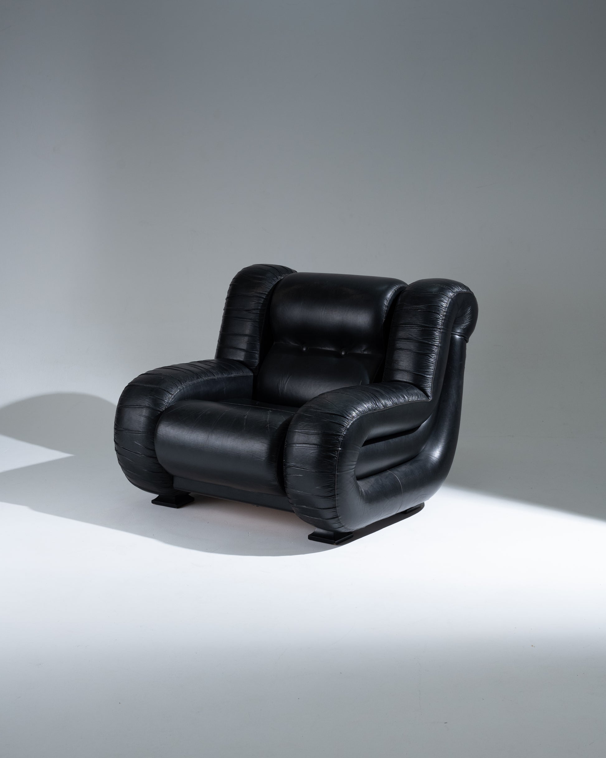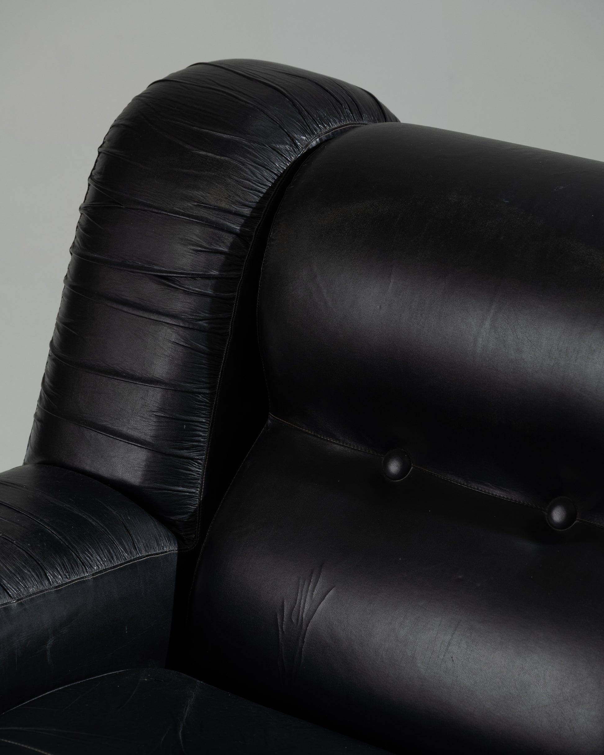 Fauteuil italien des années 1970 en cuir noir. Modèle au design volumineux de style bubble, avec assise profonde, accoudoirs larges et formes arrondies. Structure basse et proportions généreuses, typiques du design italien des années 1970. Le cuir présente une patine naturelle avec des traces d'âge et d'usage visibles (voir photos).