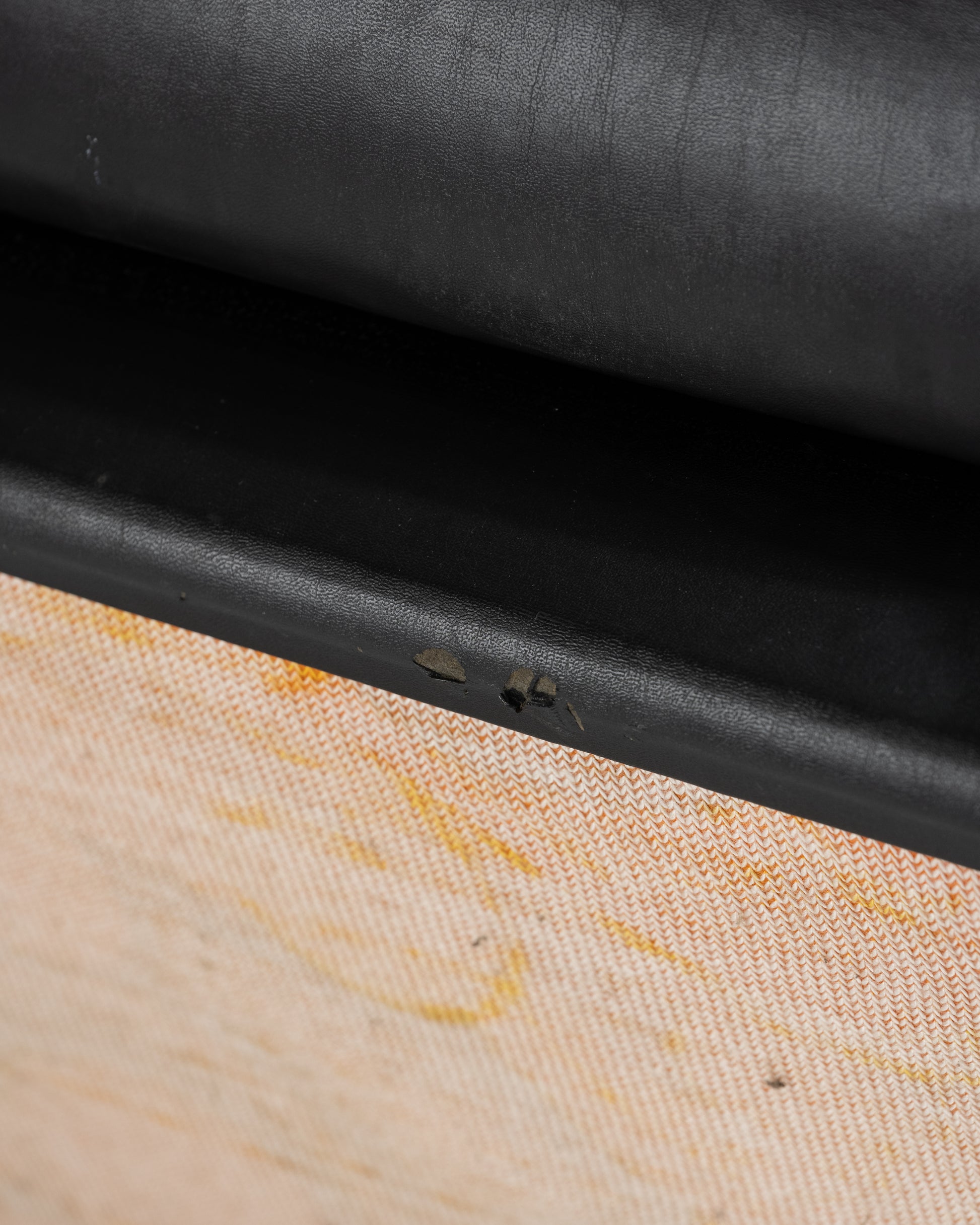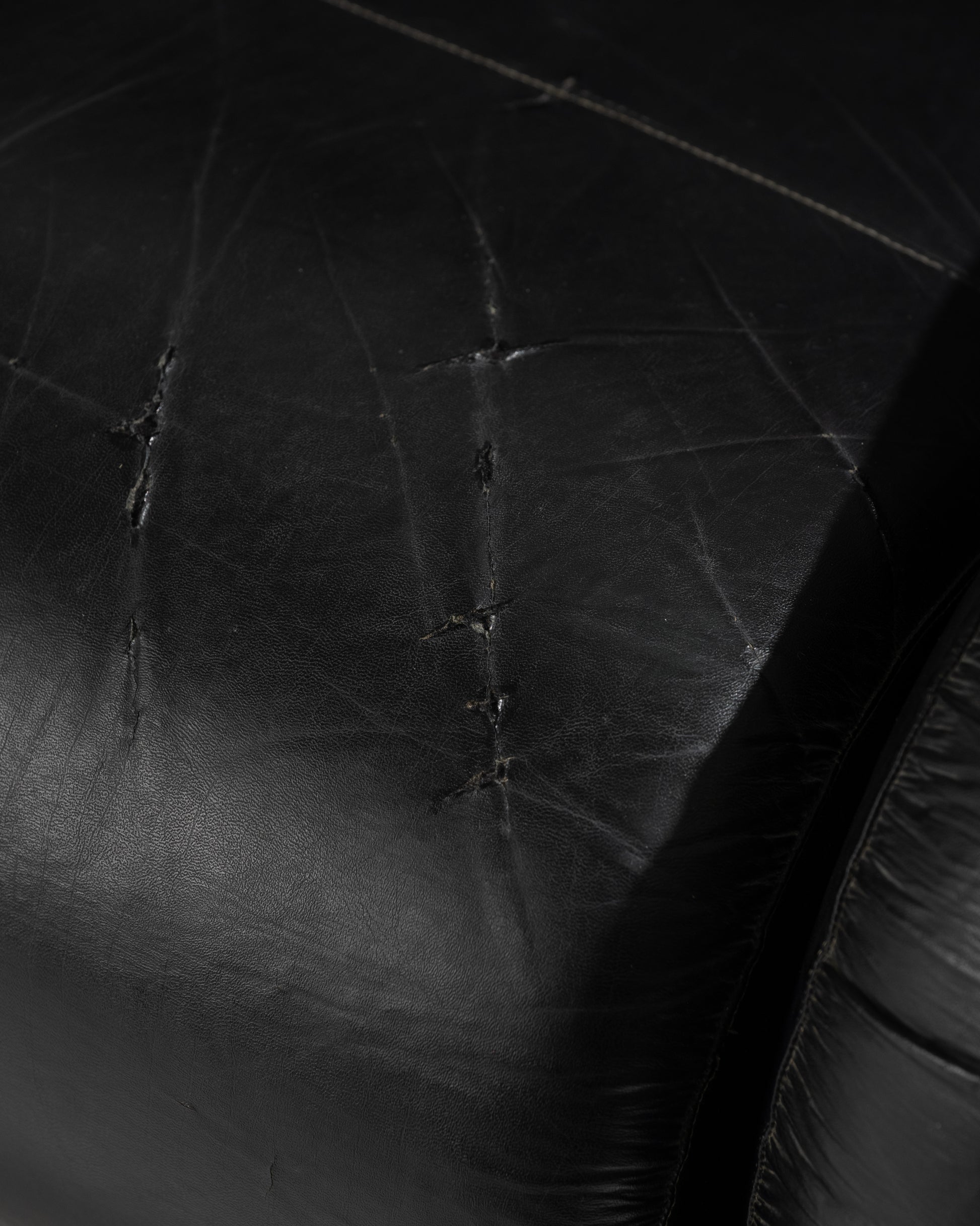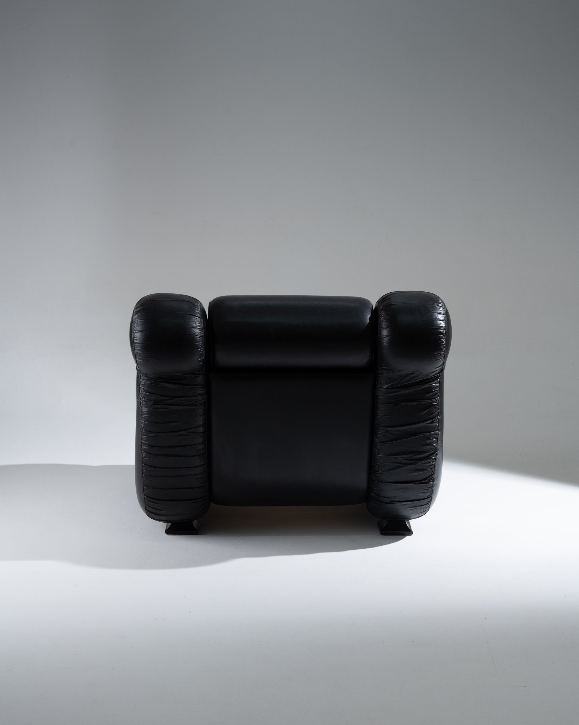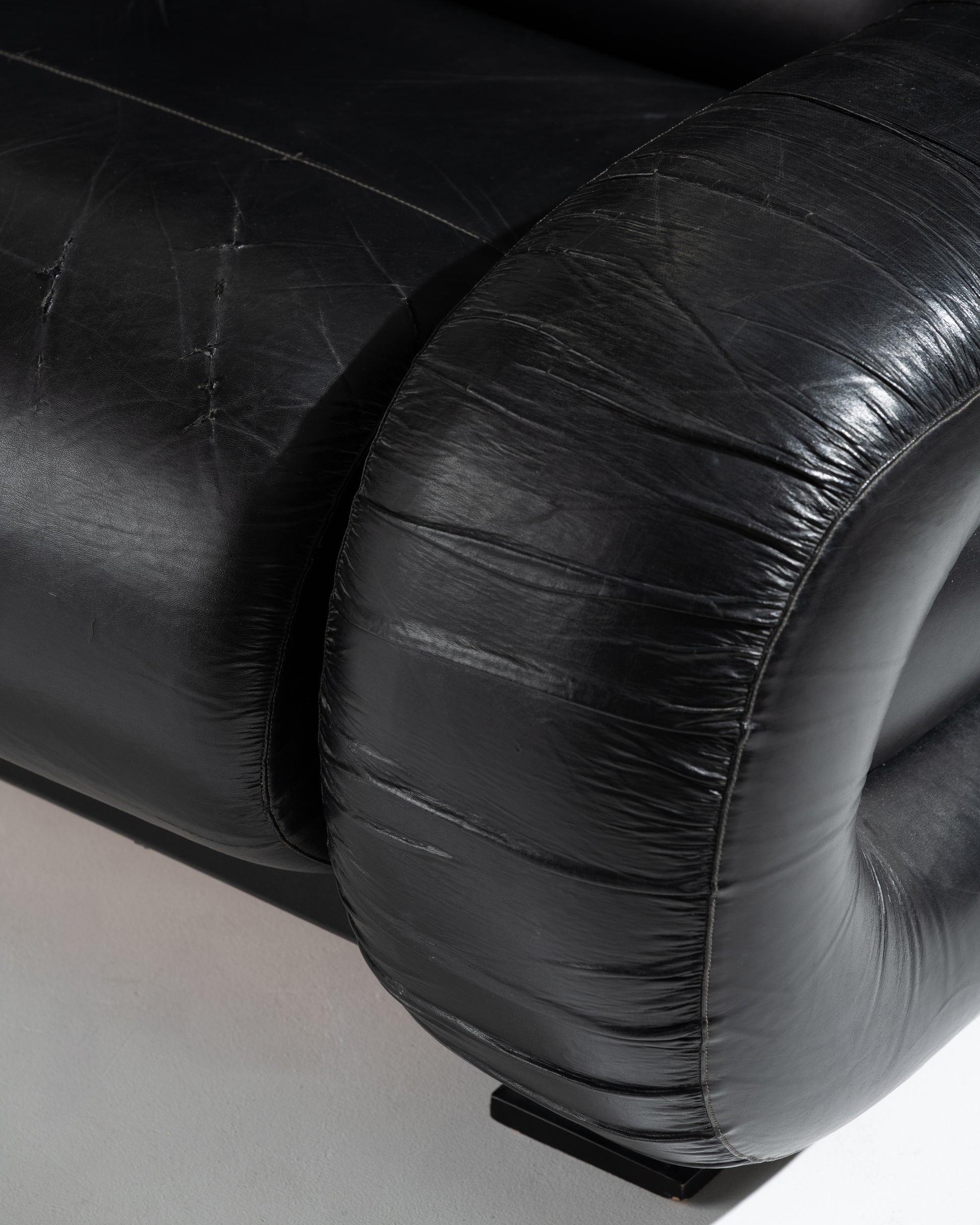 Fauteuil italien des années 1970 en cuir noir. Modèle au design volumineux de style bubble, avec assise profonde, accoudoirs larges et formes arrondies. Structure basse et proportions généreuses, typiques du design italien des années 1970. Le cuir présente une patine naturelle avec des traces d'âge et d'usage visibles (voir photos).