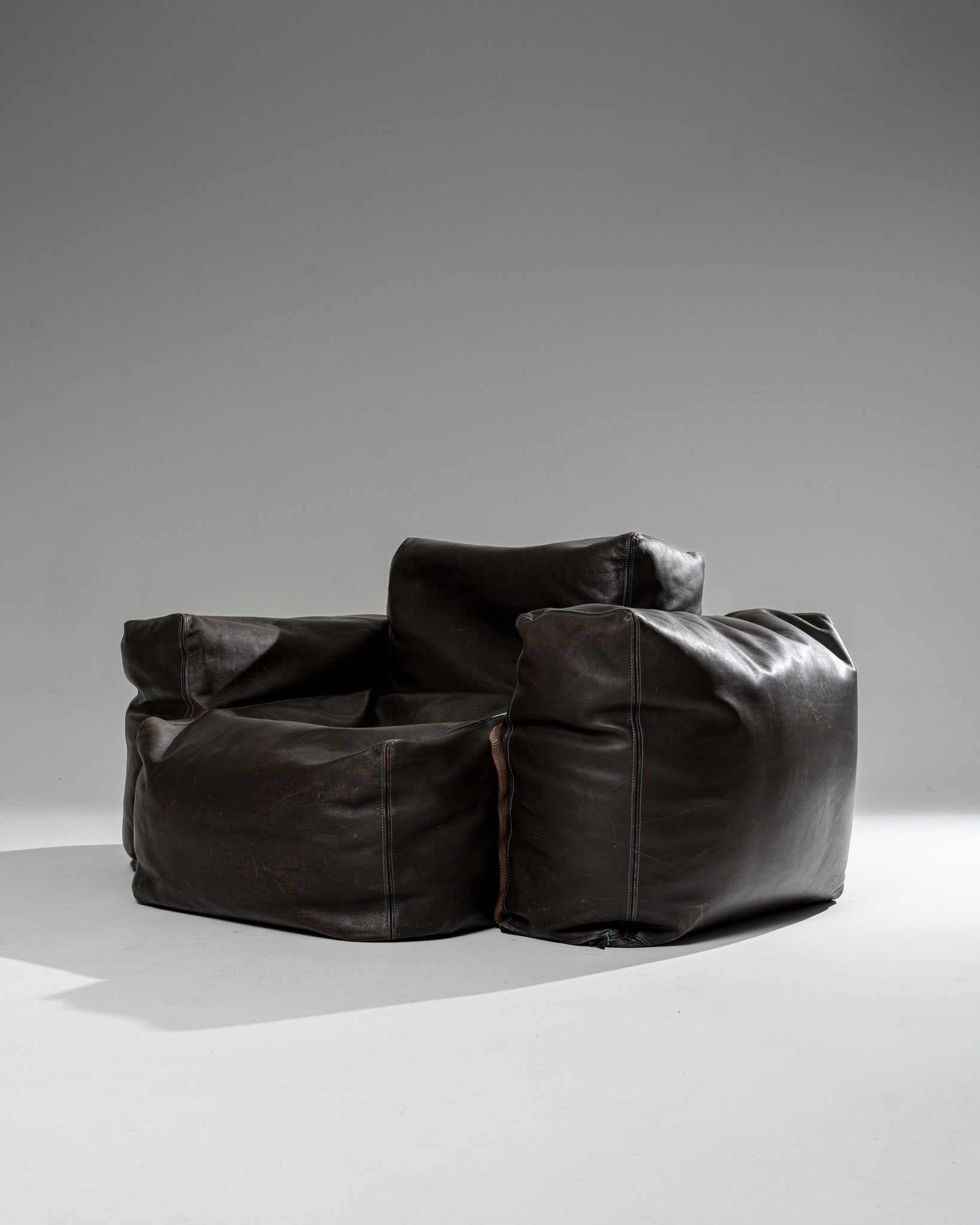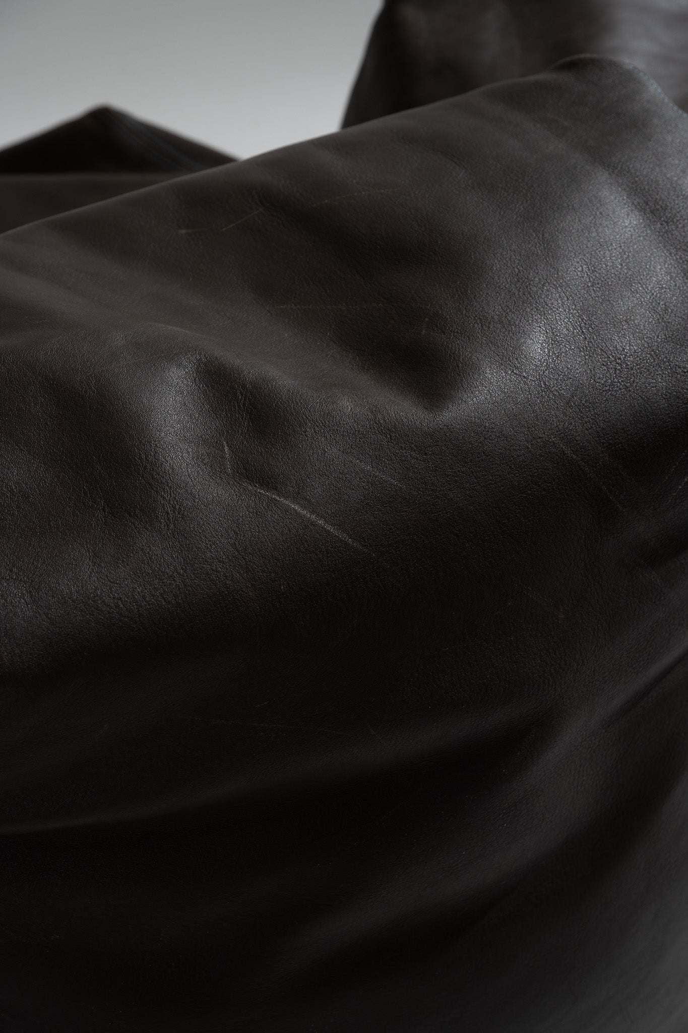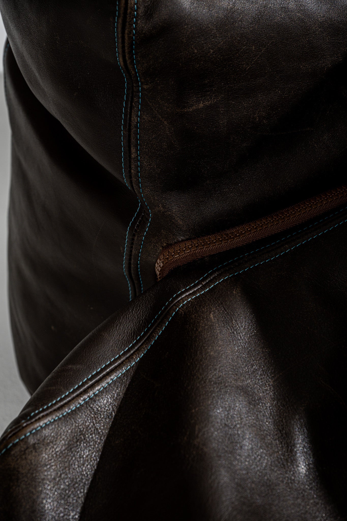 Fauteuil Oblong par Jasper Morrison pour Cappellini au début des années 2000. Structure composée de quatre éléments déhoussables reliés par fermetures éclair. Garnissage en coussins remplis de billes de polystyrène. Revêtement en cuir marron foncé (G2 - pelle extra 982) avec coutures apparentes bleu turquoise.