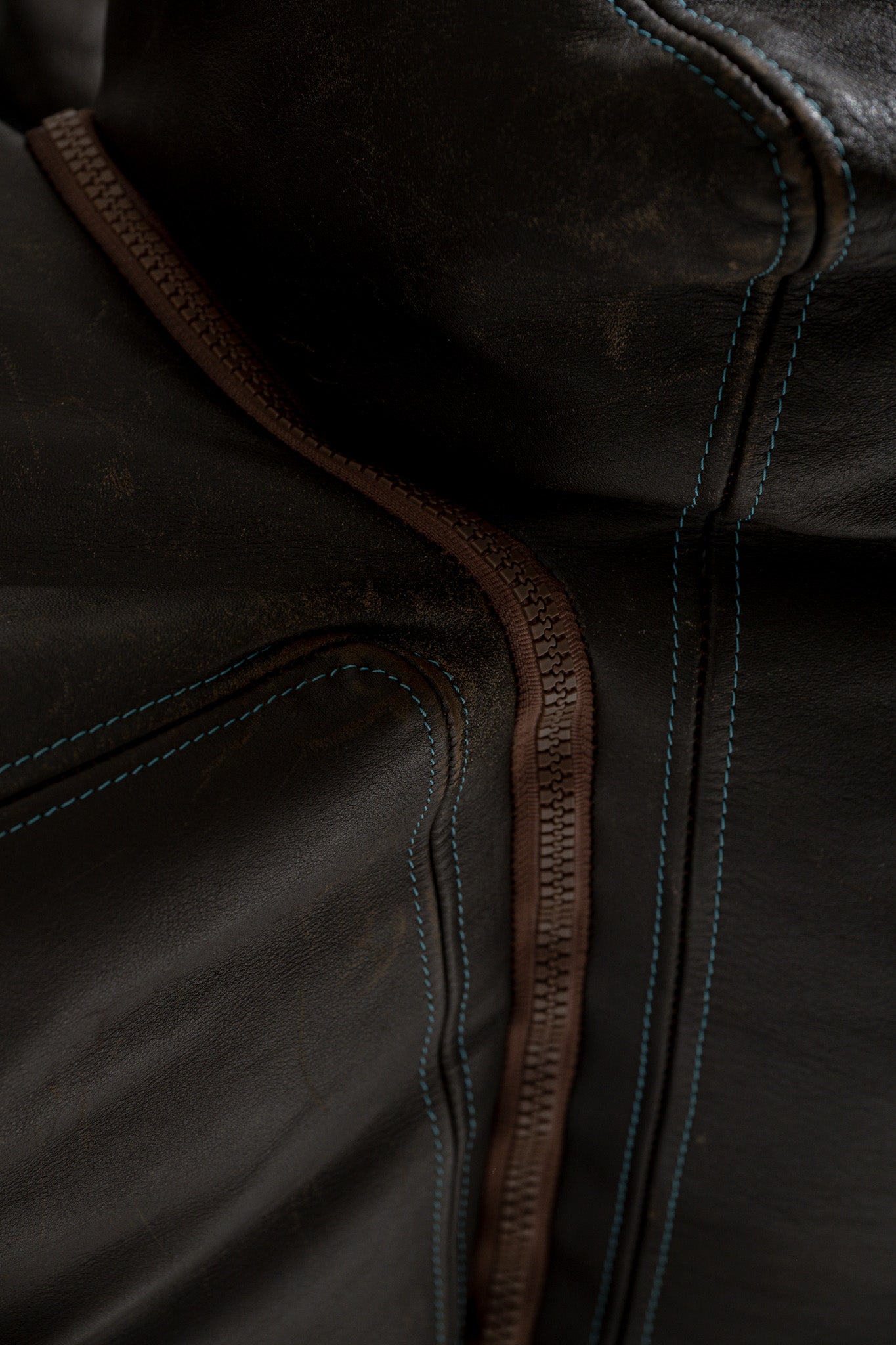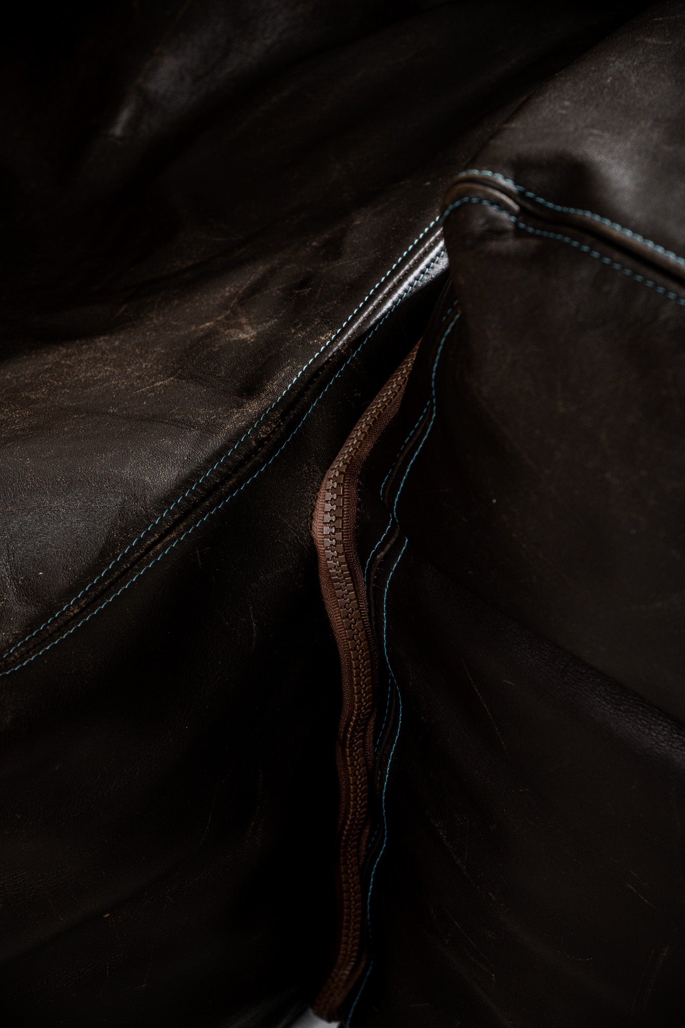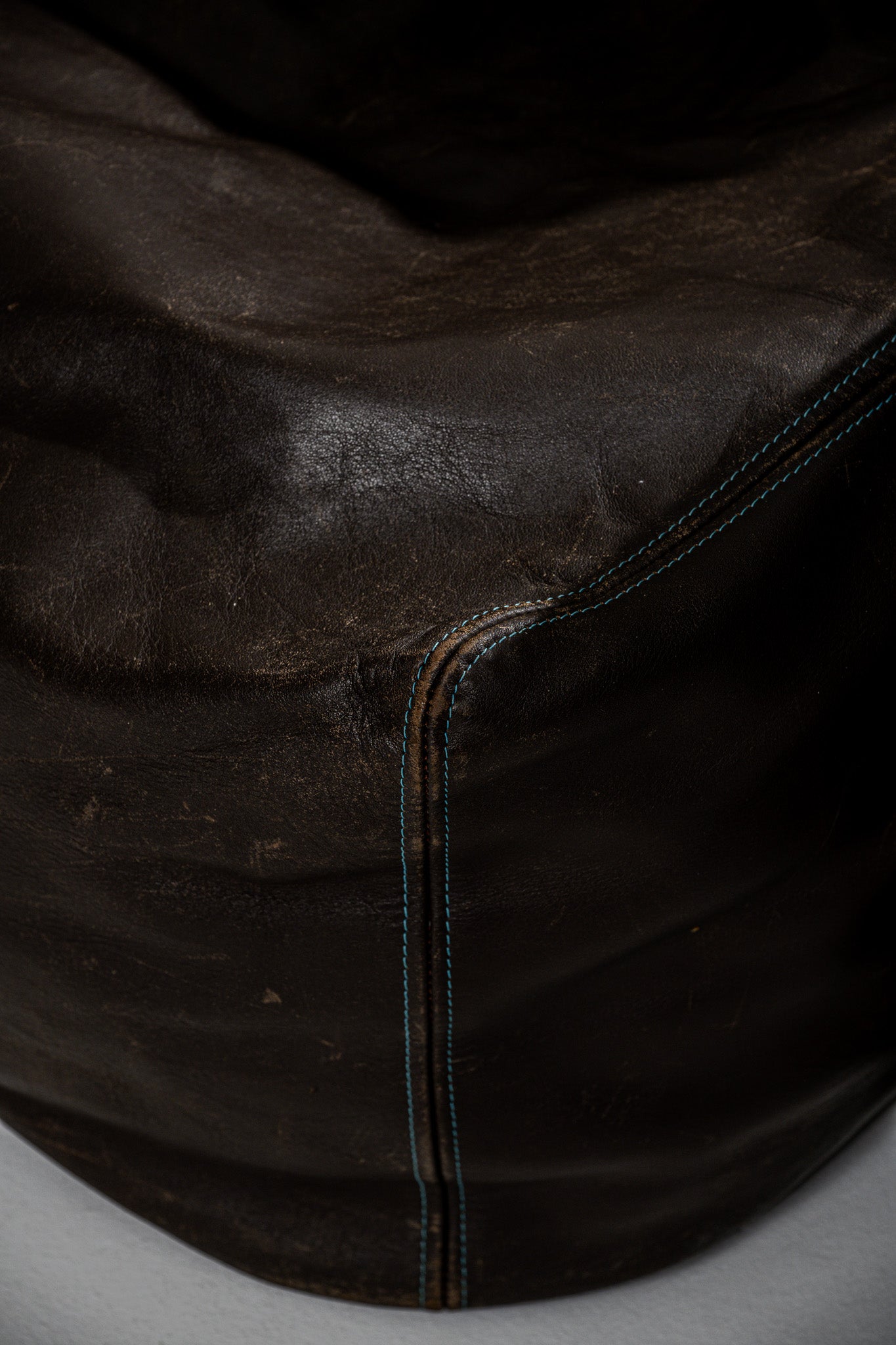 Fauteuil Oblong par Jasper Morrison pour Cappellini au début des années 2000. Structure composée de quatre éléments déhoussables reliés par fermetures éclair. Garnissage en coussins remplis de billes de polystyrène. Revêtement en cuir marron foncé (G2 - pelle extra 982) avec coutures apparentes bleu turquoise.