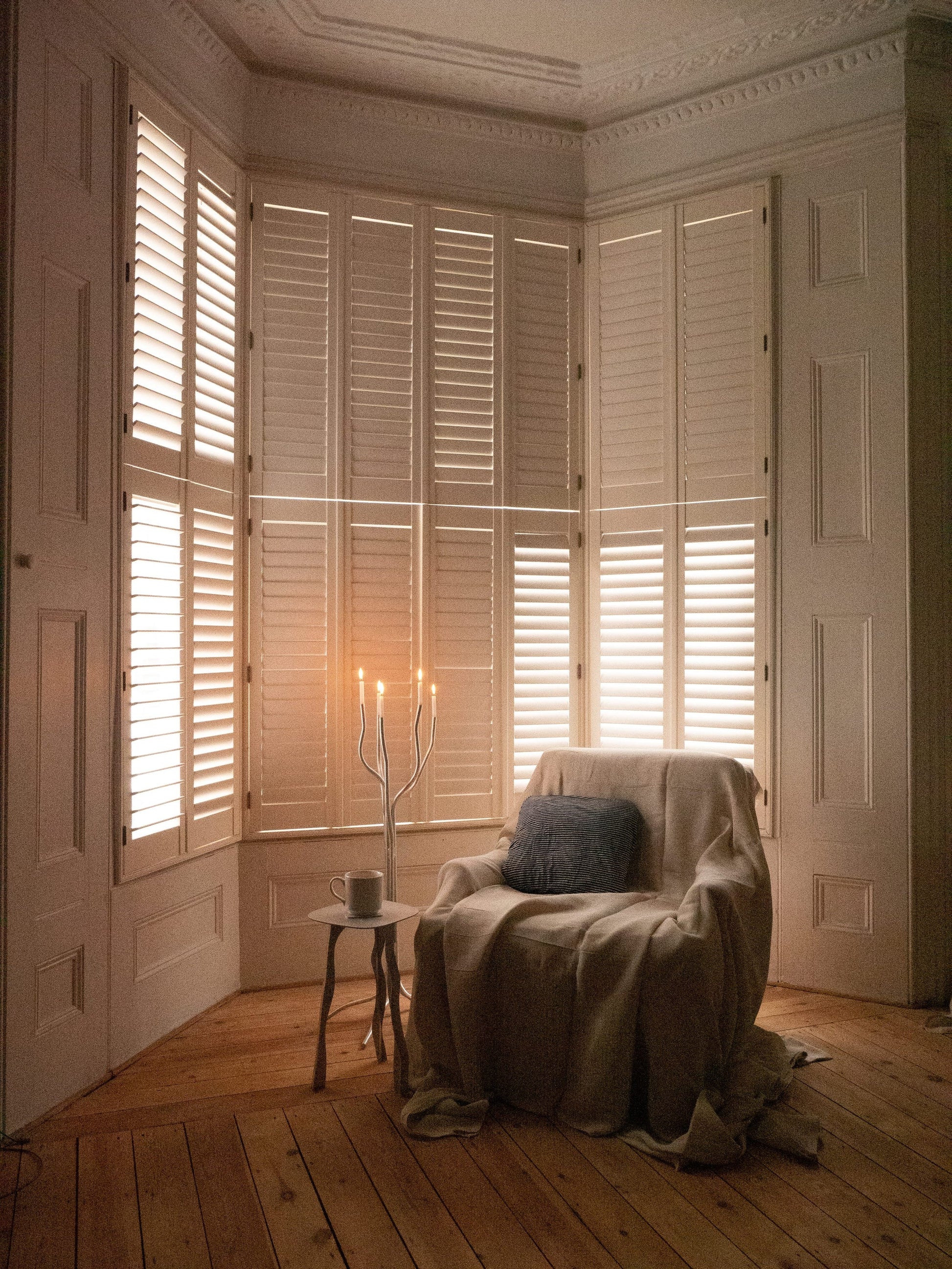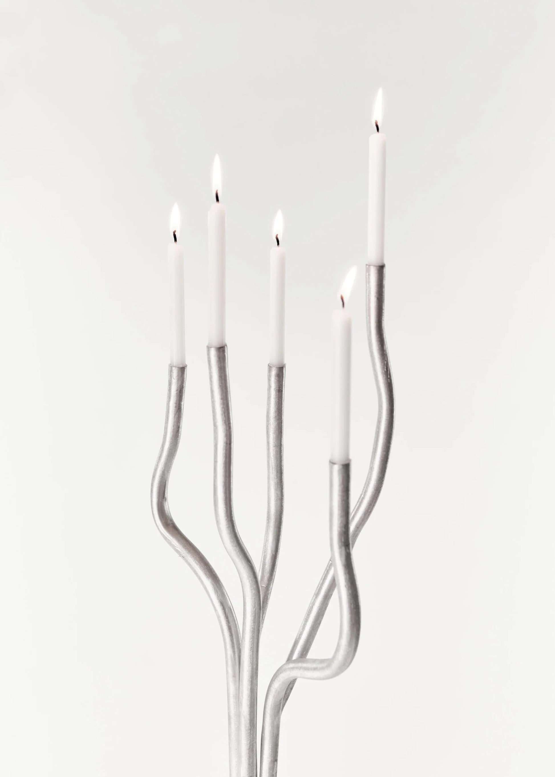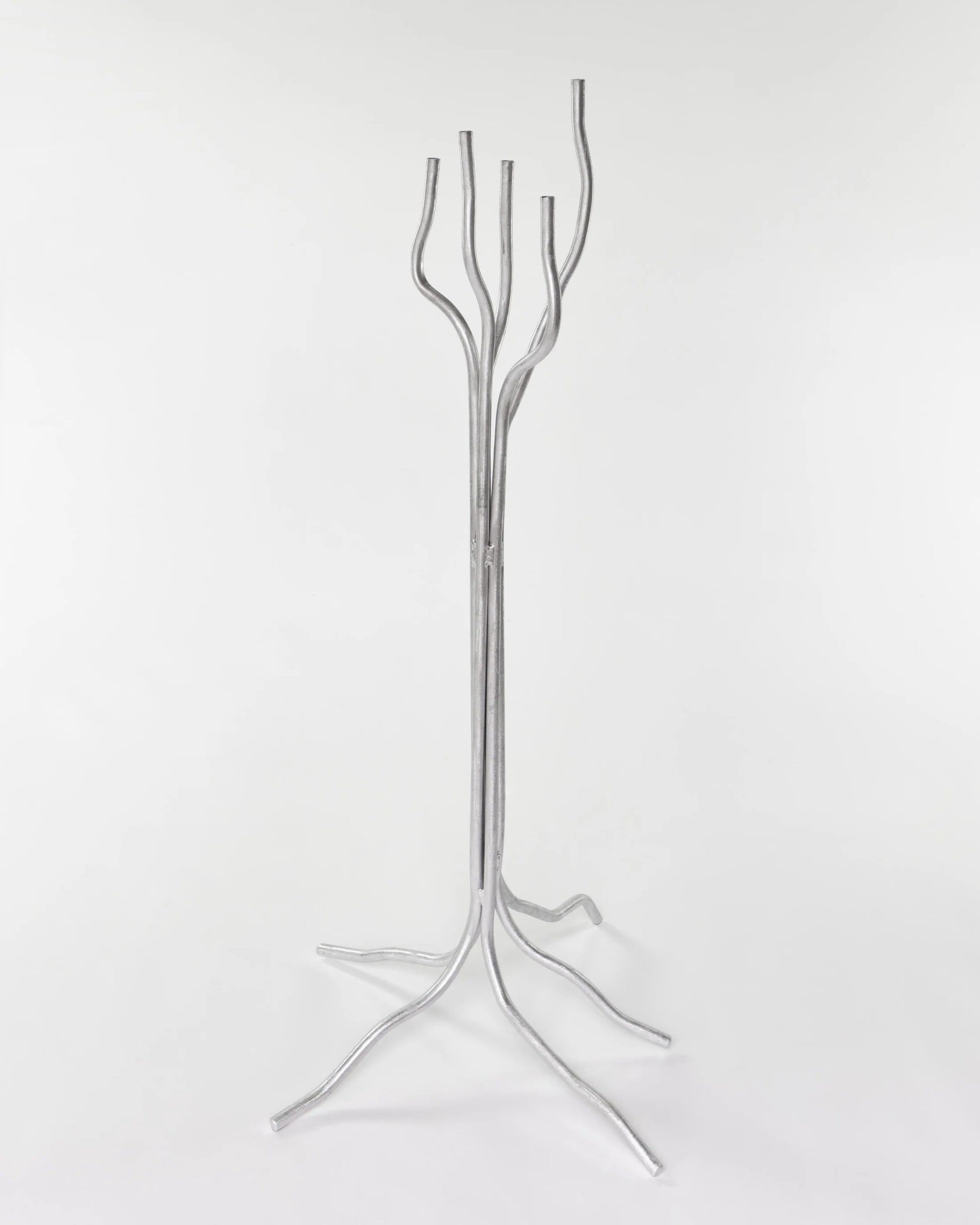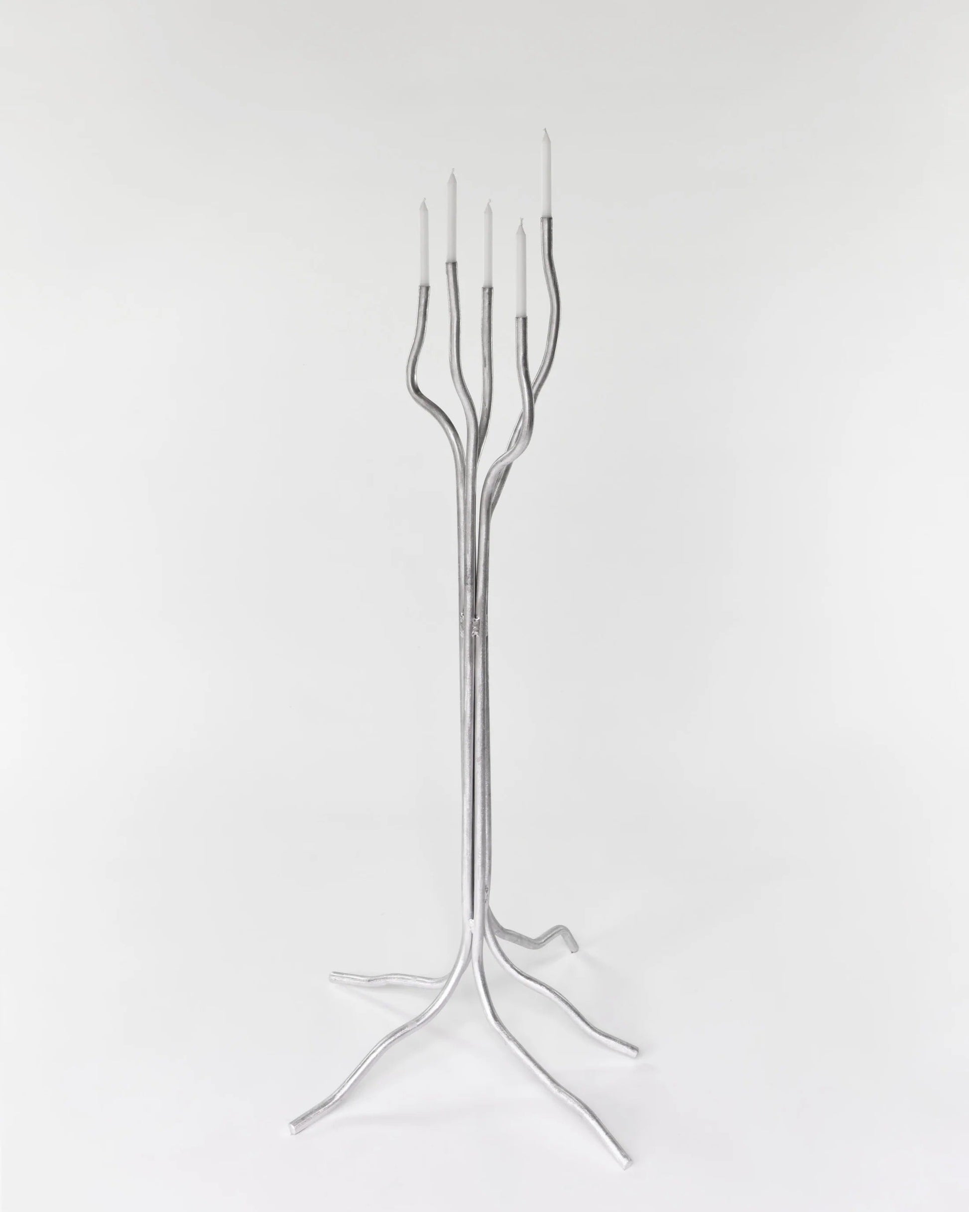 Grand candélabre réalisé en aluminium brut, à la silhouette élancée et minimaliste. Sa forme architecturale permet une intégration aussi bien dans un espace contemporain que dans un intérieur plus classique, où il devient un véritable point focal.